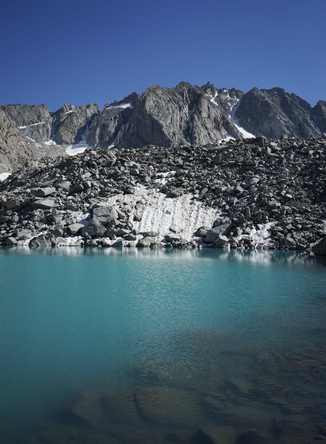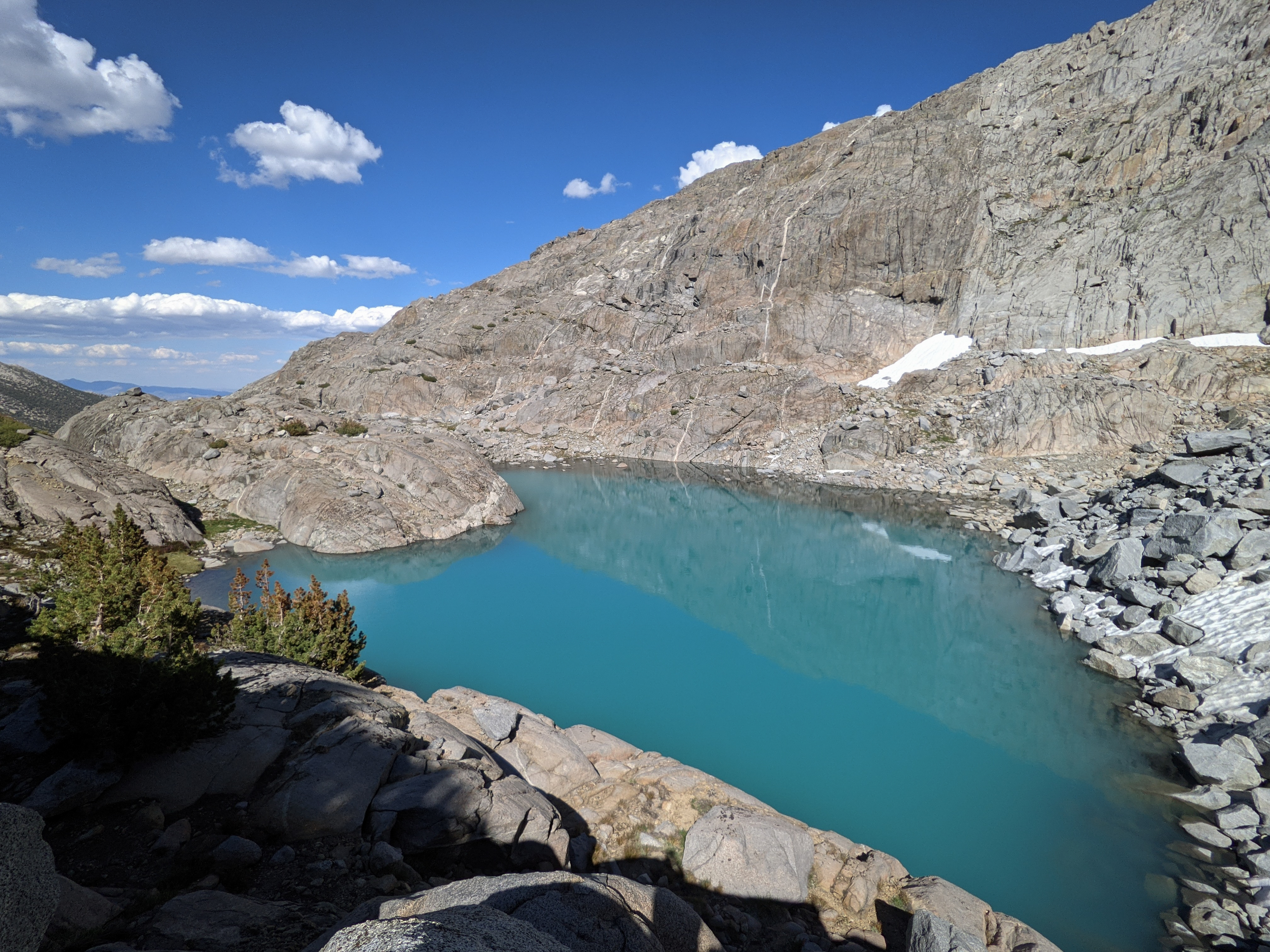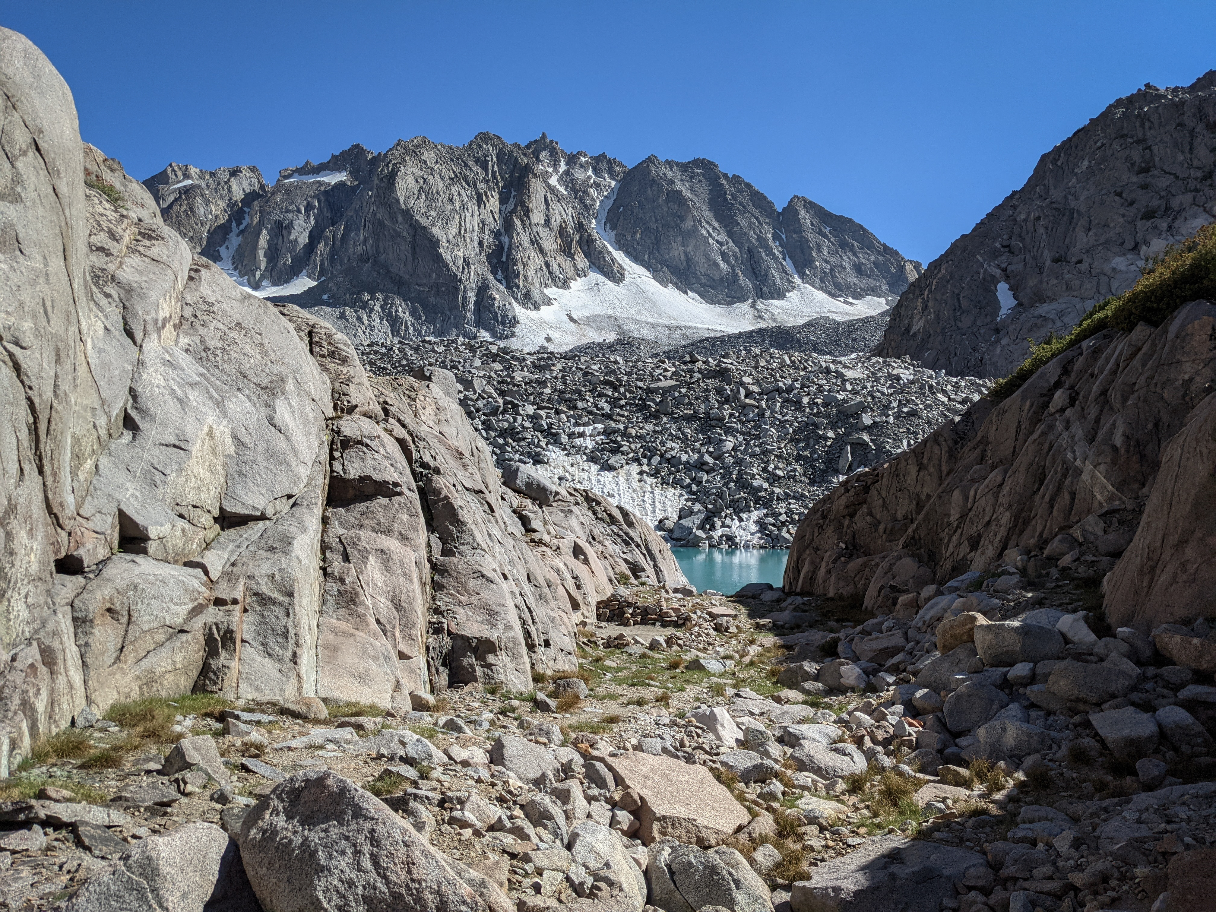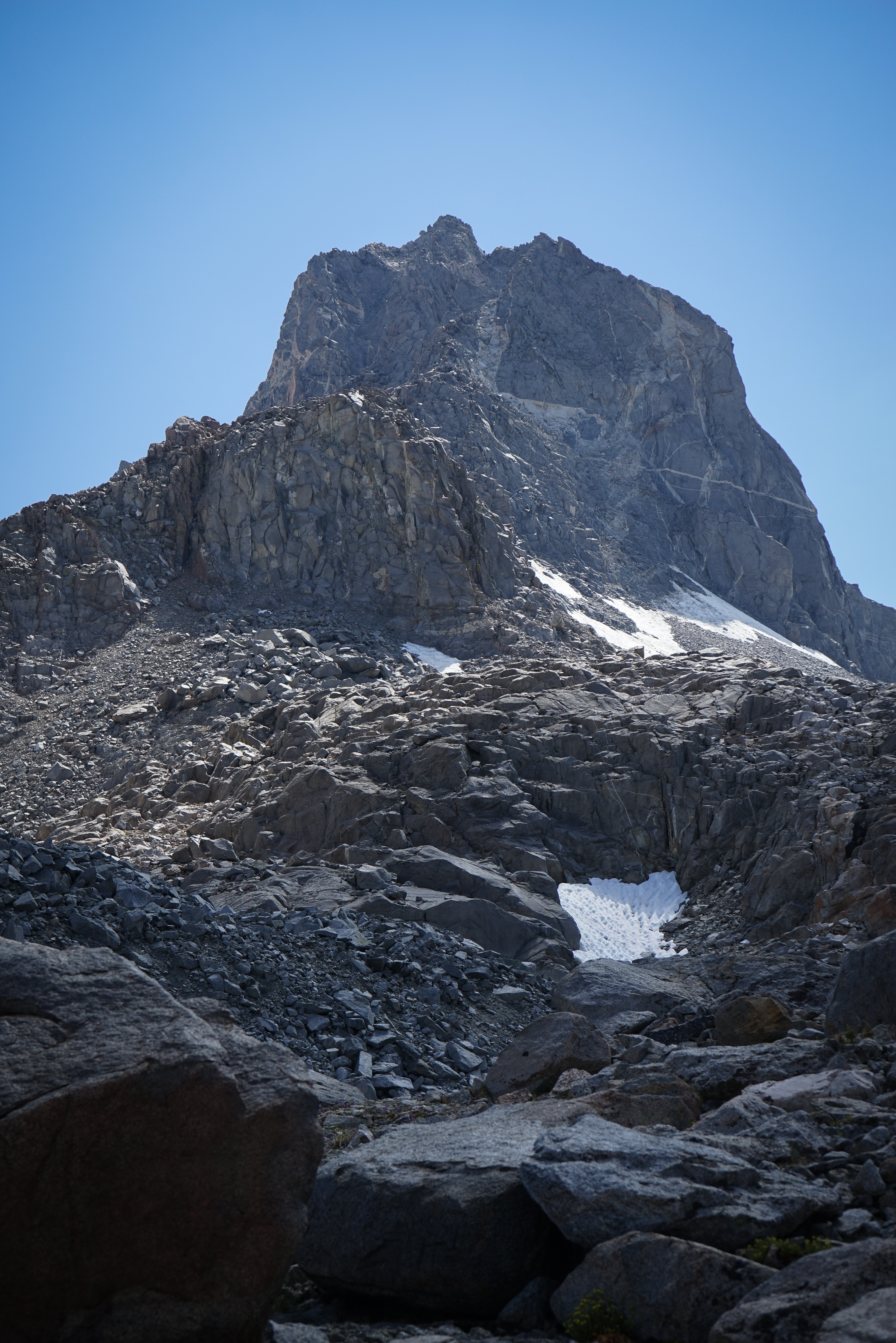 In Sam Mack Meadow, the trail crosses the creek and heads up into talus towards the much more popular Mount Sill and North Palisade. We followed the creek and climbed a talus-filled gully at the southwest end of the meadow towards the small lake just south of Sam Mack Lake.