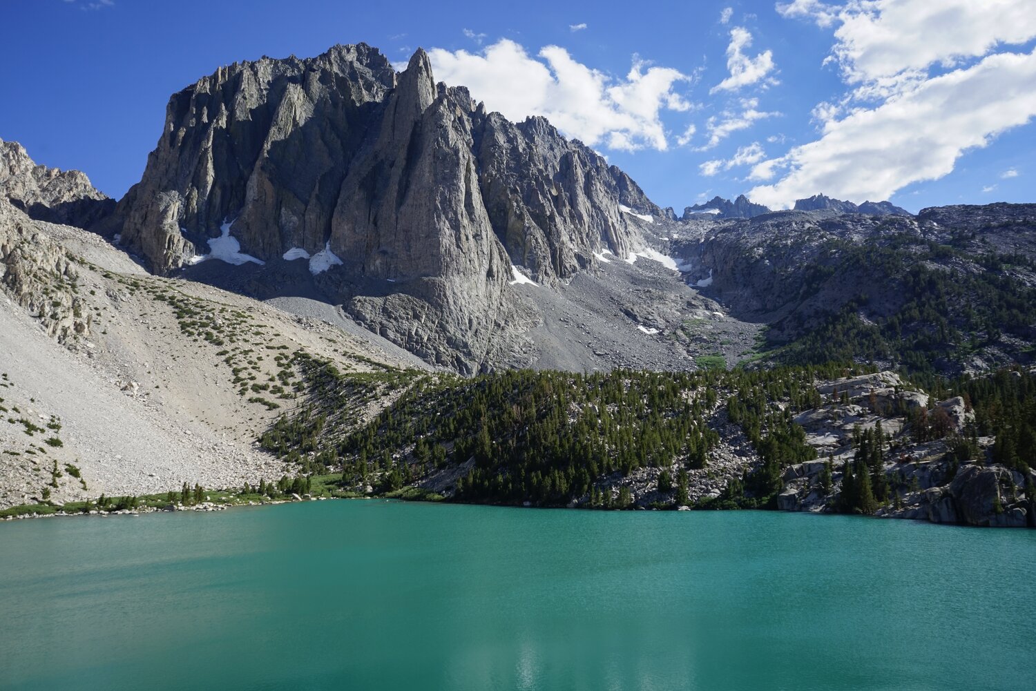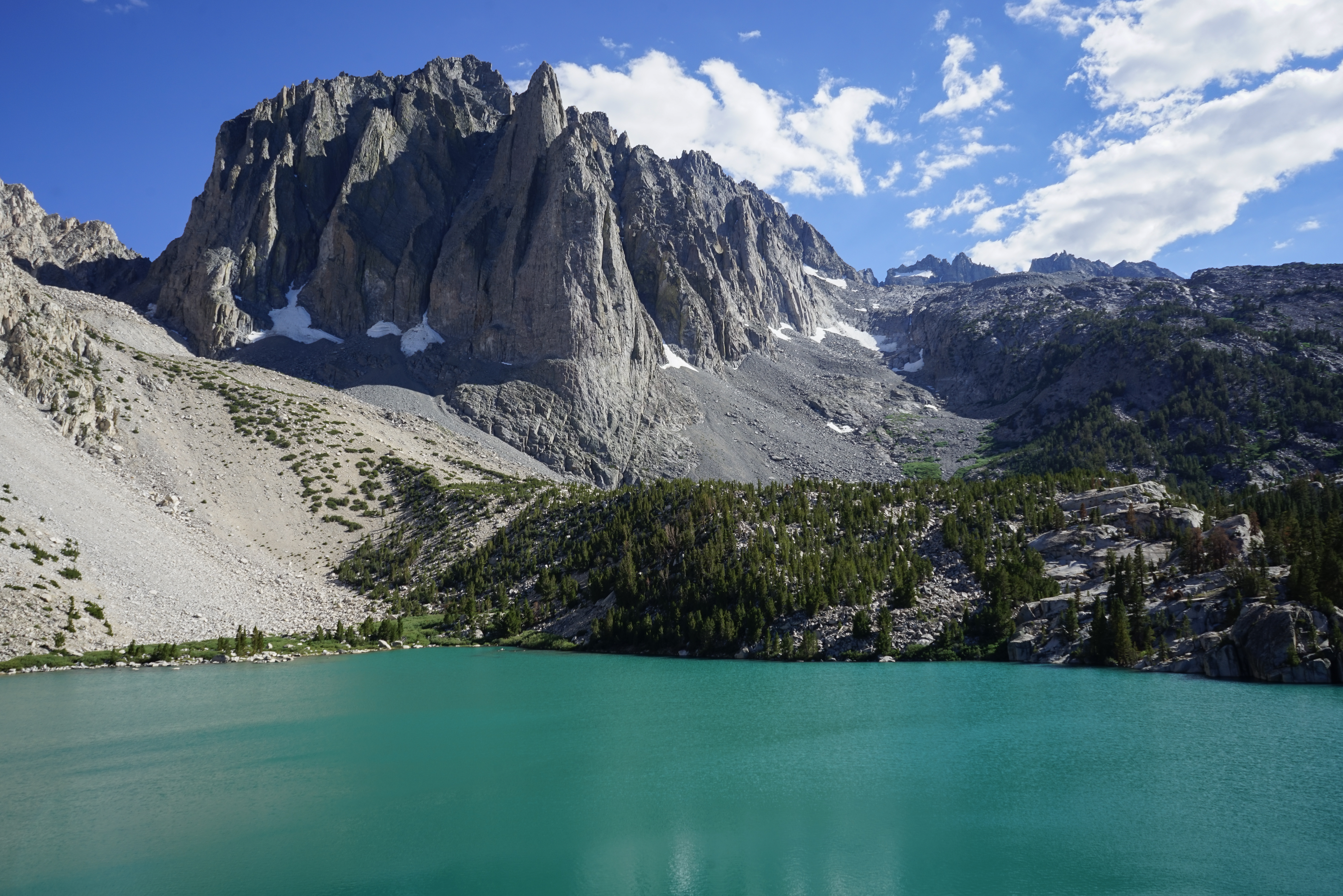 Mount Sill and Mount Gayley through the trees above Fifth Lake. Once at Fifth Lake again we had to cross a small talus field to rejoin the trail, where we headed down and stopped to refill water and have a rest at the lakeshore.