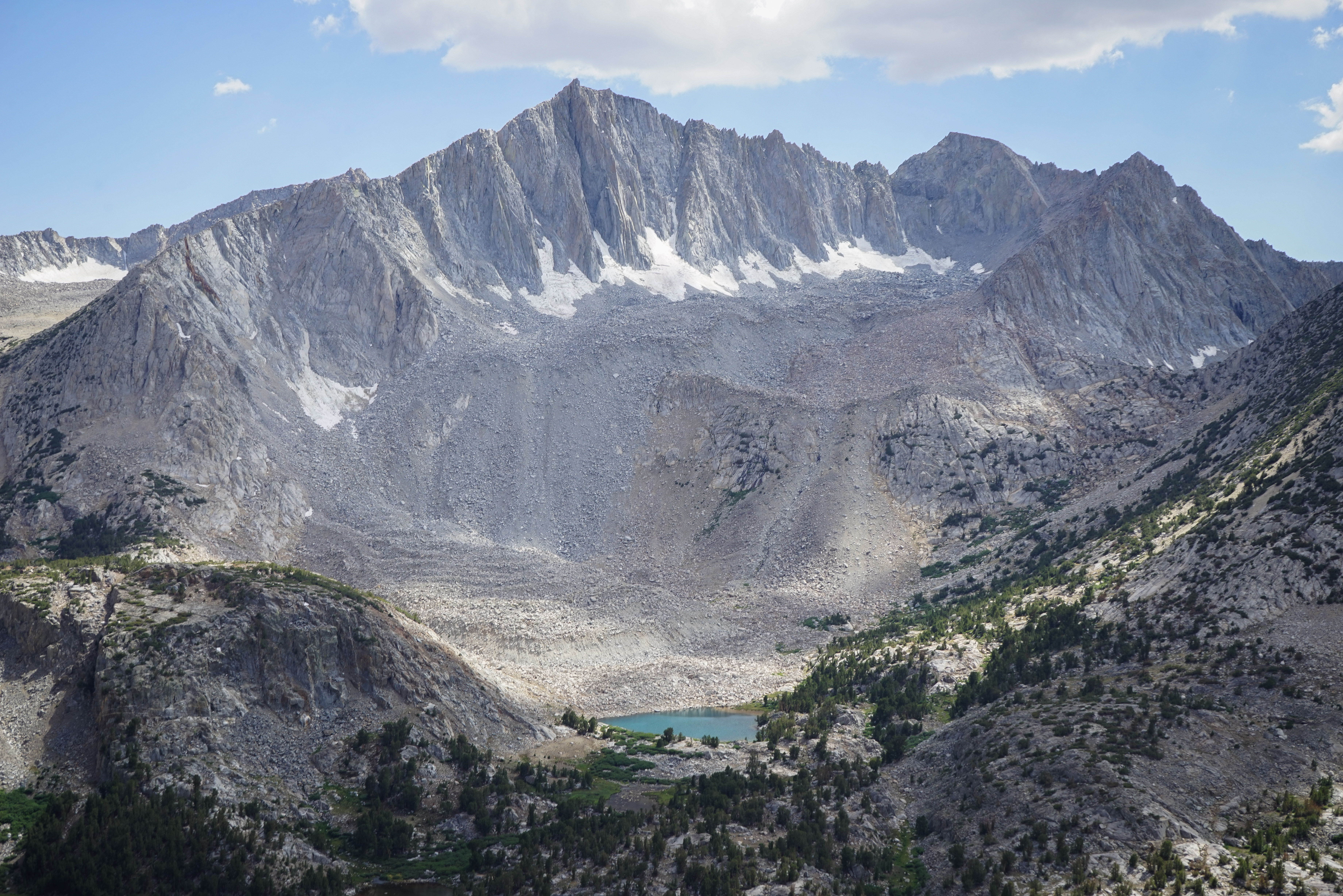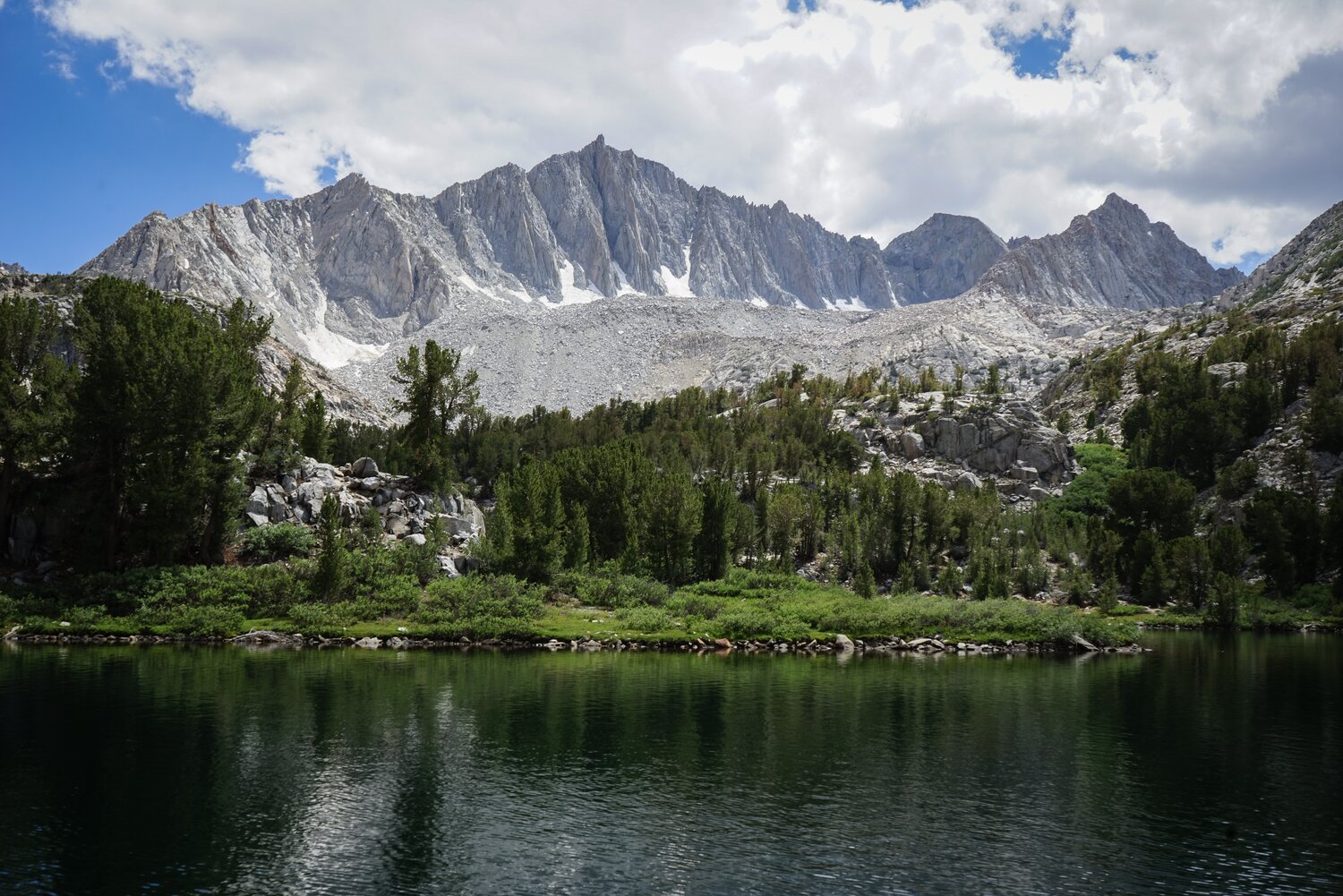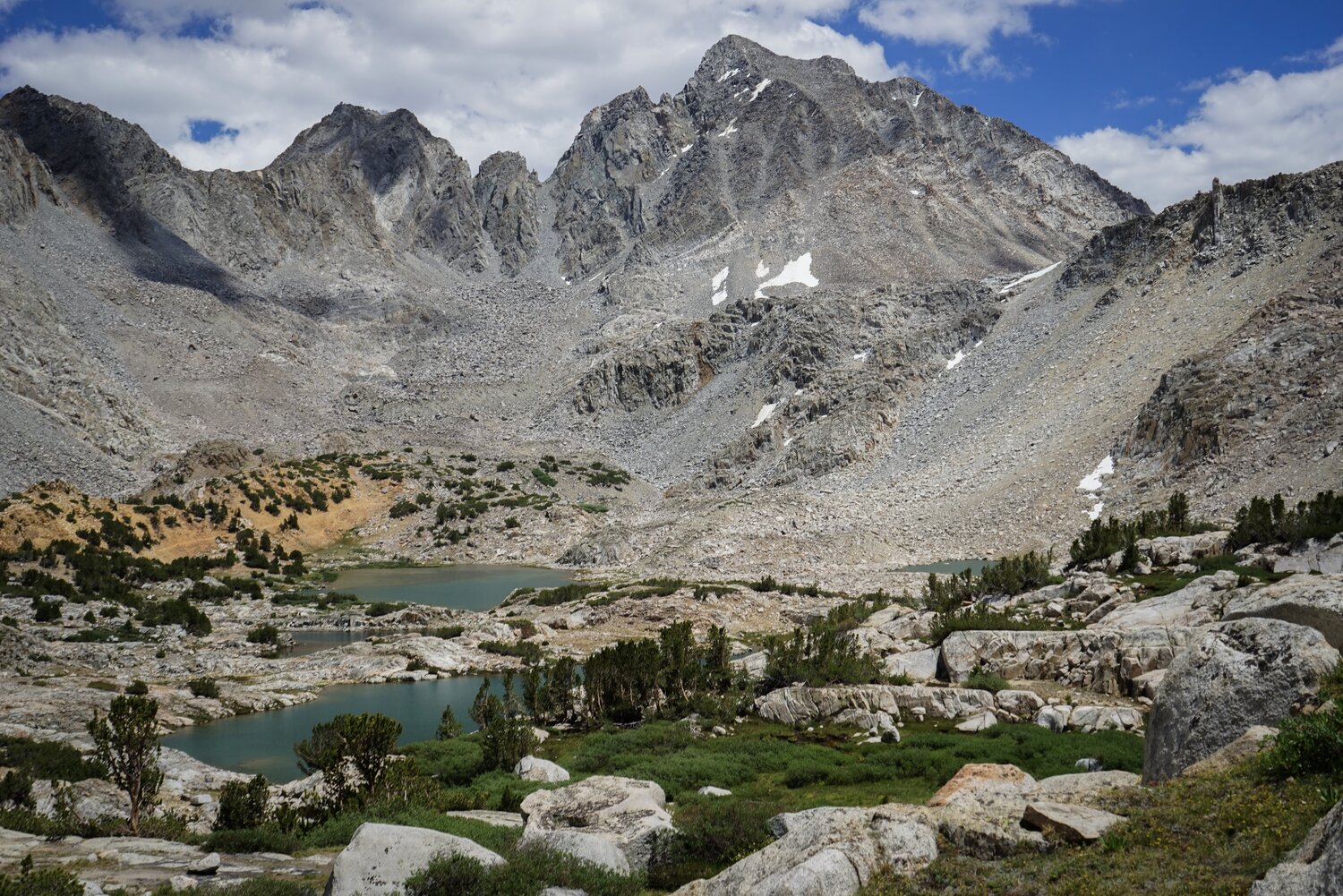 Mount Agassiz above Bishop Lake and Bishop Pass. Some clouds came in, but nothing too concerning. I took a slightly different route down, dropping lower to Saddlerock Lake and stopping to soak my feet for a bit before rejoining the trail.