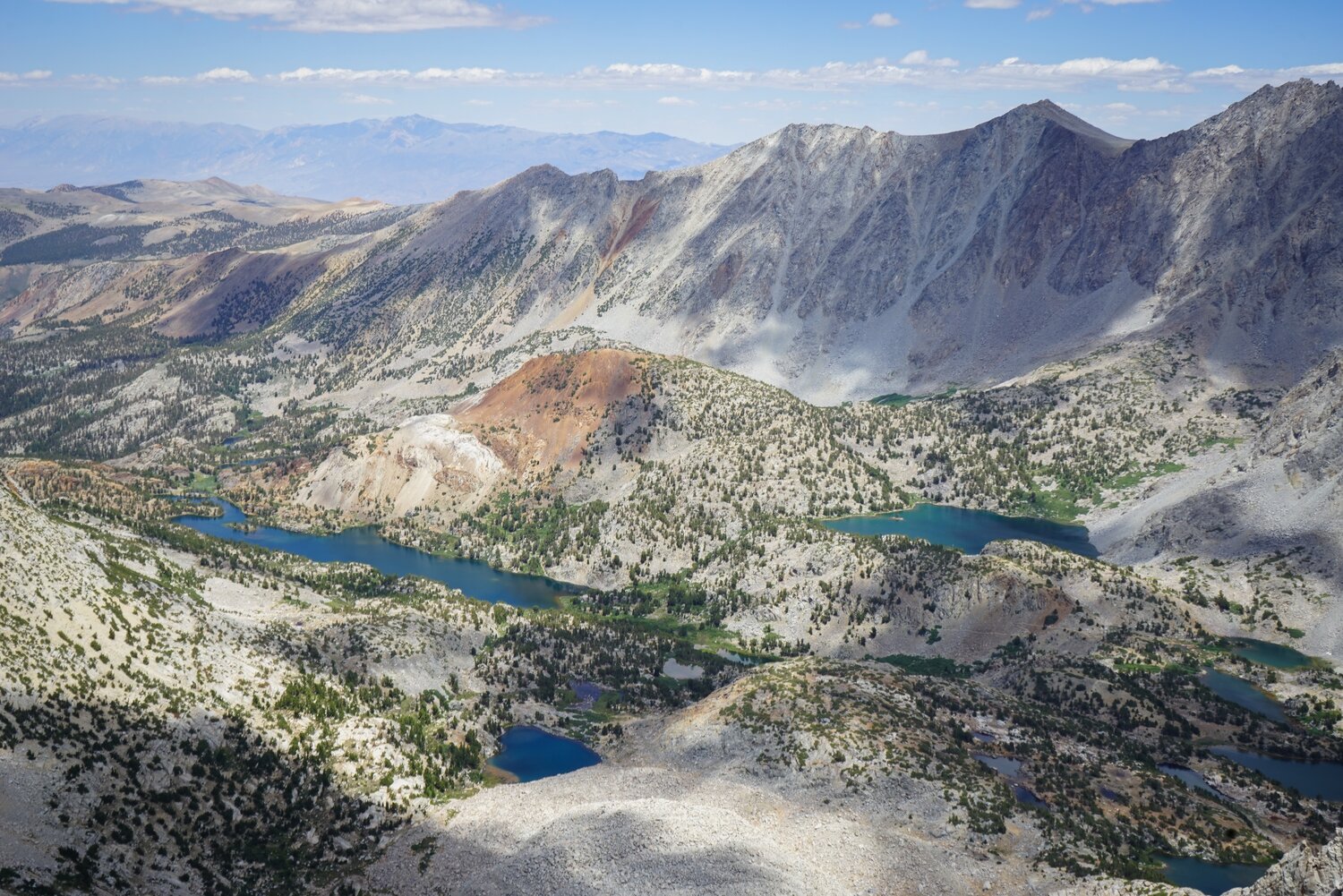 The lakes of Bishop Creek to the east, with Vagabond Peak above Ruwau Lake and a very small-seeming Chocolate Peak to its left.