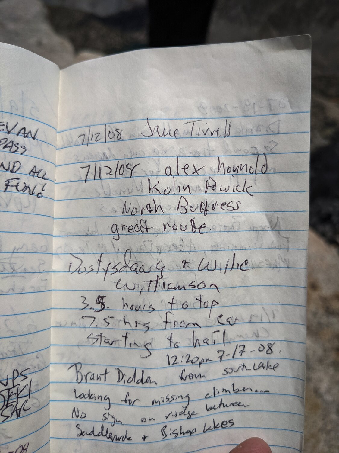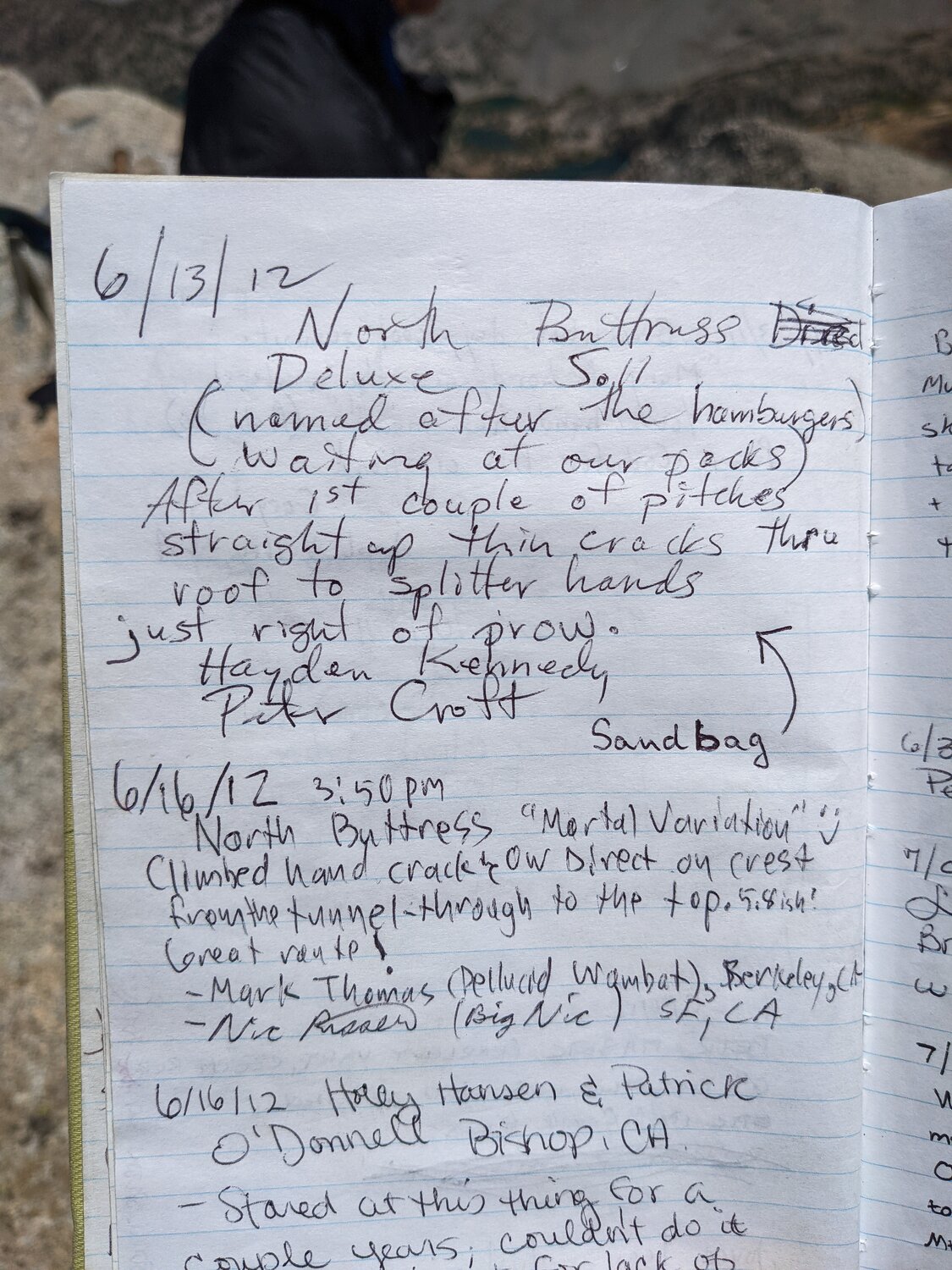 There were a bunch of summit register entries from famous rock climbers who had climbed the various routes on the peak’s north face. Here’s one from Hayden Kennedy and Peter Croft.