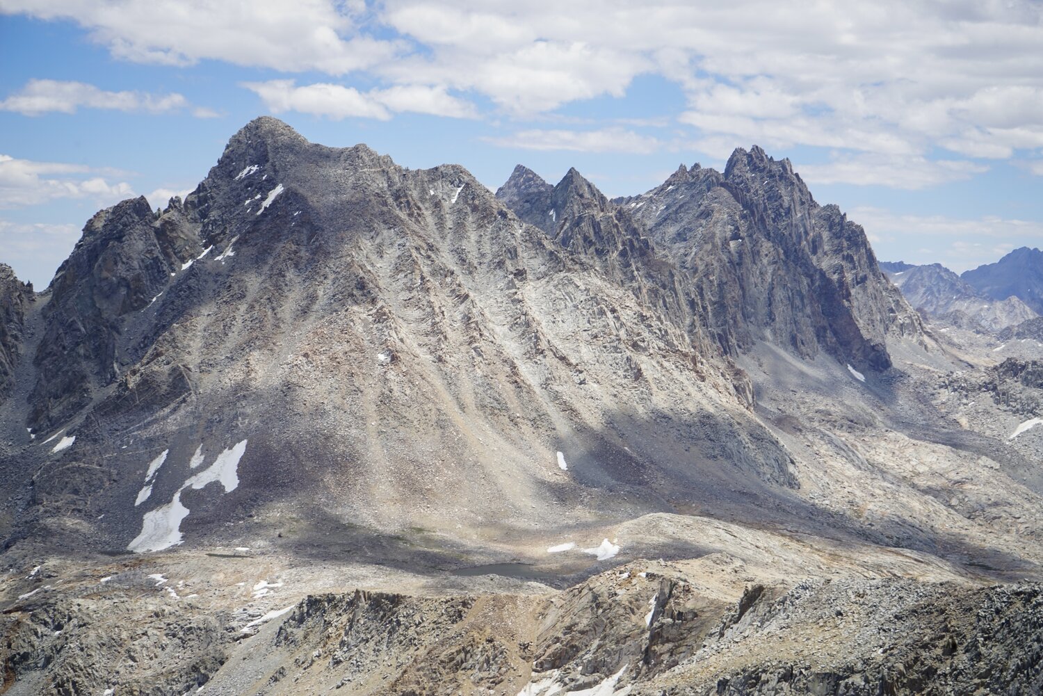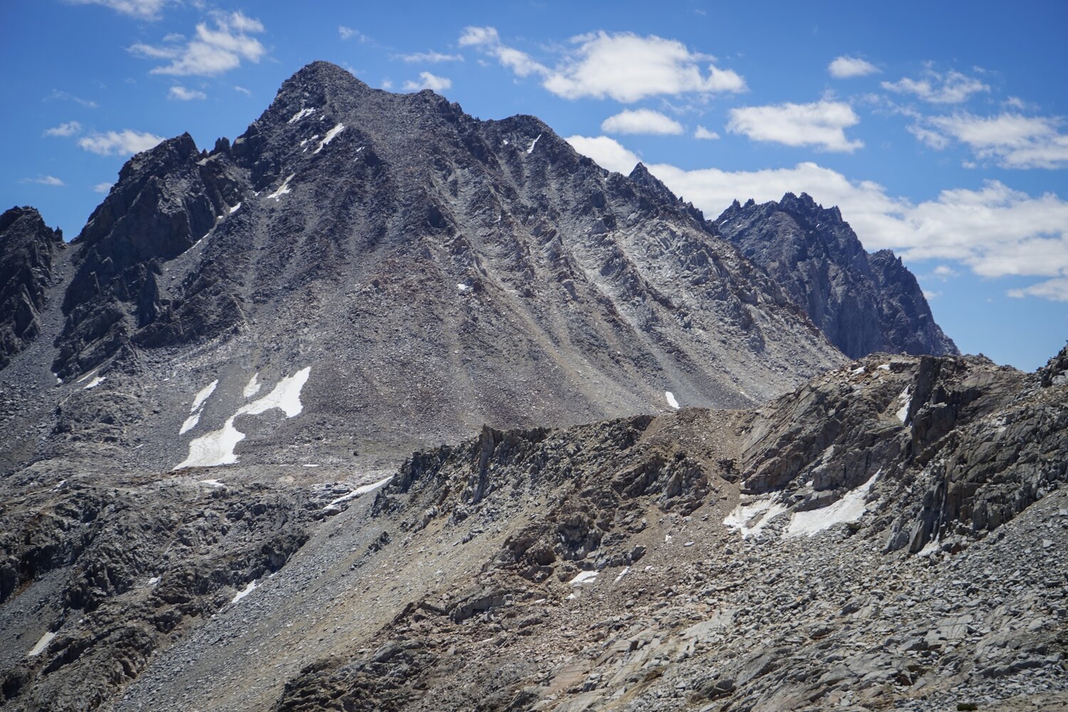 Mount Agassiz and the North Palisade Group from the southeast slope of Mount Goode. There wasn’t a great trail to follow from Bishop Lake up through the scratchy forest of small pines. Once I reached the relatively flatter area at 11,800’ I found a good use trail through the sand, though it wasn’t particularly helpful as the travel here was quite easy.