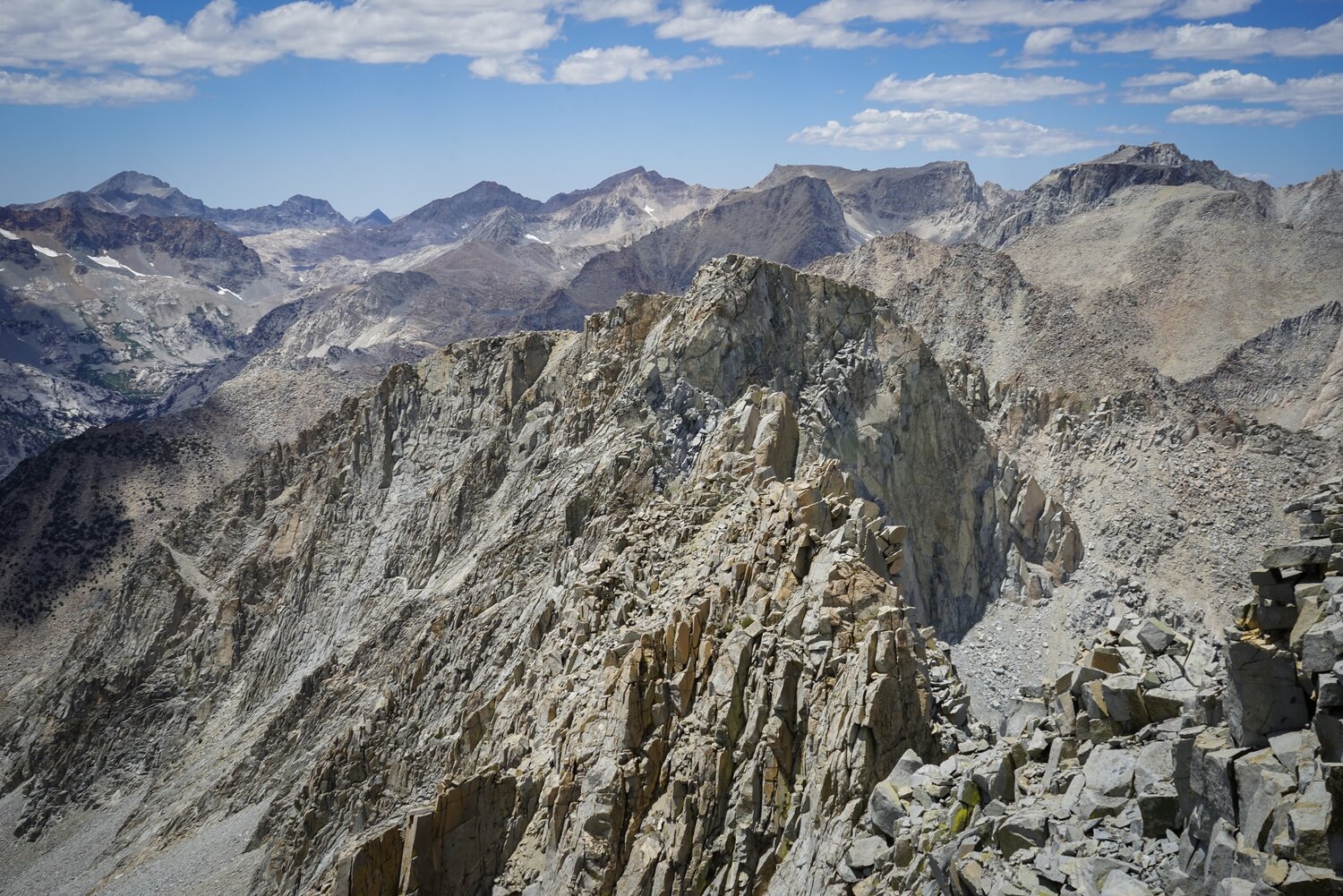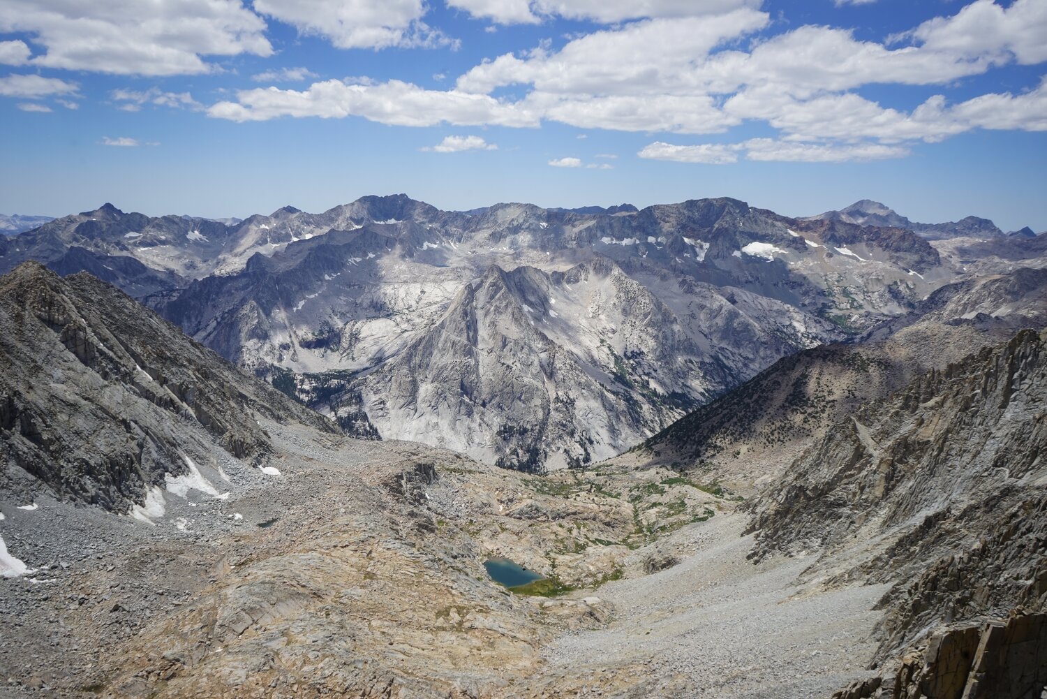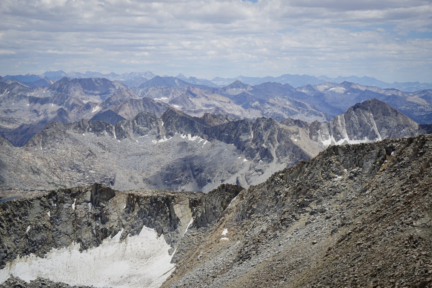 The view south. Mount Williamson and Mount Whitney are visible at left, as is much of the Kings Kern Divide and the Kaweahs at right. The peak in the middle-right is Giraud Peak which is above and southwest of the Dusy Basin.