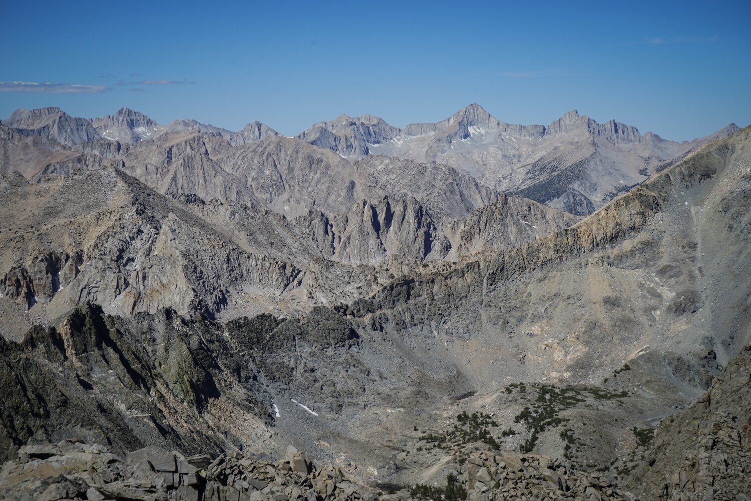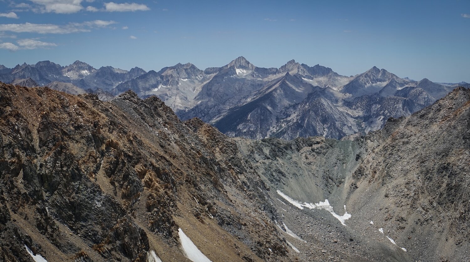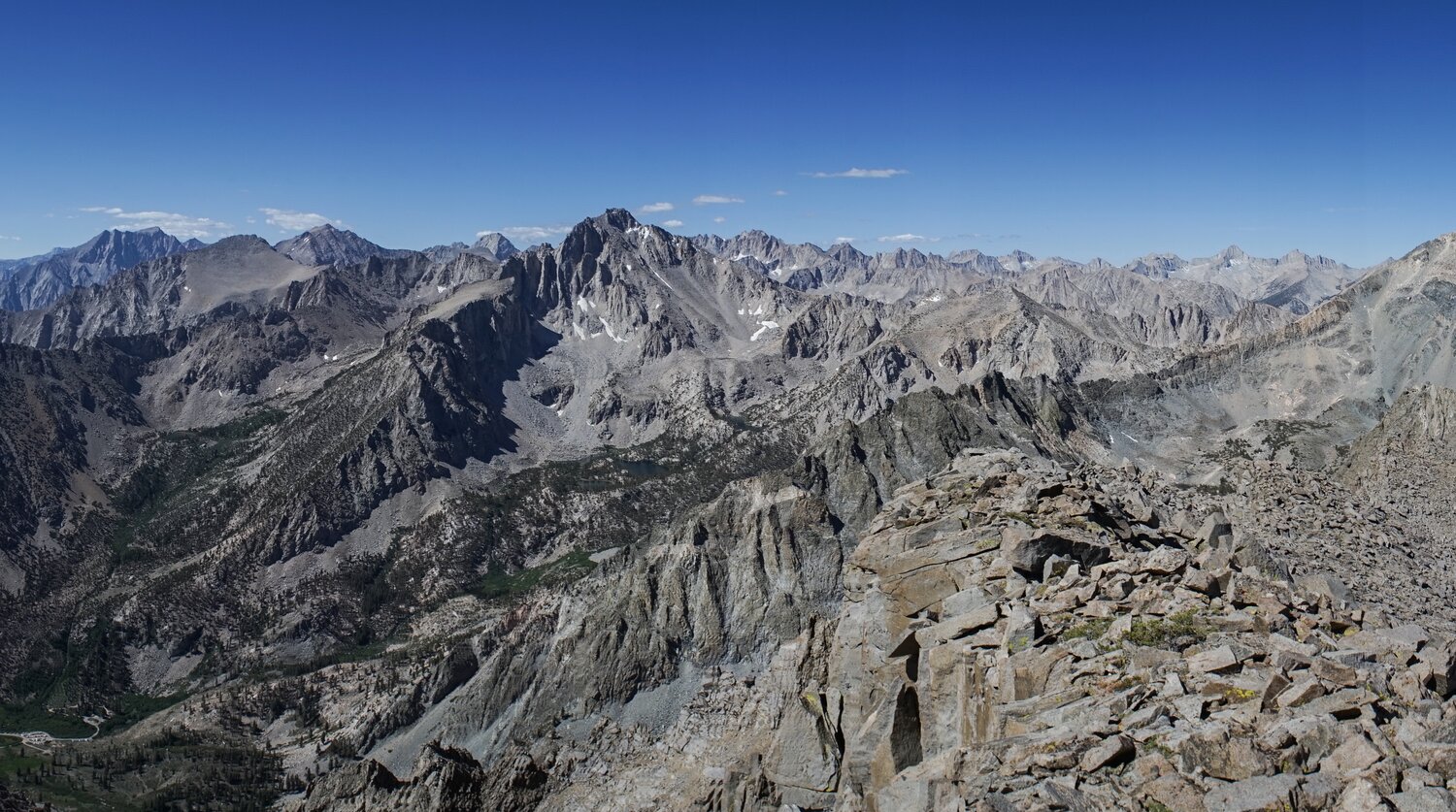 Looking southwest over the Kearsarge Pinnacles, the Videttes, and the Great Western Divide.
