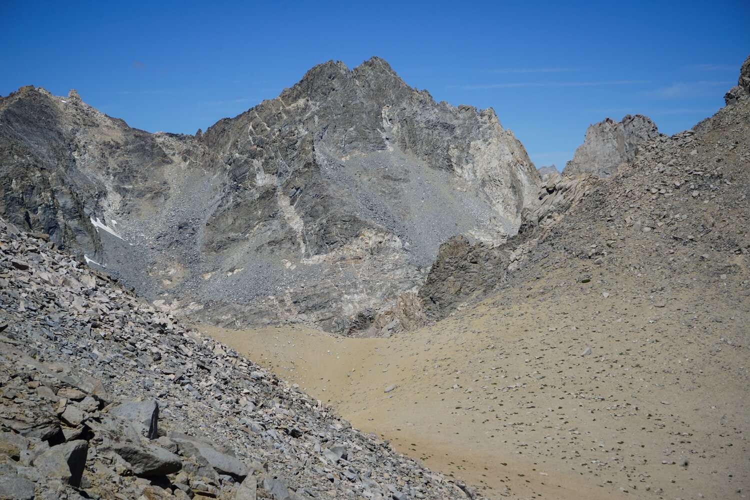 Dragon Peak from the traverse back to Lilley Pass. The usual route up Dragon Peak from this side climbs the talus chute left of the peak before gaining the ridge and traversing the other side to the summit.