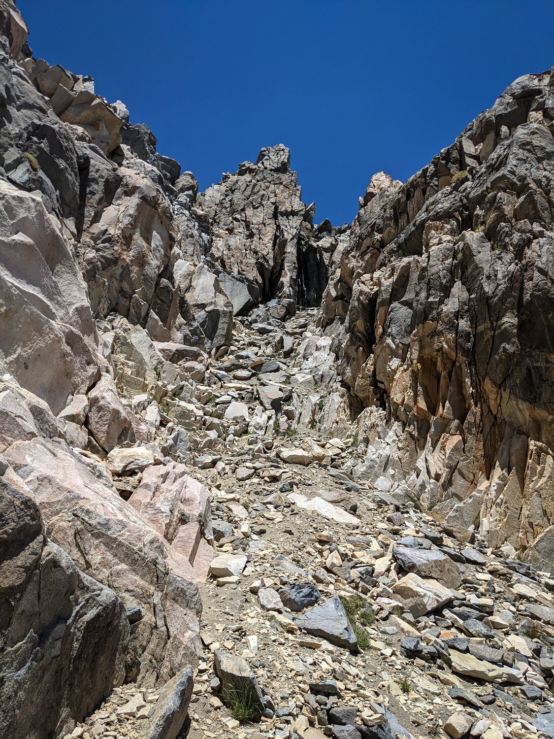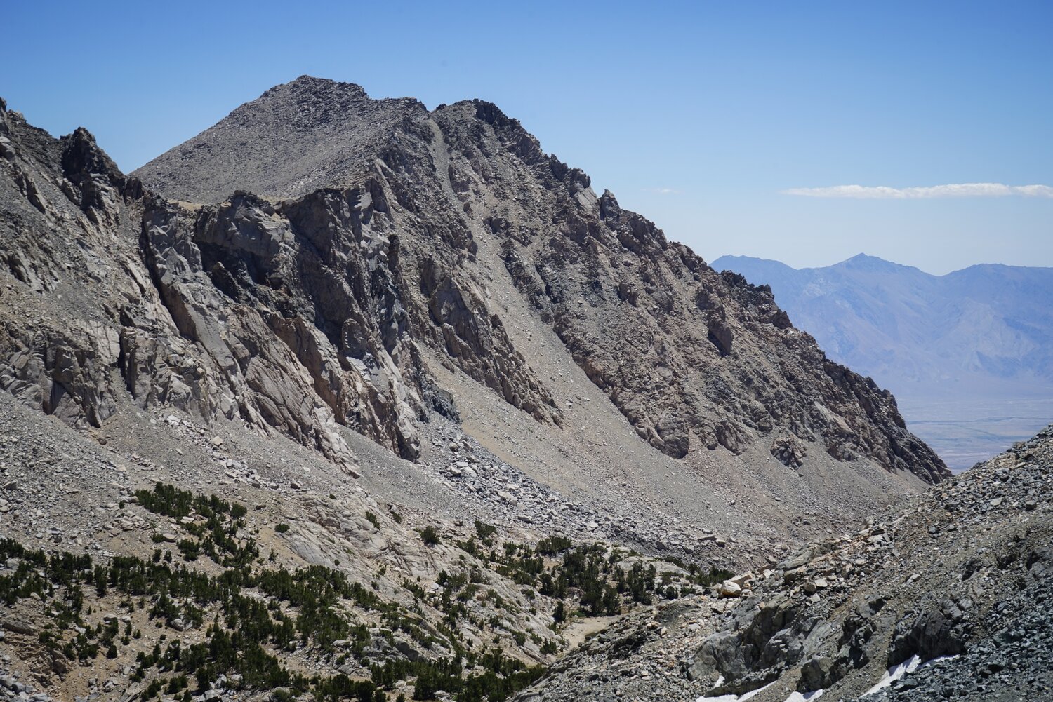 After a short break I set off for the chute that climbs up towards the crest. There was a nice view of Kearsarge Peak to the east. The chute wasn’t too bad, a bit steep but no other challenges. It was getting warm and I was getting higher up, so I was starting to move a little more slowly.