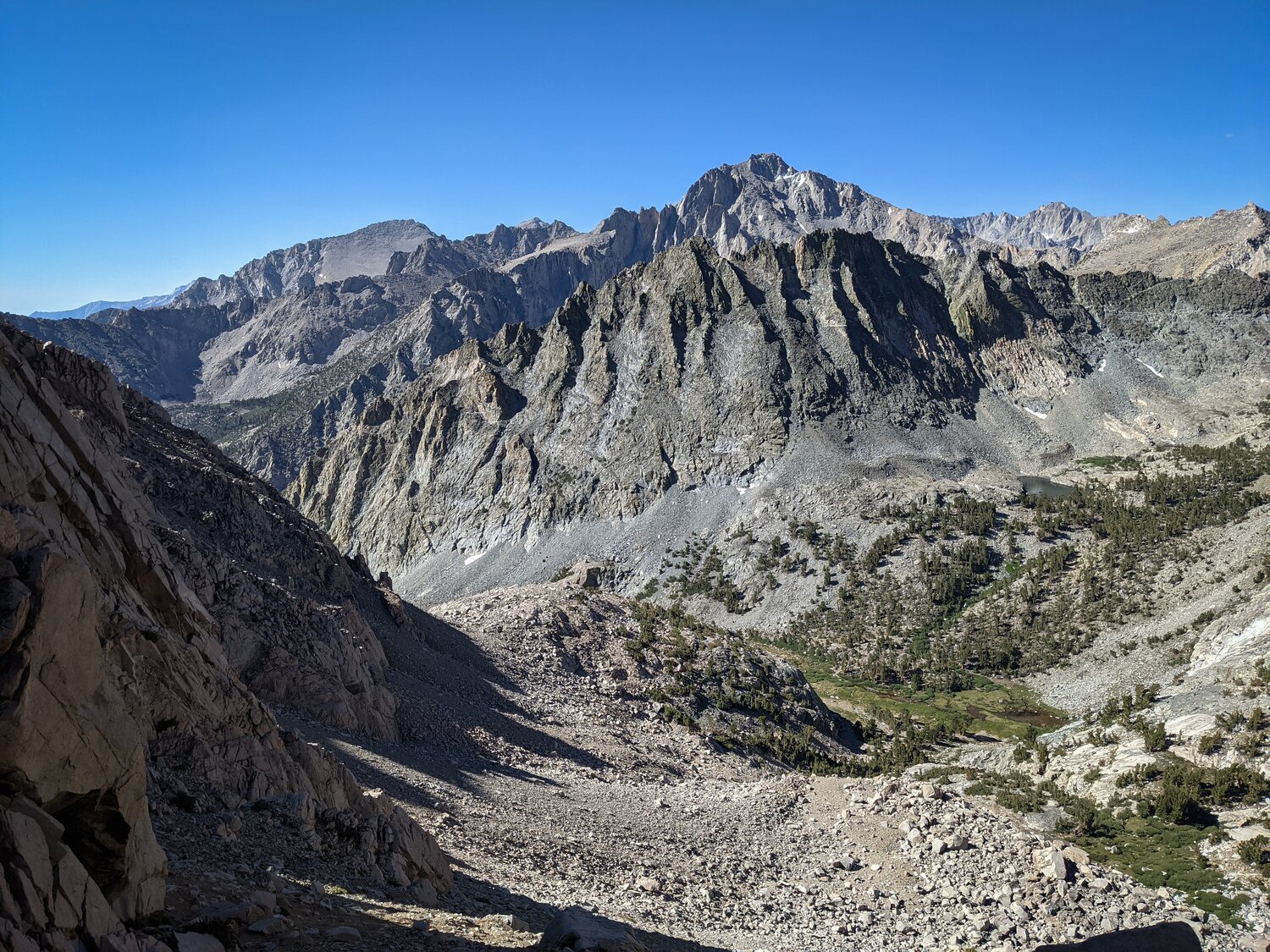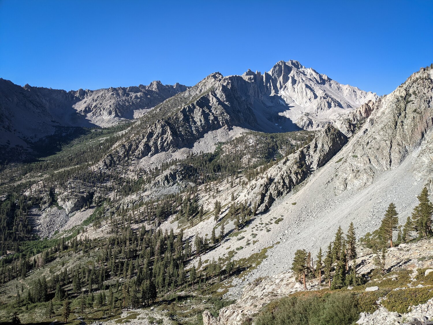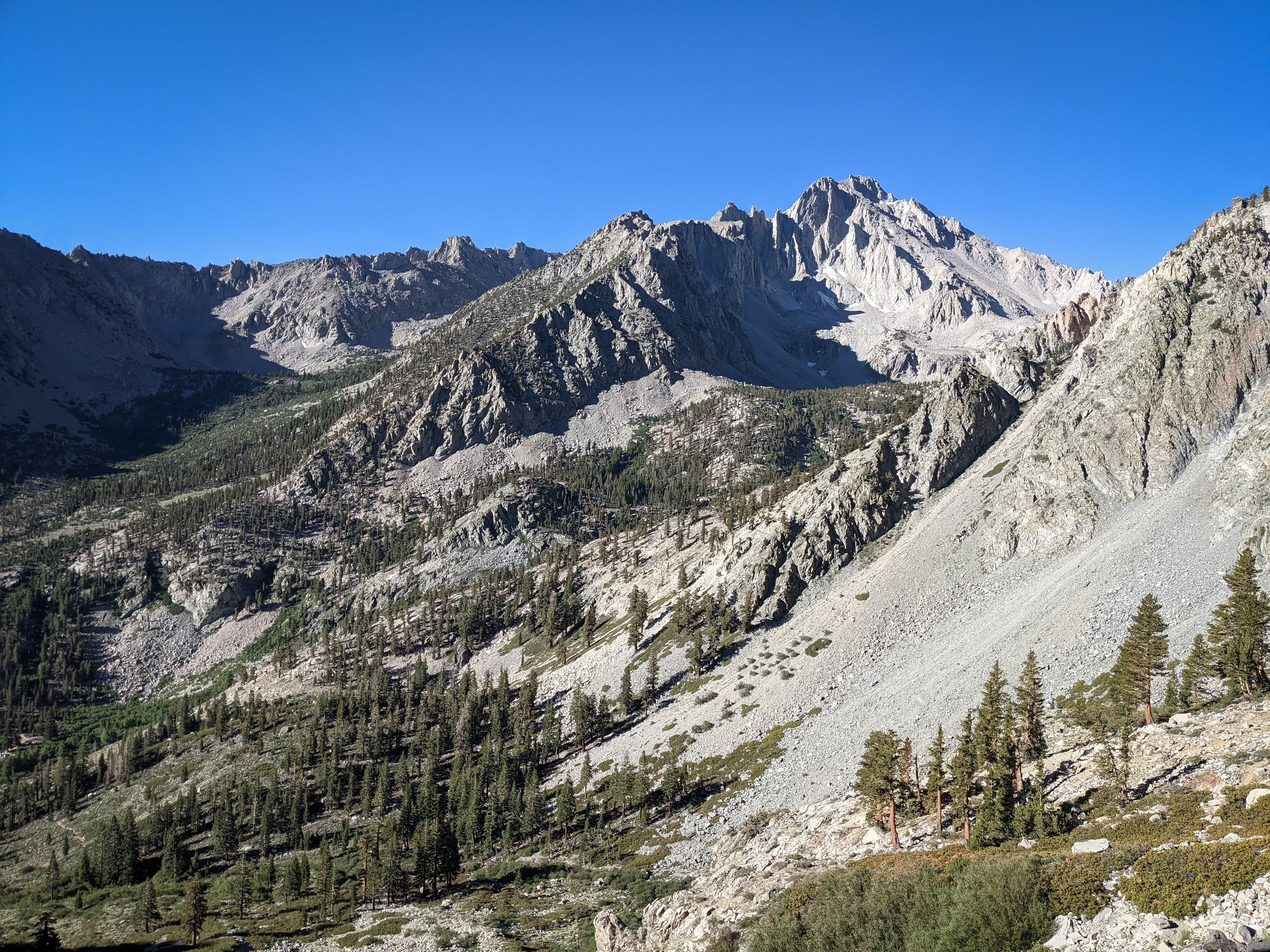 The Kearsarge Lakes and Pinnacles again from lower down. I descended a sandy chute that headed just west of Kearsarge Pass. It was a bit loose in places, but not terrible.