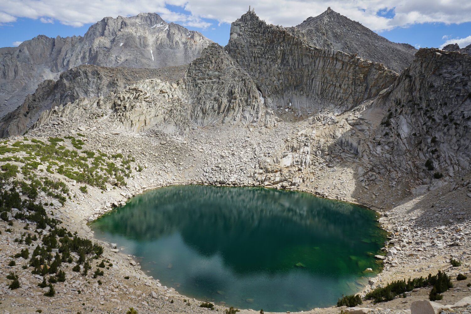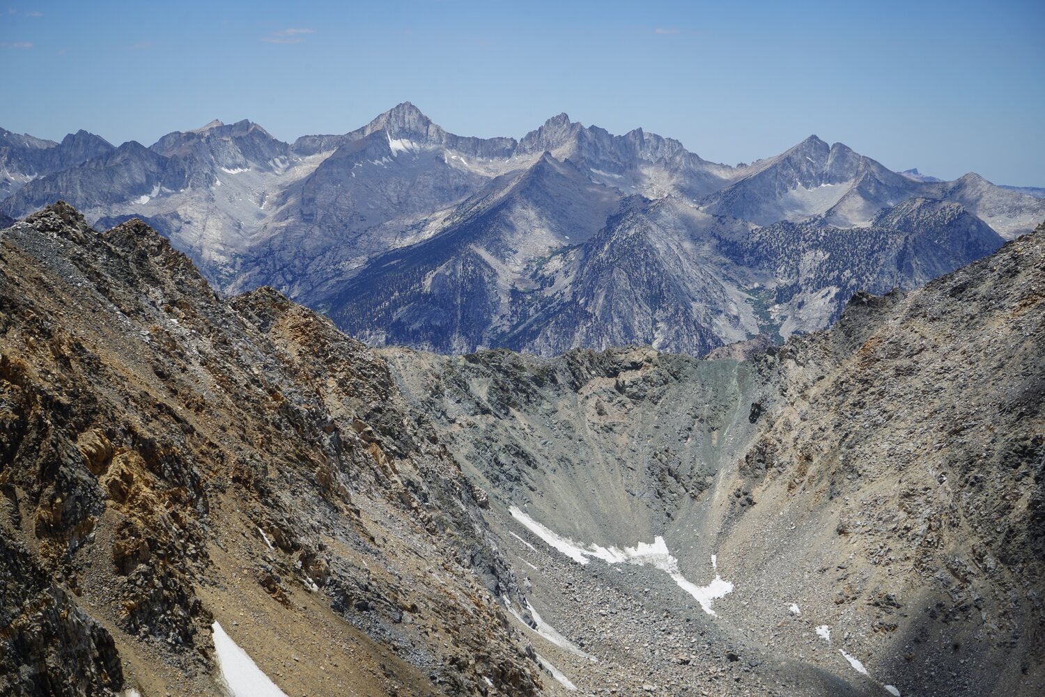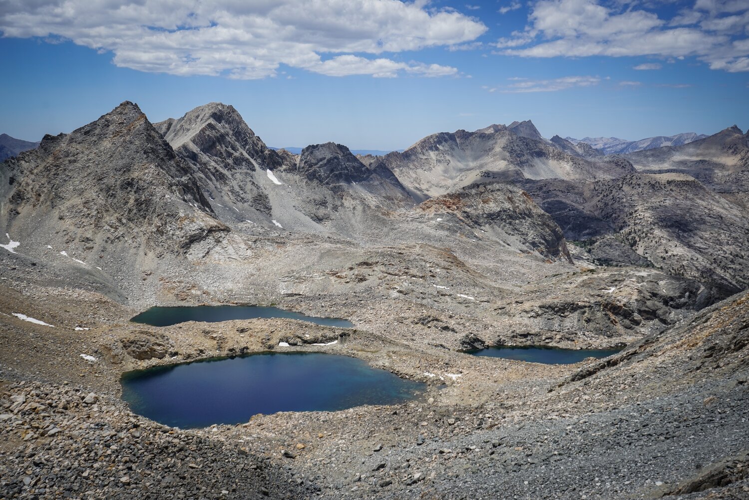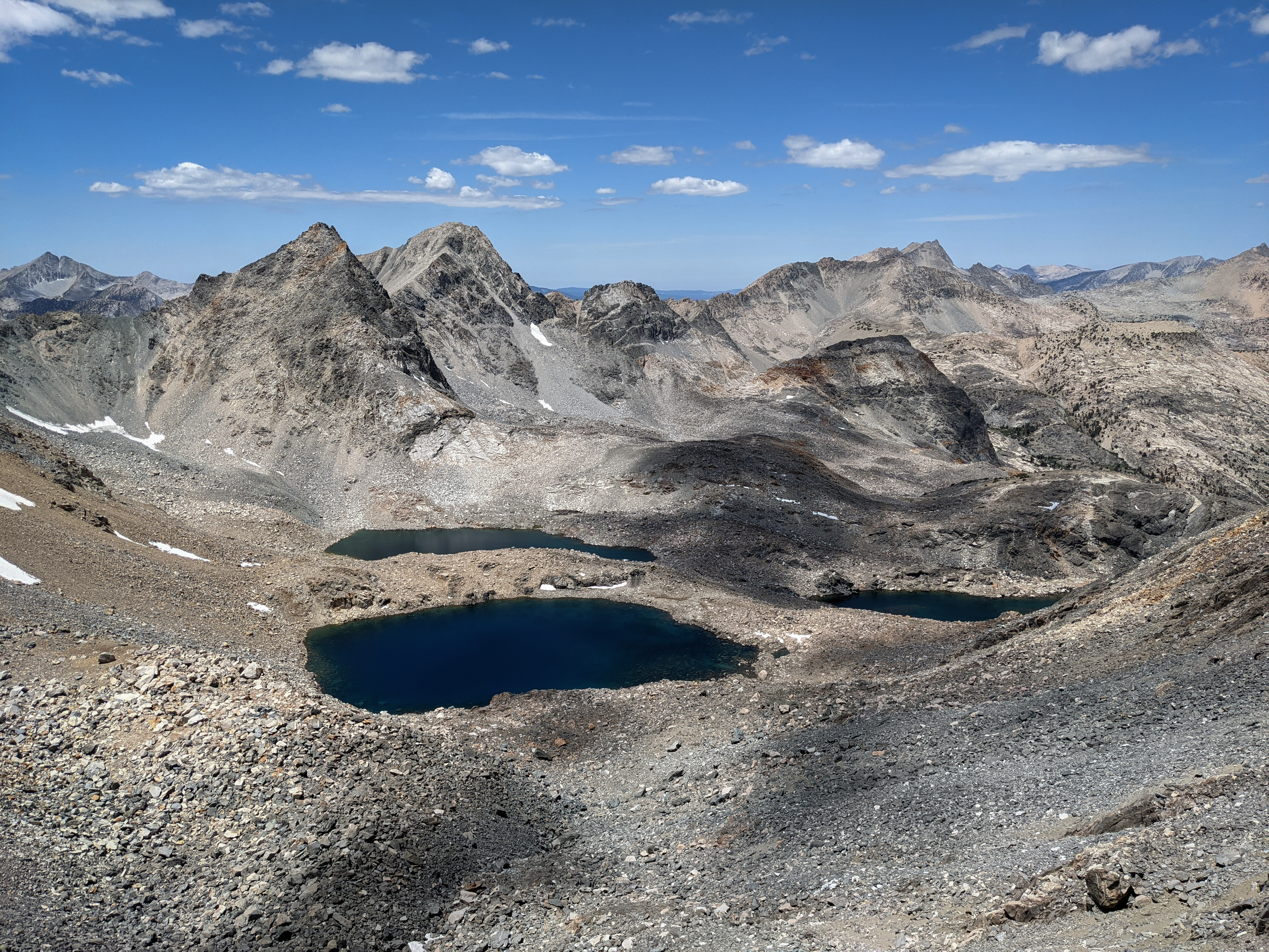 The Kearsarge Lakes and Pinnacles again from lower down. I descended a sandy chute that headed just west of Kearsarge Pass. It was a bit loose in places, but not terrible.