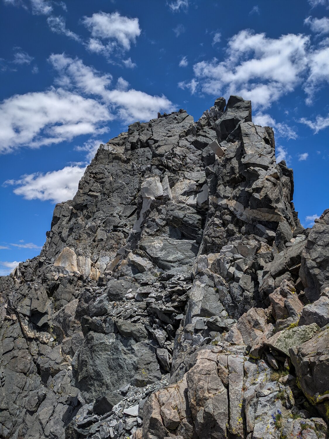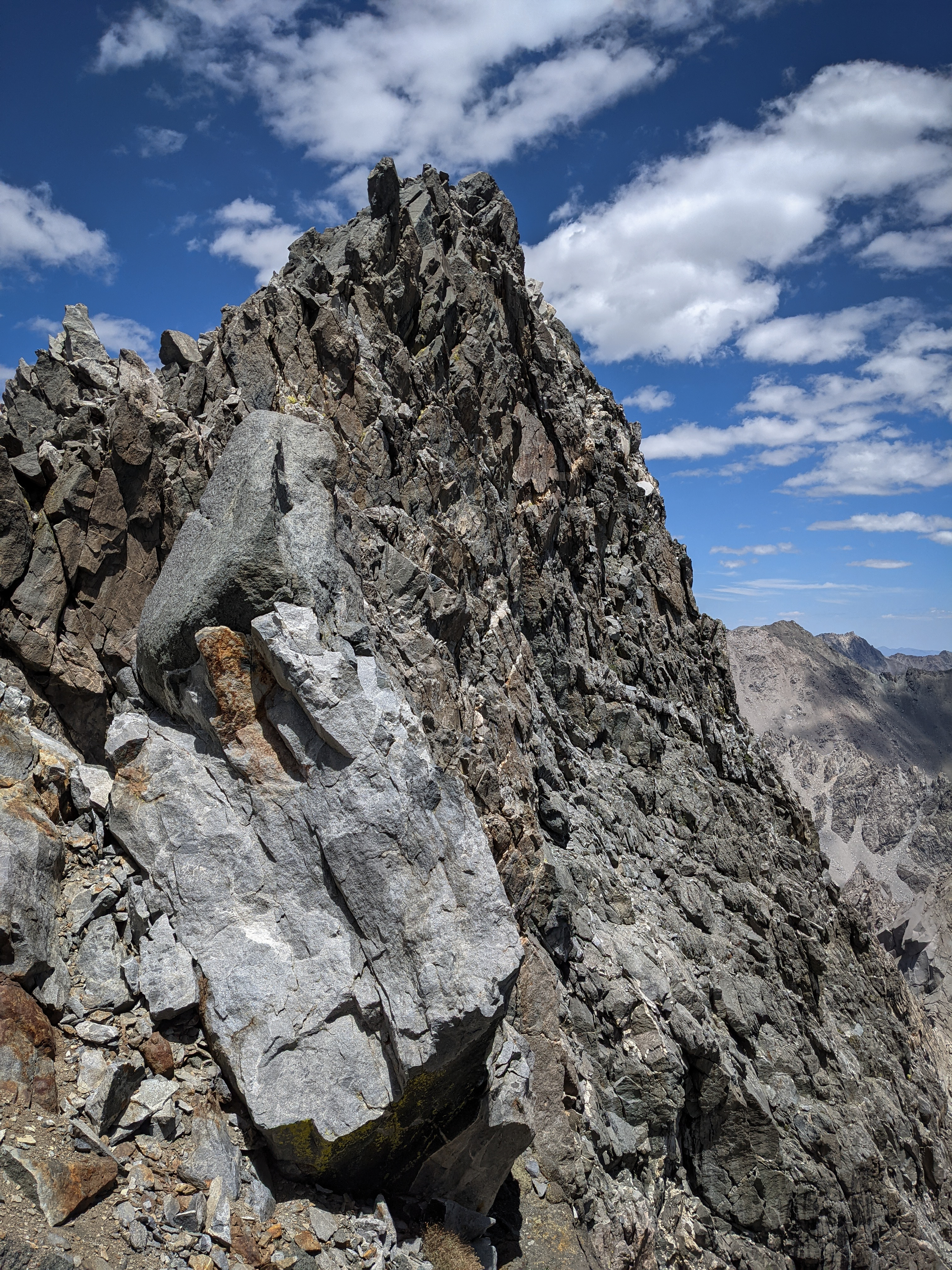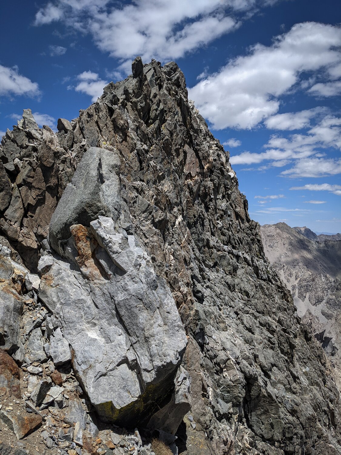 The true summit block from a small saddle just to the south. From here, I continued traversing until I reached a cliff just on the other side of the summit block. Then I reversed course and climbed up into the corner near the white rock, which went at class 3. Here, I was at the base of the crack, which didn’t look too terrible. I was able to stick my feet about 6 inches into it and lean against the rock, which felt quite secure because the rock wasn’t too steep. I started shuffling my feet across, holding on to occasional small handholds where I found them. Midway across a break in the crack required a larger step, but it was still manageable. Before long I was across the crack and did the final few moves up to the summit.