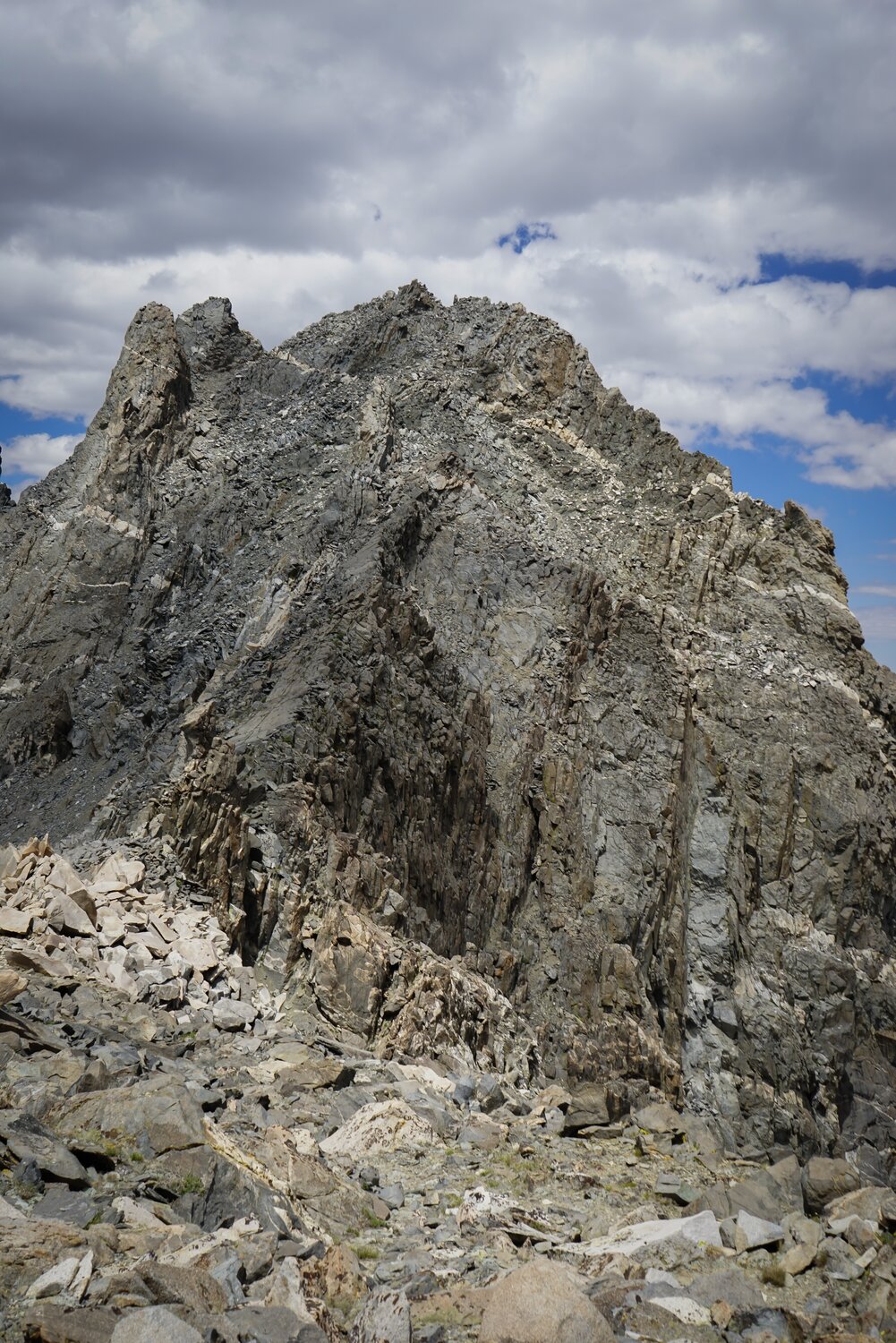 After losing the trail in some talus and wandering for a while I came across this old mineshaft. It was about 10 or 15 feet deep in some cliffs along the south face of the peak. After taking a few photos I headed back across the talus field to try and find the trail. Above here the trail continued to fade now and then, but I was able to mostly follow it until reaching the base of the talus slope below Lilley Pass where I set off through the sand and talus for the pass.