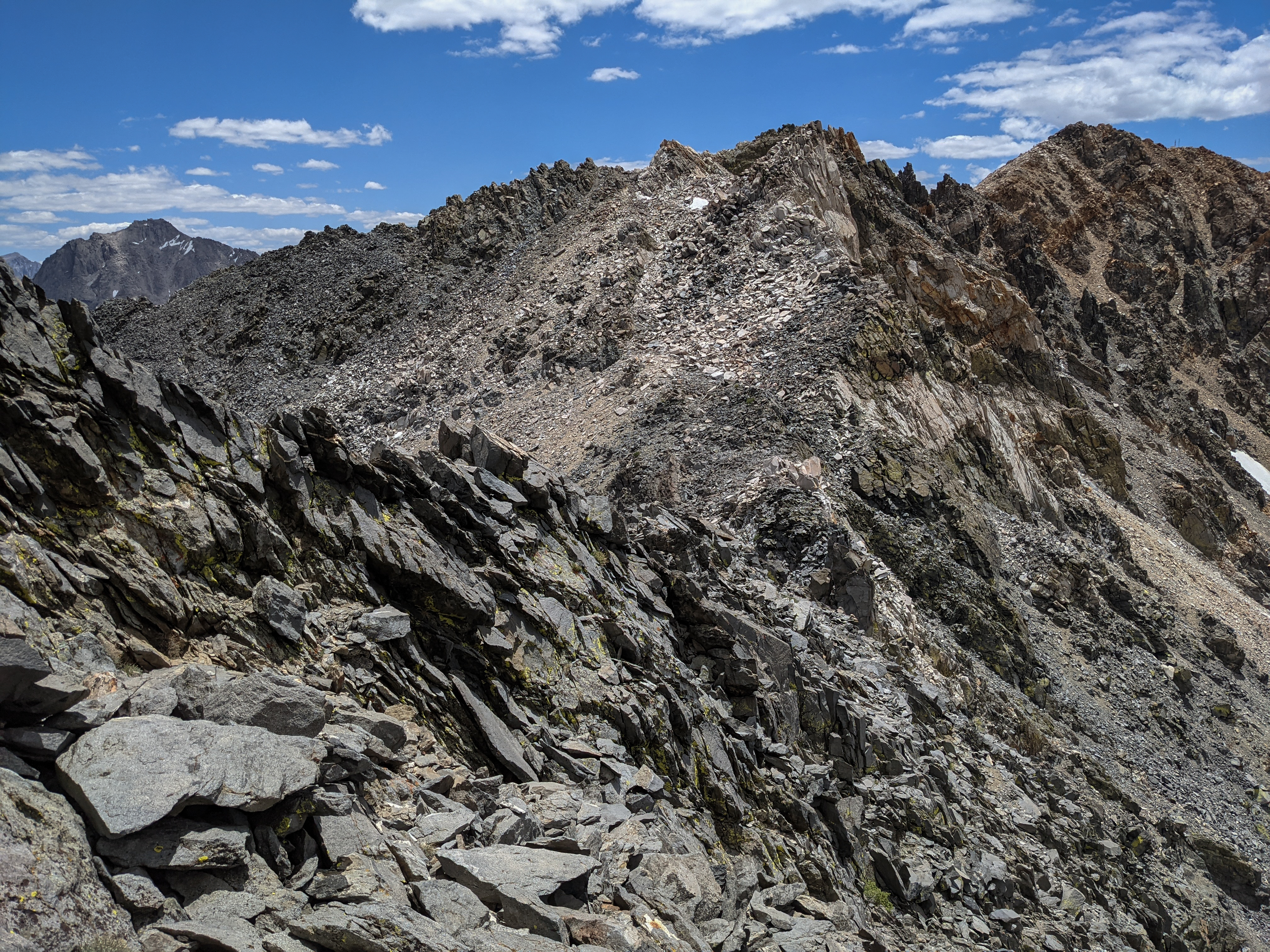 Above the pass the climbing got significantly easier again. I climbed up and across several faint chutes staying just west of the crest. As I neared the top I climbed up to the highest point I could see, but reached the top with no difficult class 3 move. A look around revealed that the summit was probably a little bit farther north, though it was a bit tough to tell. This area is a maze of pillars and chutes rising and descending in all directions.
