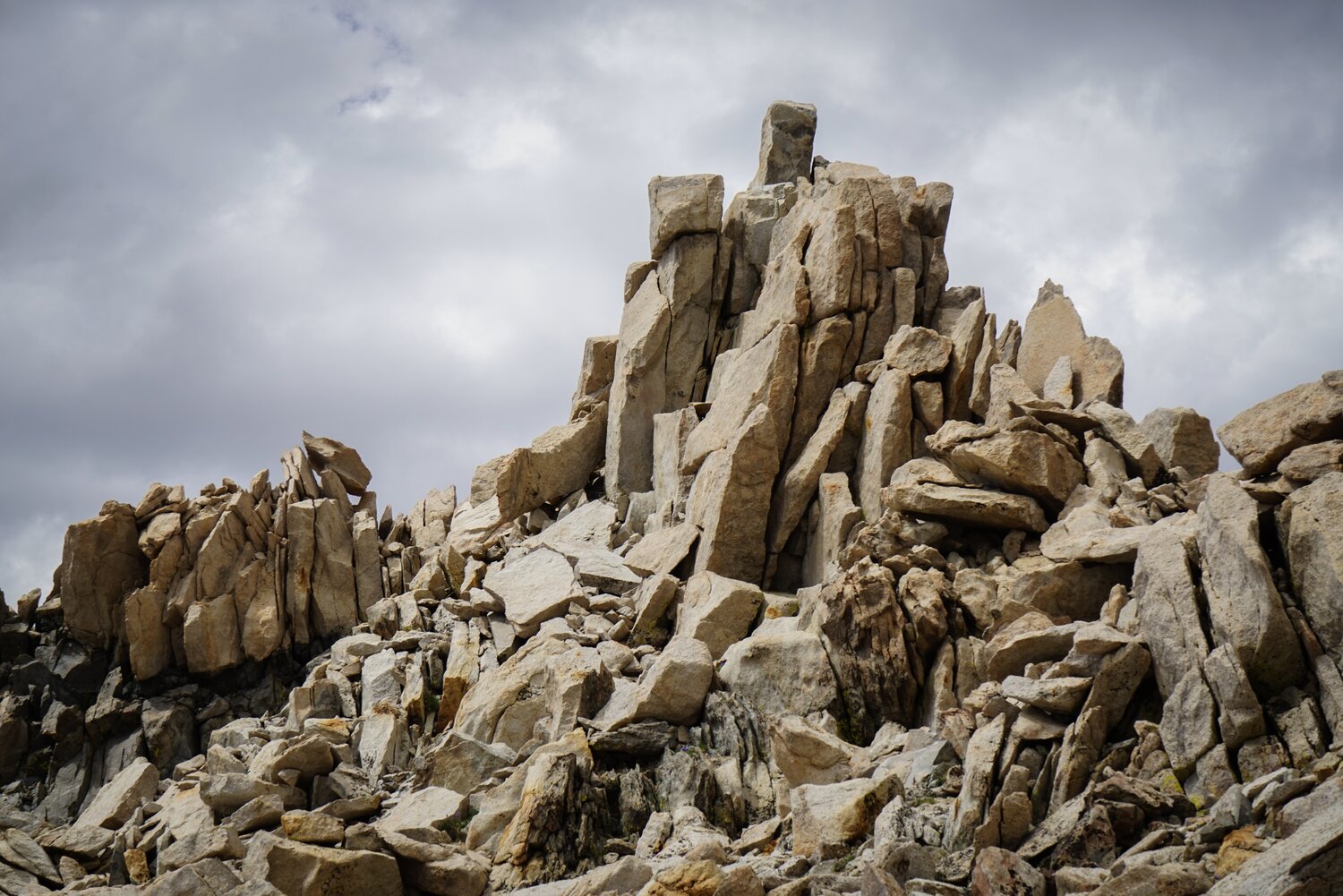 University Peak from somewhere along the Golden Trout Lakes Trail. Almost immediately after leaving the Kearsarge Pass Trail, the trail became much harder to follow. It was overgrown and disappeared under talus now and then. I wasn’t surprised, as this trail dead-ended at a collection of lakes, whereas the other branch was one of the trails most commonly used to access the vast Sequoia-Kings Canyon Wilderness.
