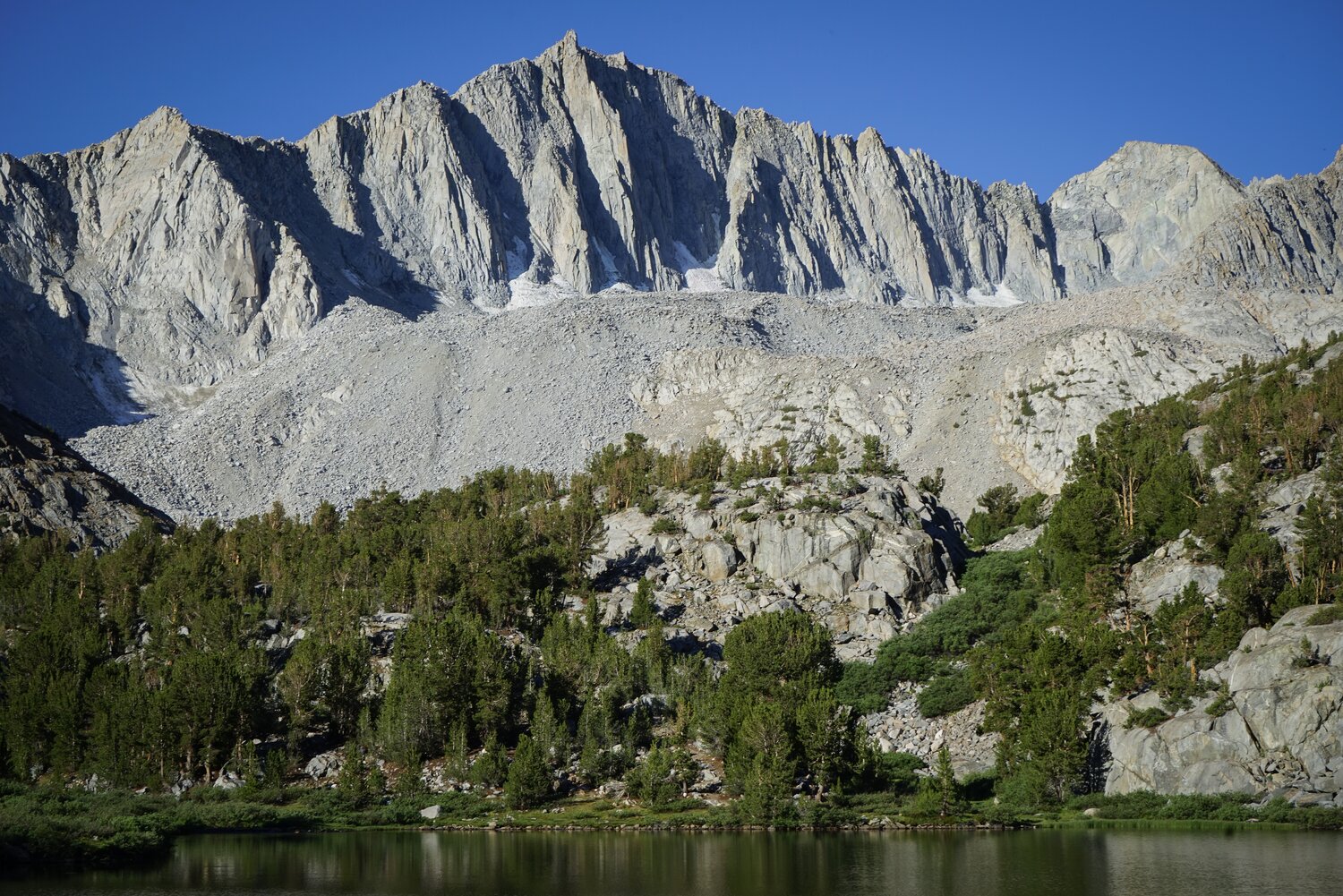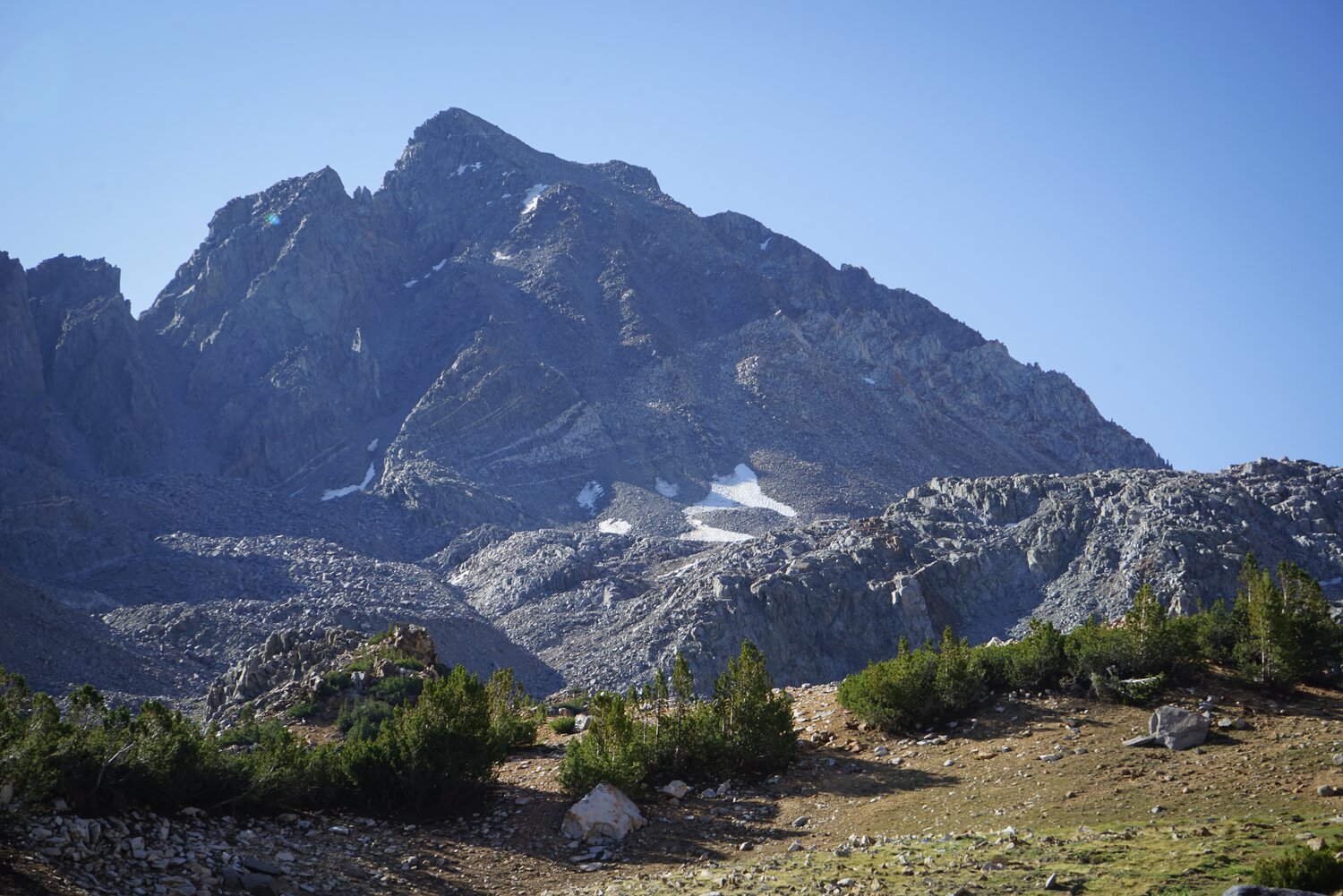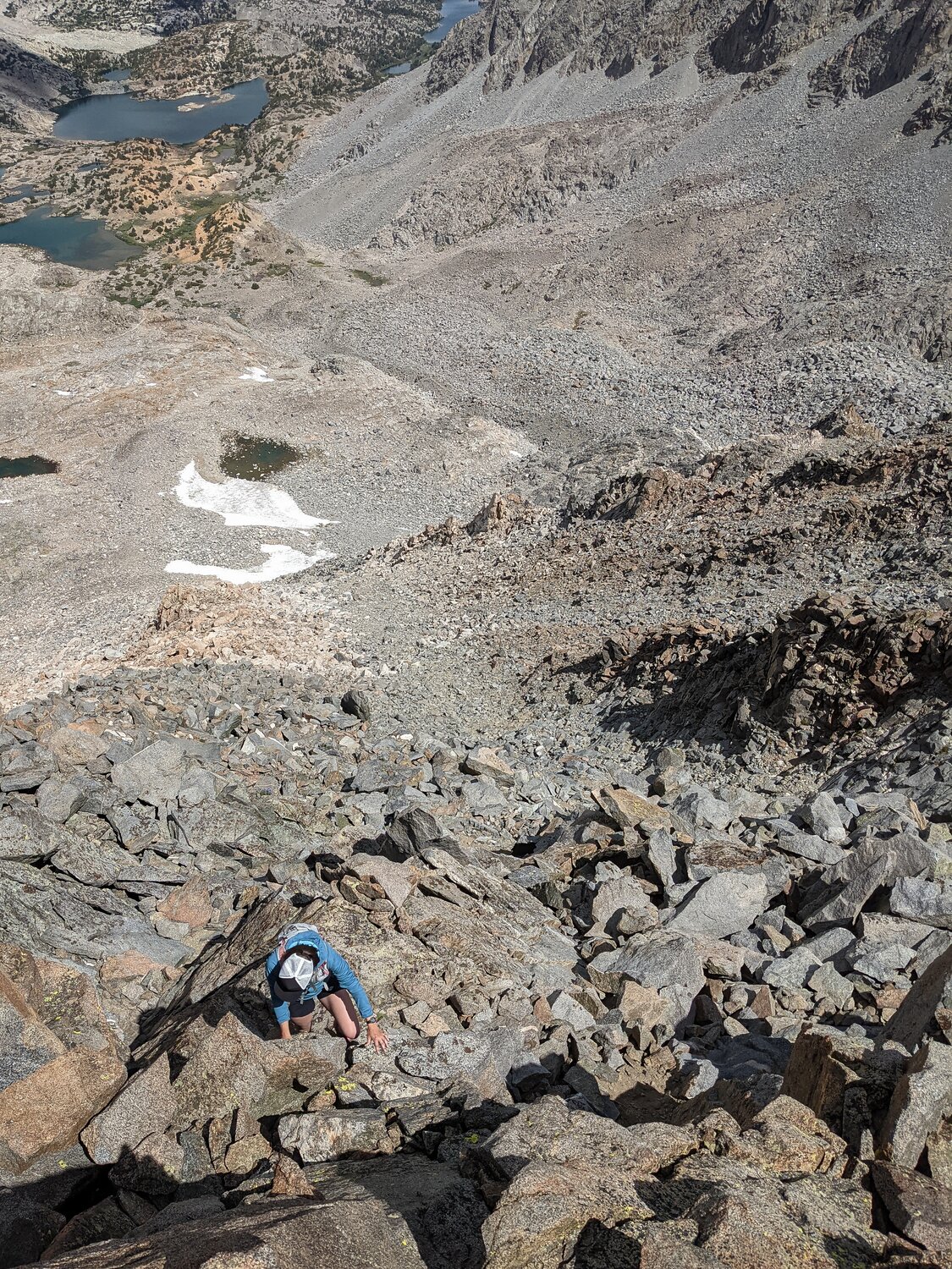 Shannon descending the main chute back to Bishop Pass. With several groups below us we were careful not to knock any rocks loose. Fortunately, it’s not quite steep enough for rocks to really fall too far, despite the steep-looking photo. I think they say the camera adds 15 degrees, right?
