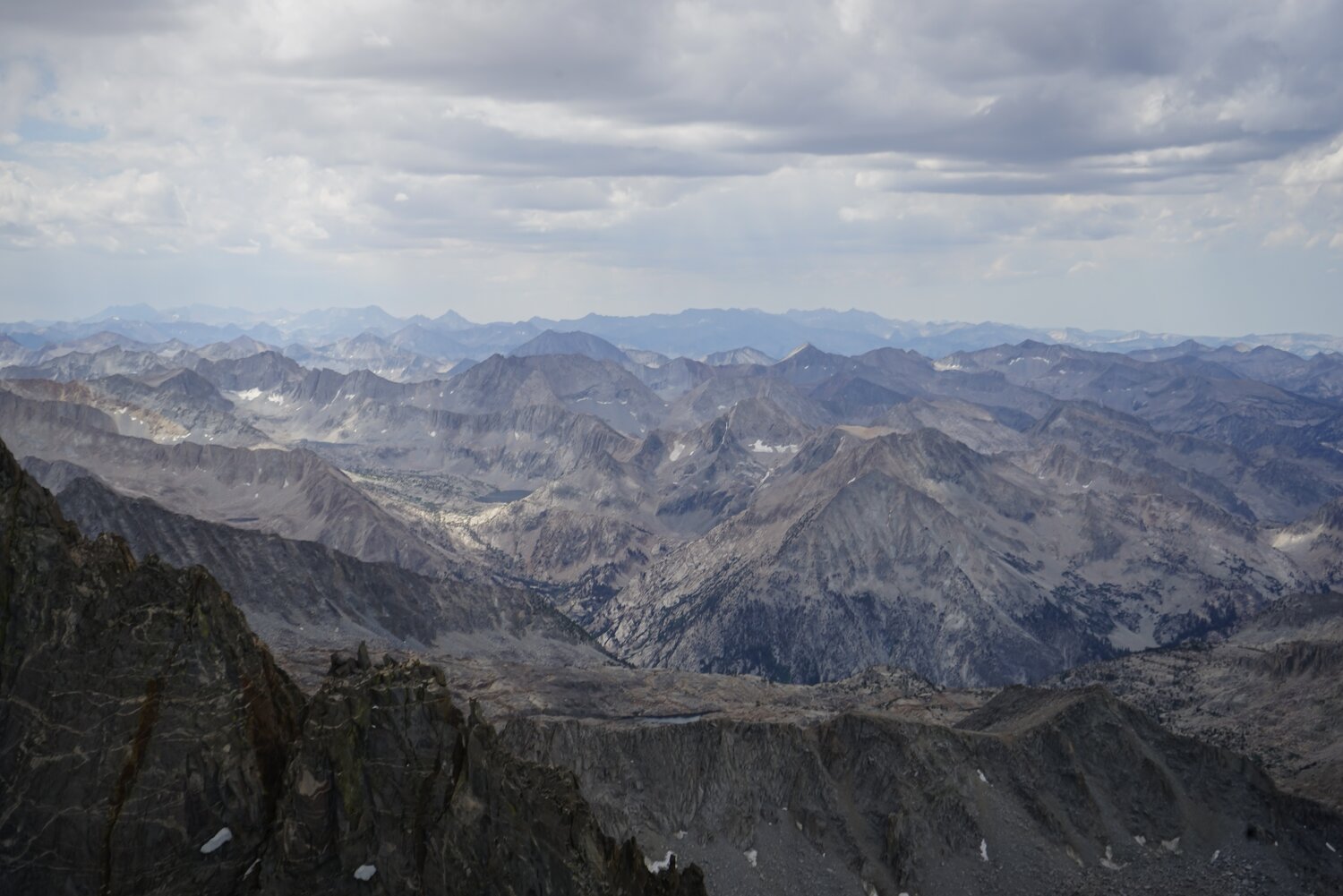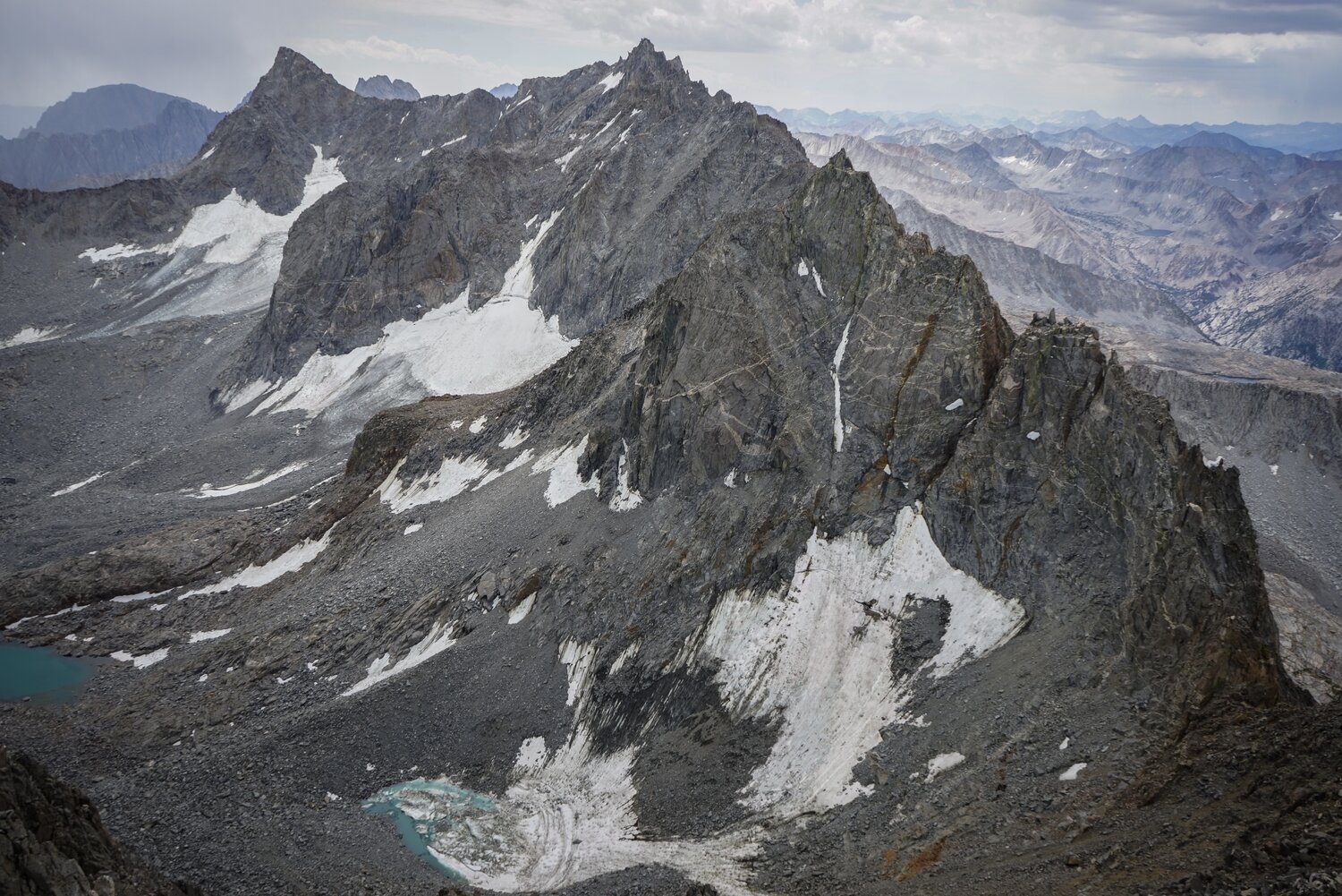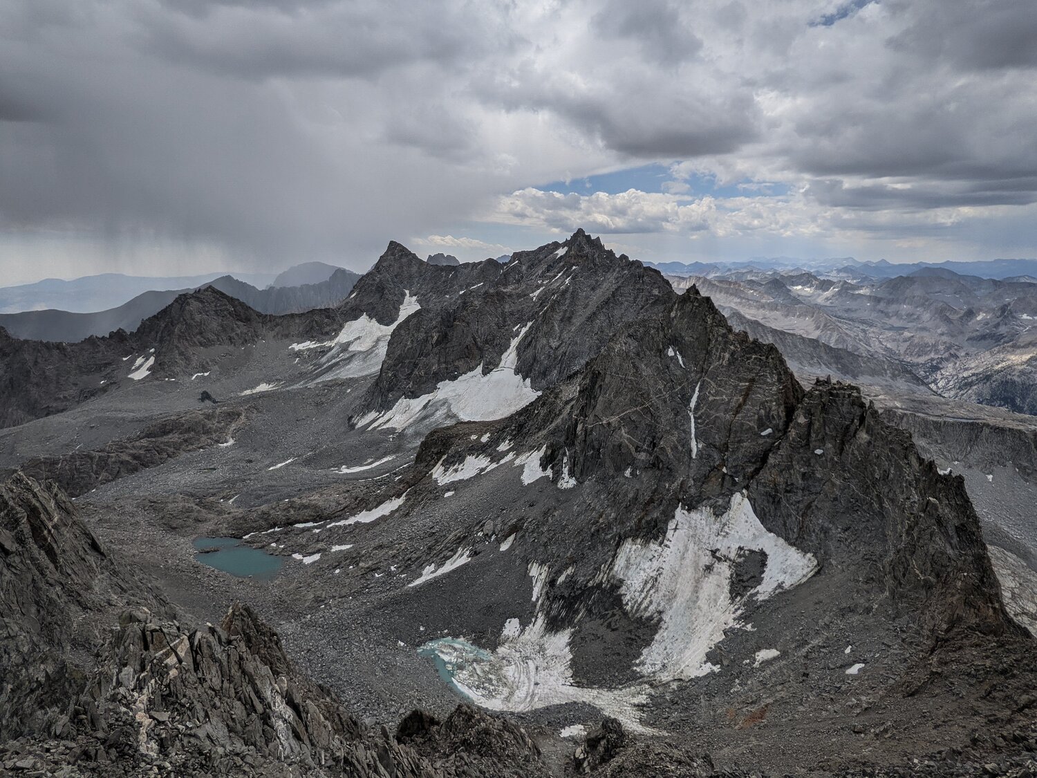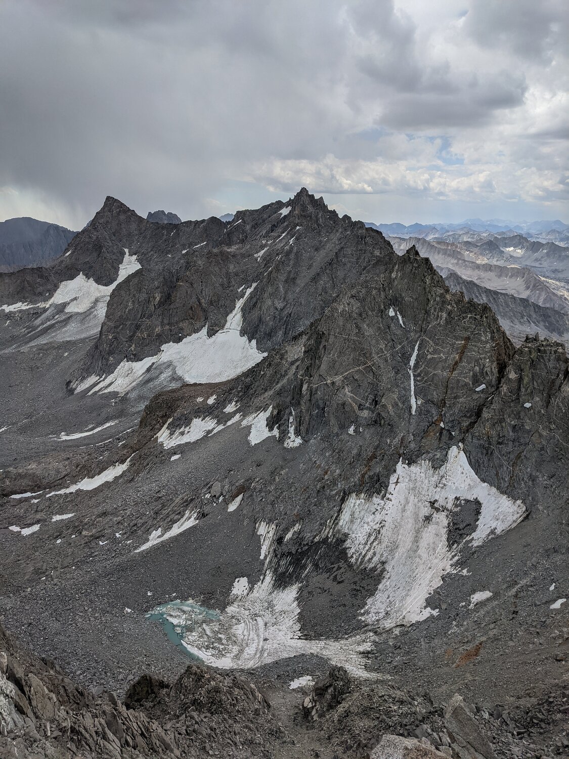 The Palisades from Mount Agassiz, with a thunderstorm beginning to threaten above.