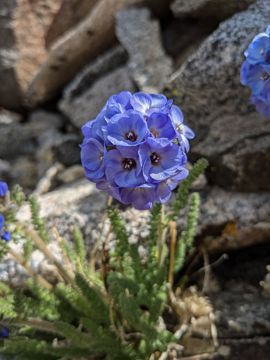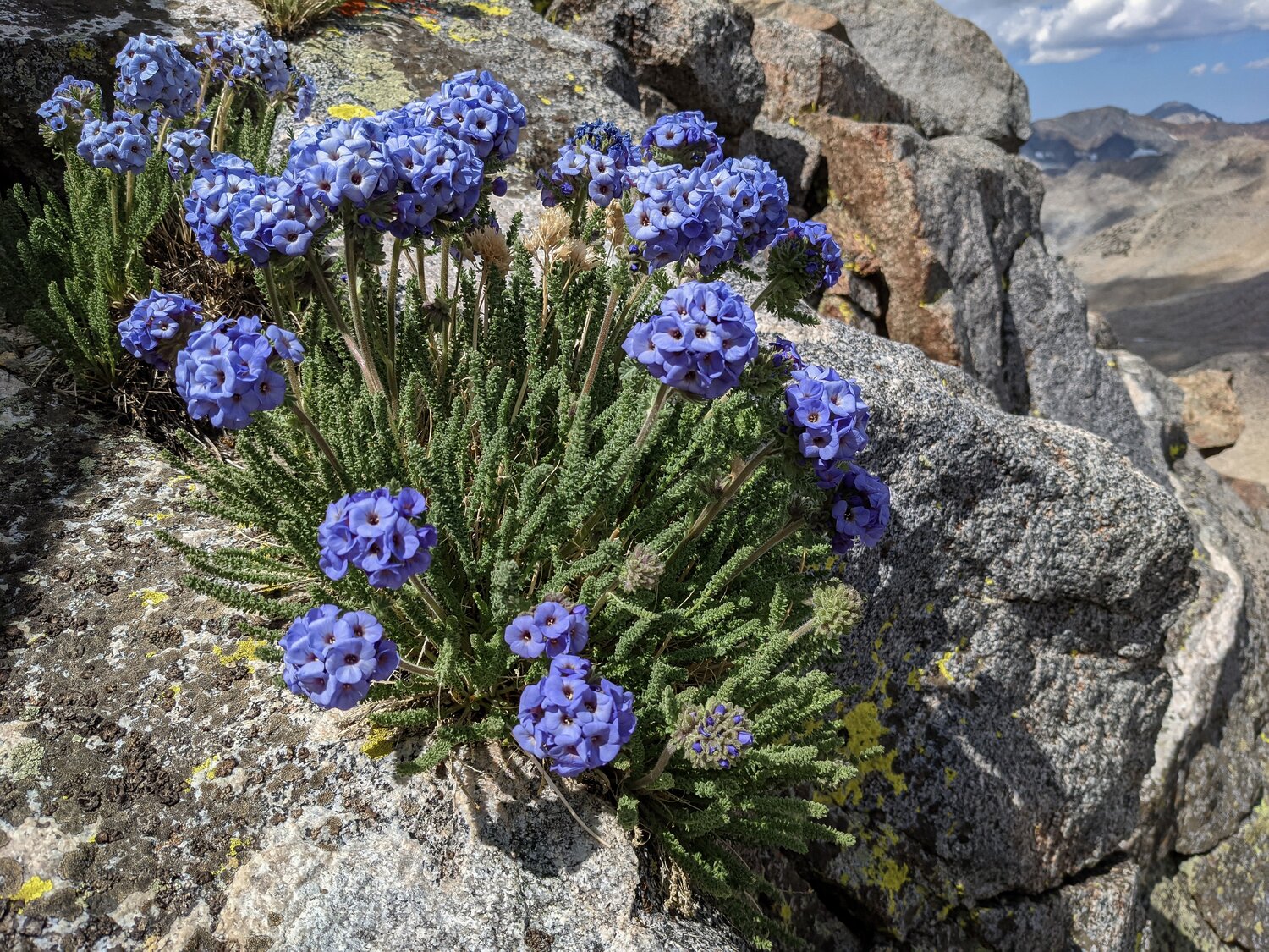 Some clusters of Sky Pilot on Mount Agassiz. We opted to take the chute just west of the usual chute on our way up. I found the climbing here a bit more interesting and engaging, with several class 3 sections at the top. Before long we merged into the main chute and joined several other groups climbing to the summit. We saw the other hiker (runner?) we met in the parking lot heading down already. She was quick!