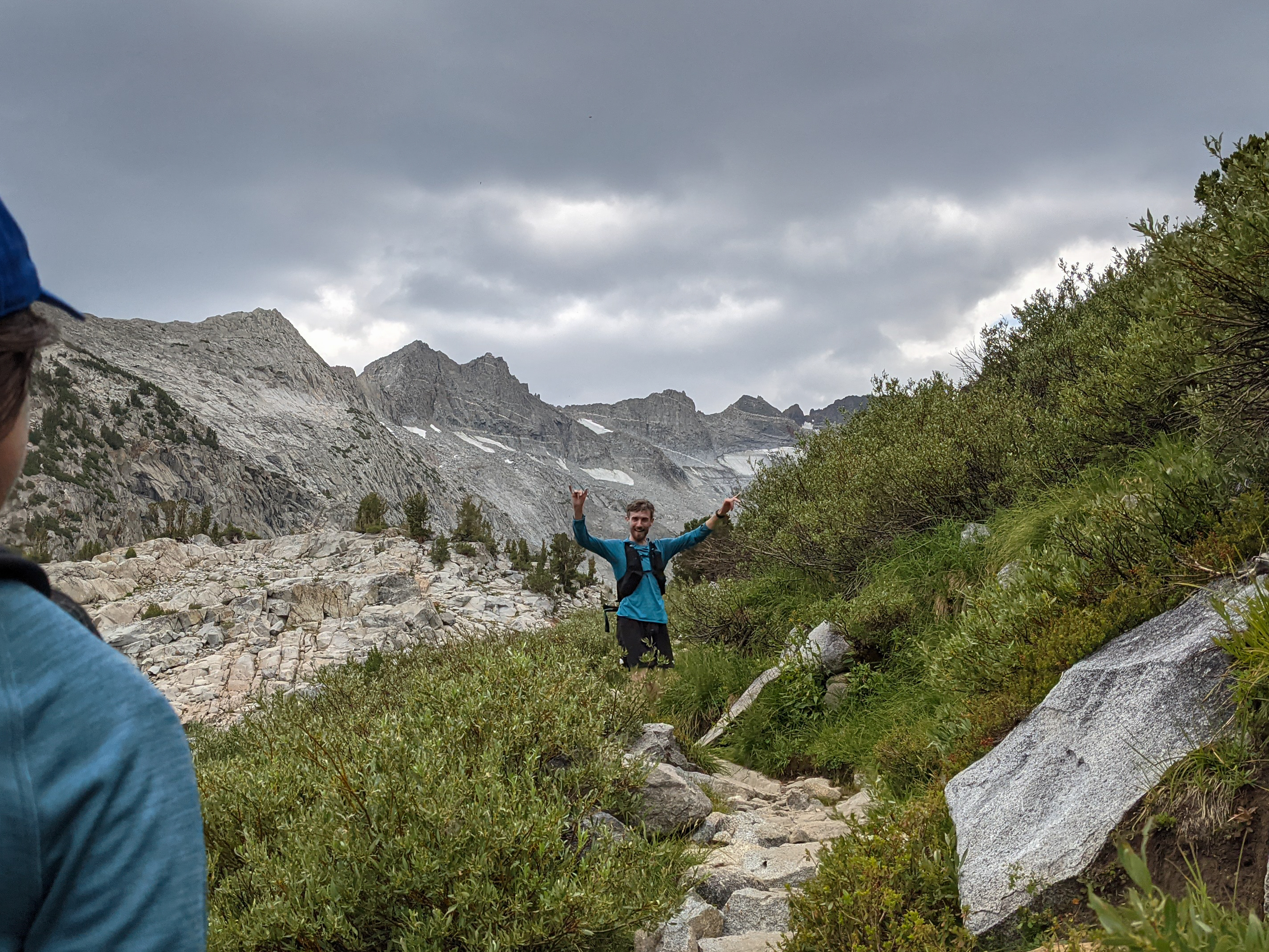 Looking back over the creek under threatening skies. At this point it very much seemed like we weren’t going to have the weather or daylight to climb any mountains today. When we reached the small valley just above the John Muir Trail here, a thunderstorm broke out, forcing us to pitch the tent and crawl inside to wait it out. While we had hoped to make it a bit farther up today, that didn’t seem to be in the cards. We waited out the rain, which abated after about an hour, and then got out and selected a more reasonable campsite then the one we had hurriedly chosen.