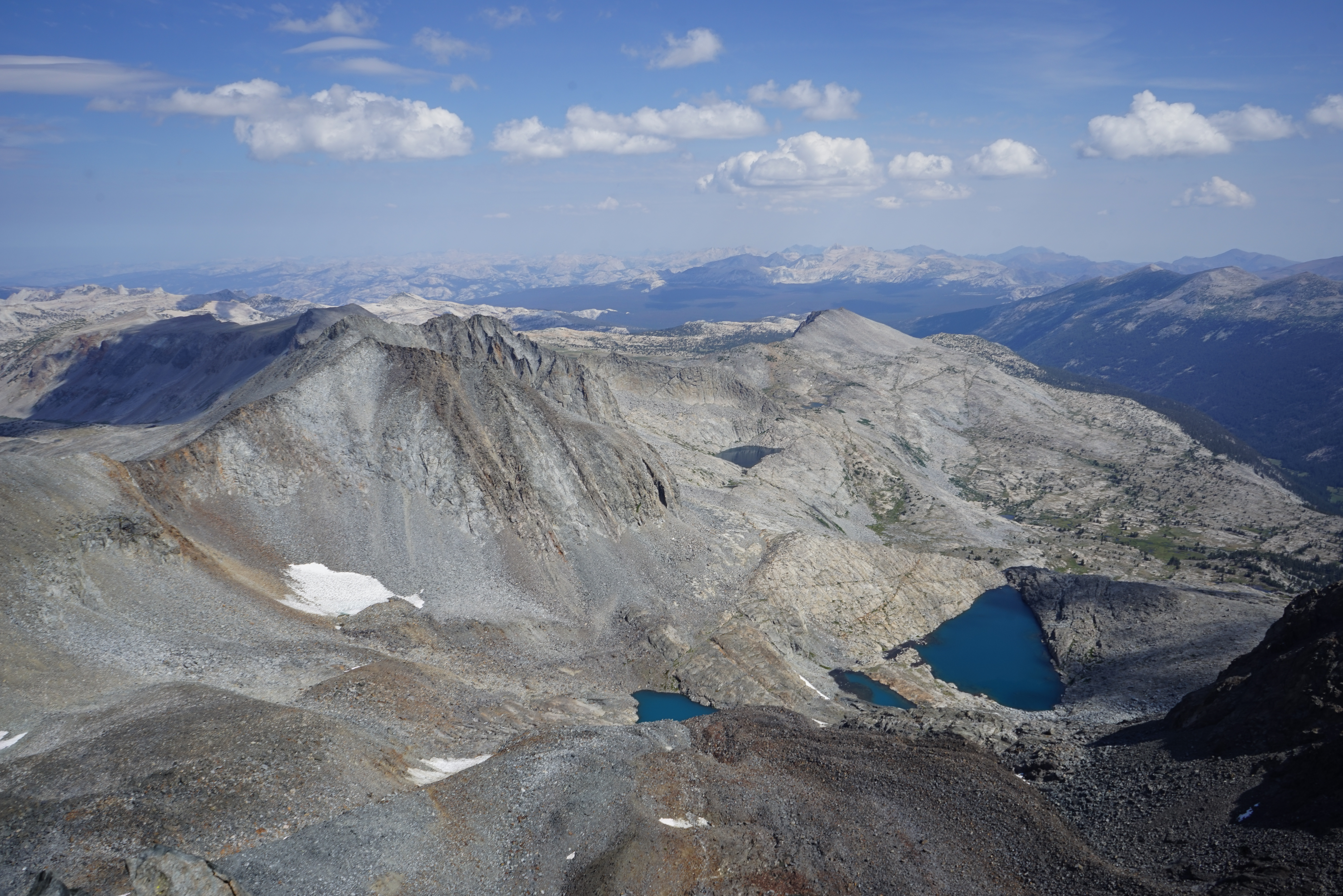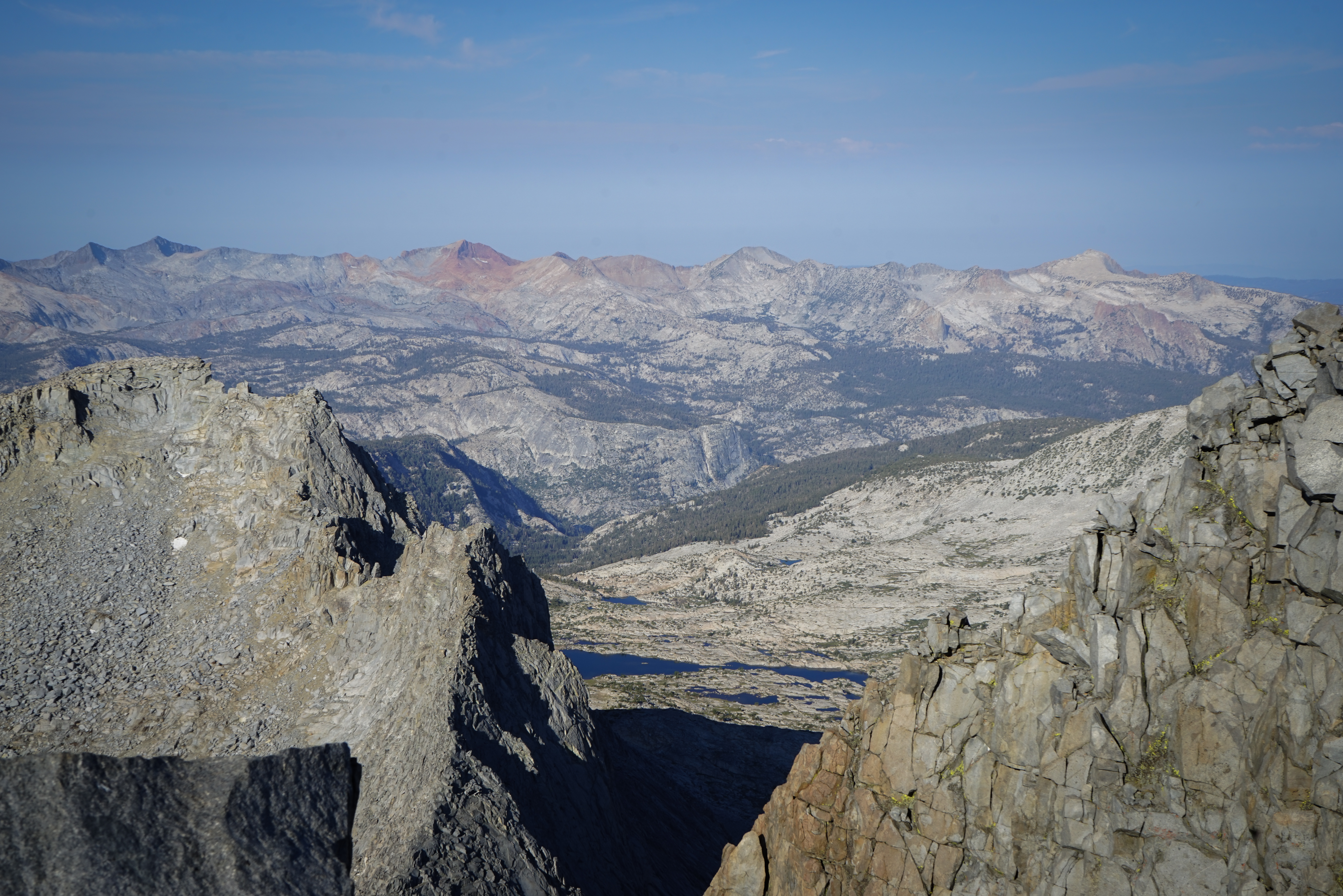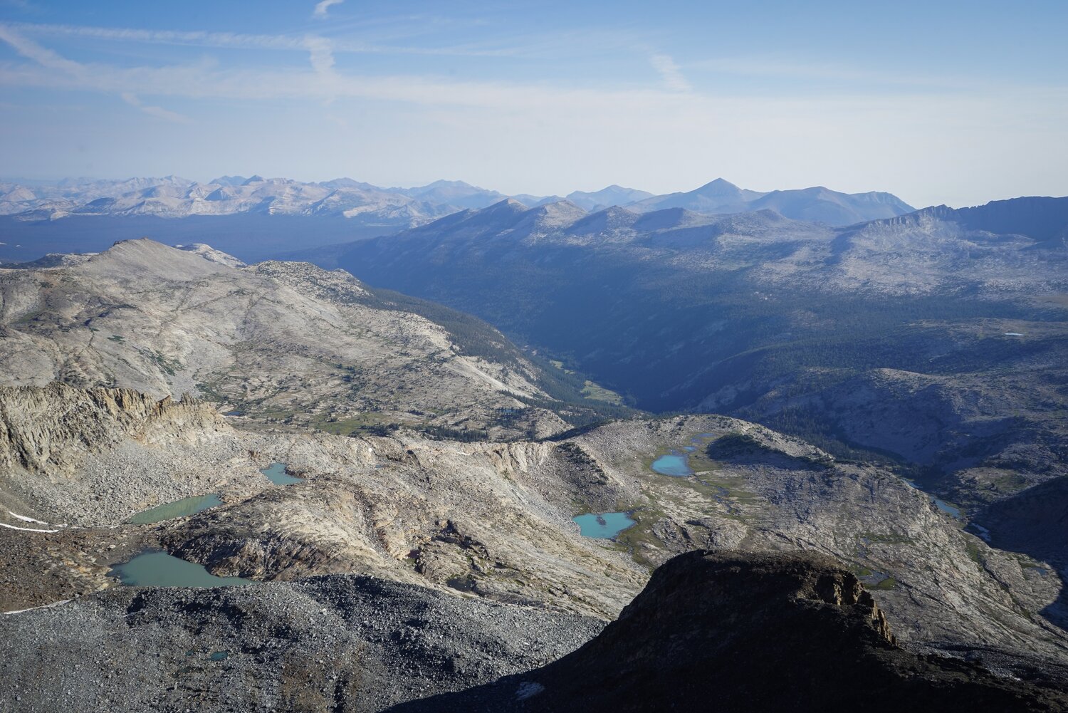 Looking north over Lyell Canyon and towards Mount Conness. After negotiating the difficult rock section, we gained a talus-covered summit plateau and boulder-hopped to the summit where we were treated with an incredible view in all directions.