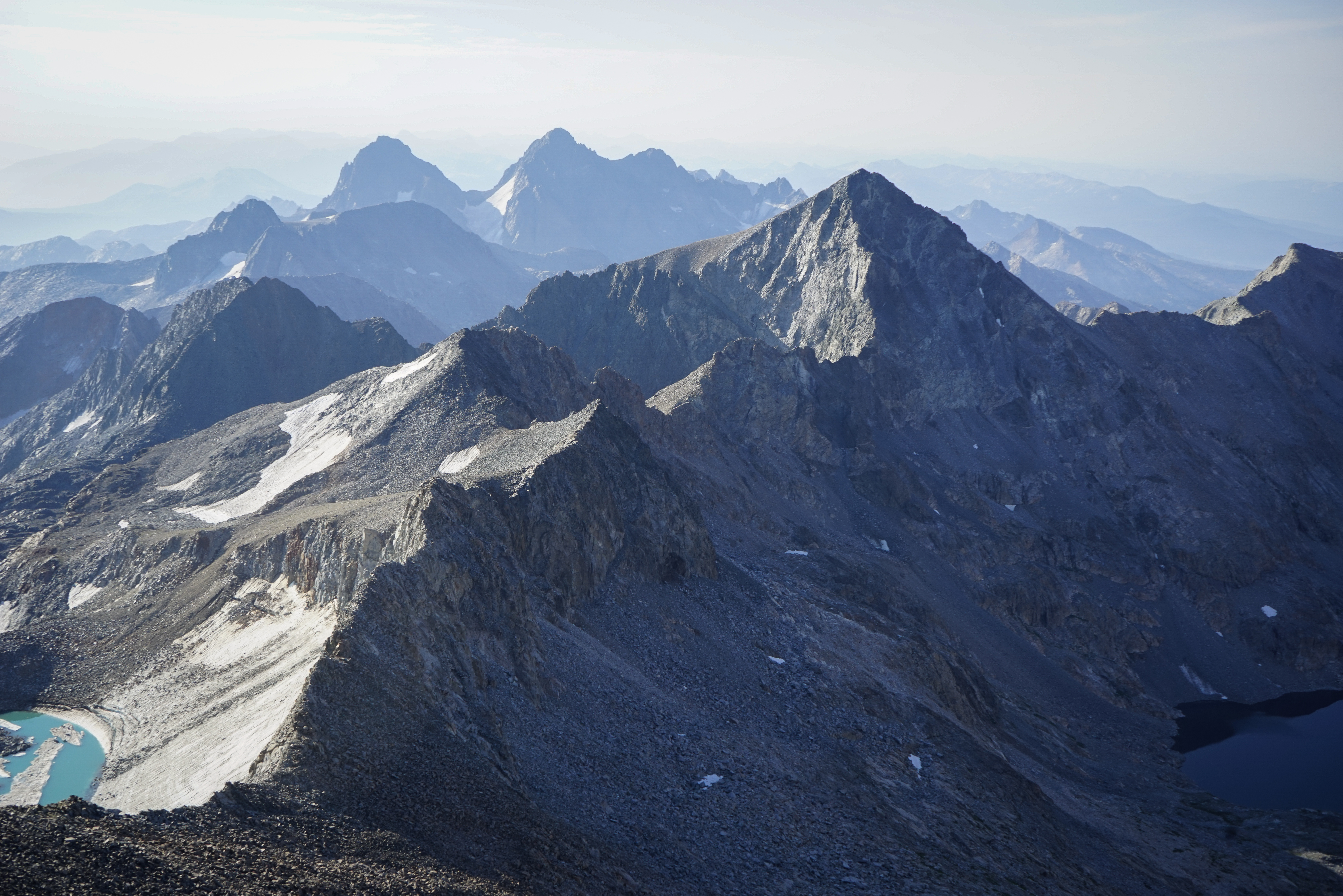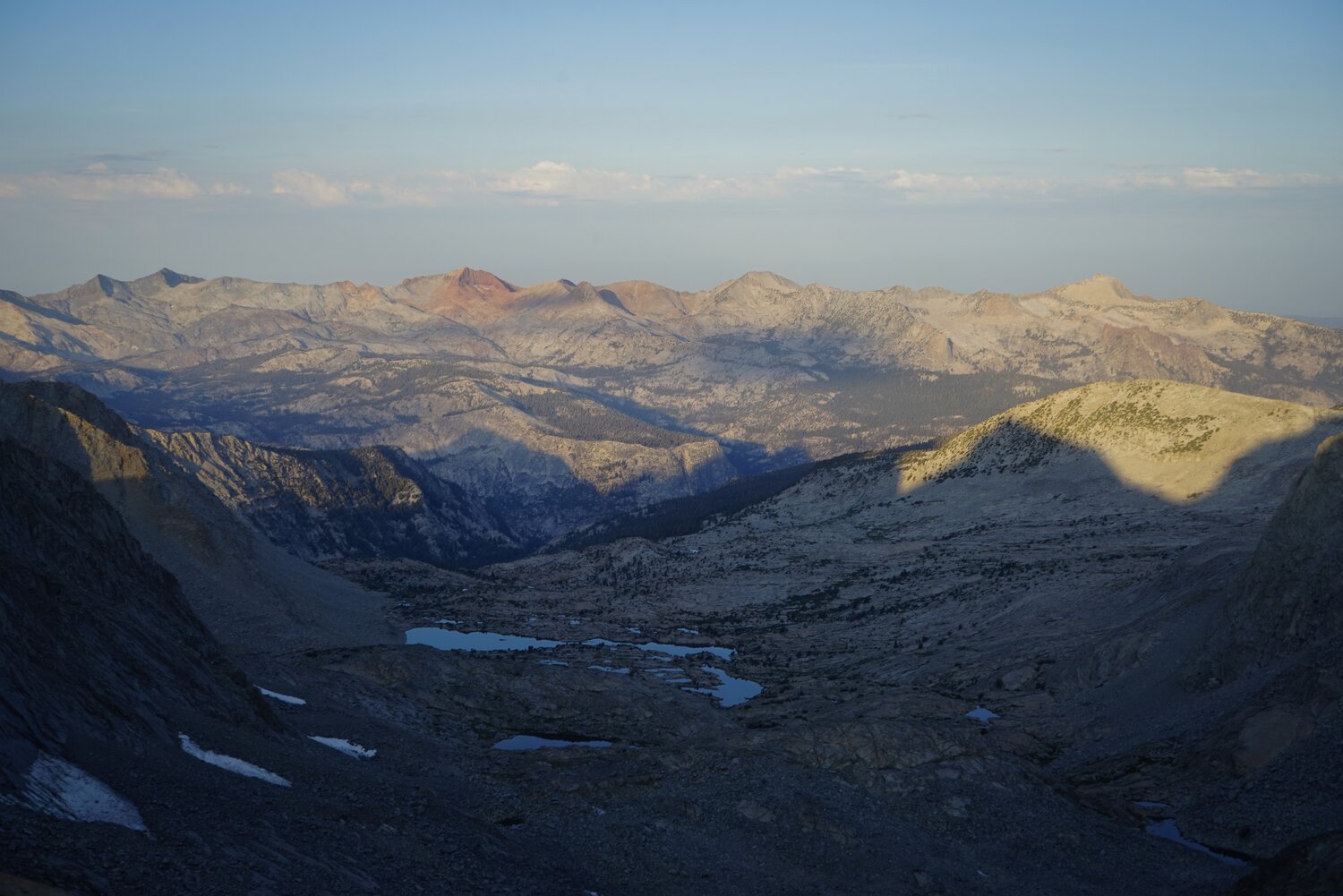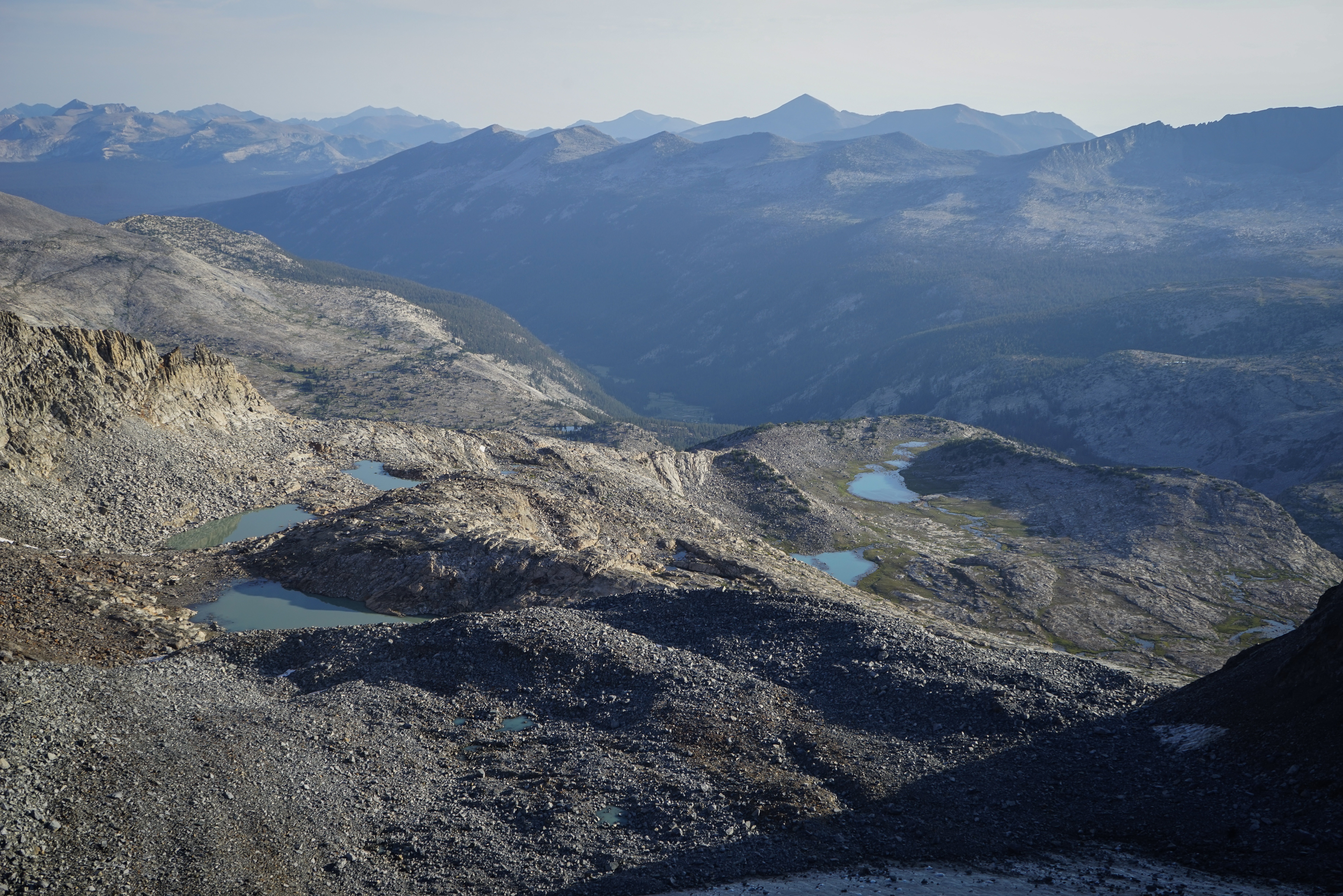 Looking north over Lyell Canyon and towards Mount Conness. After negotiating the difficult rock section, we gained a talus-covered summit plateau and boulder-hopped to the summit where we were treated with an incredible view in all directions.