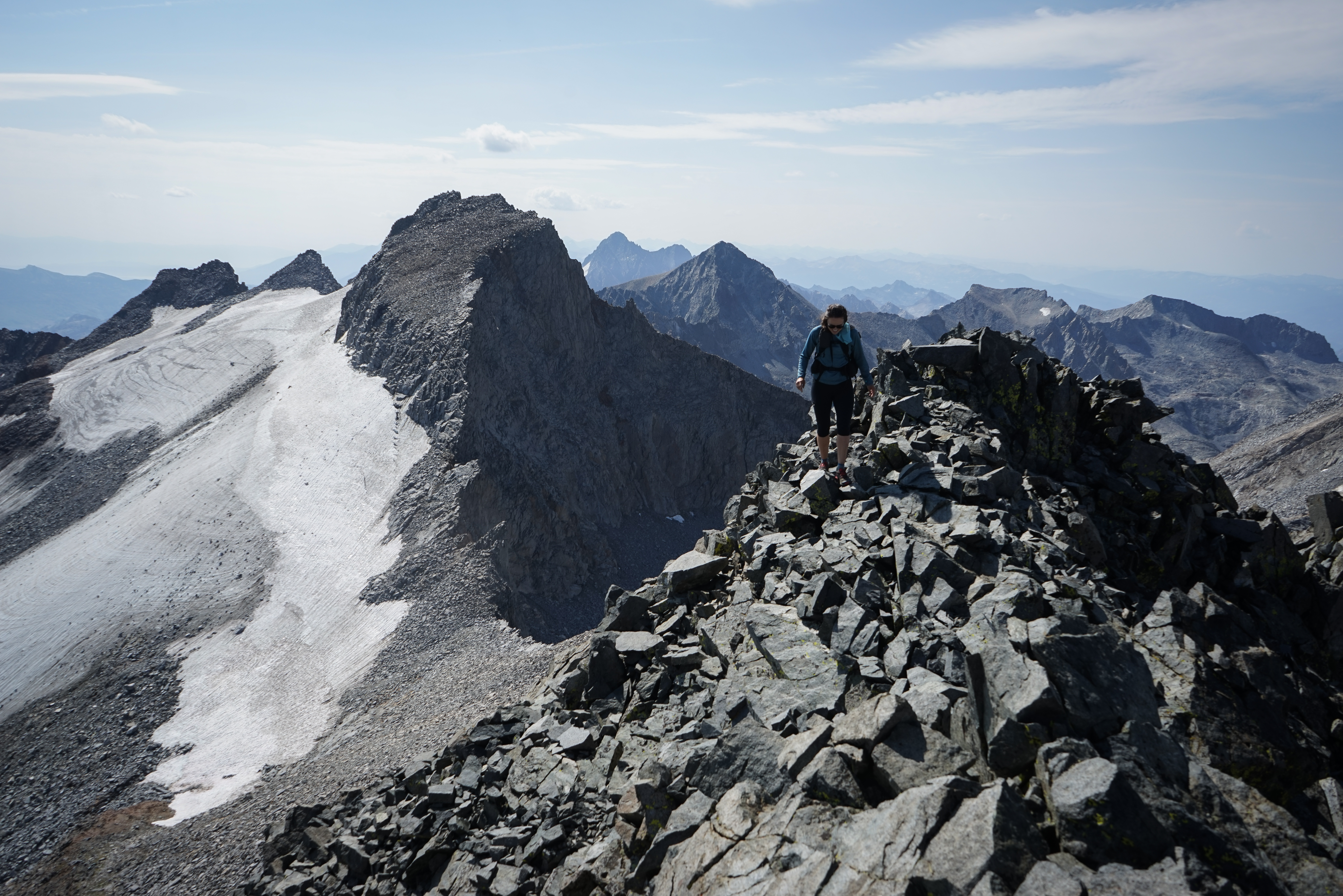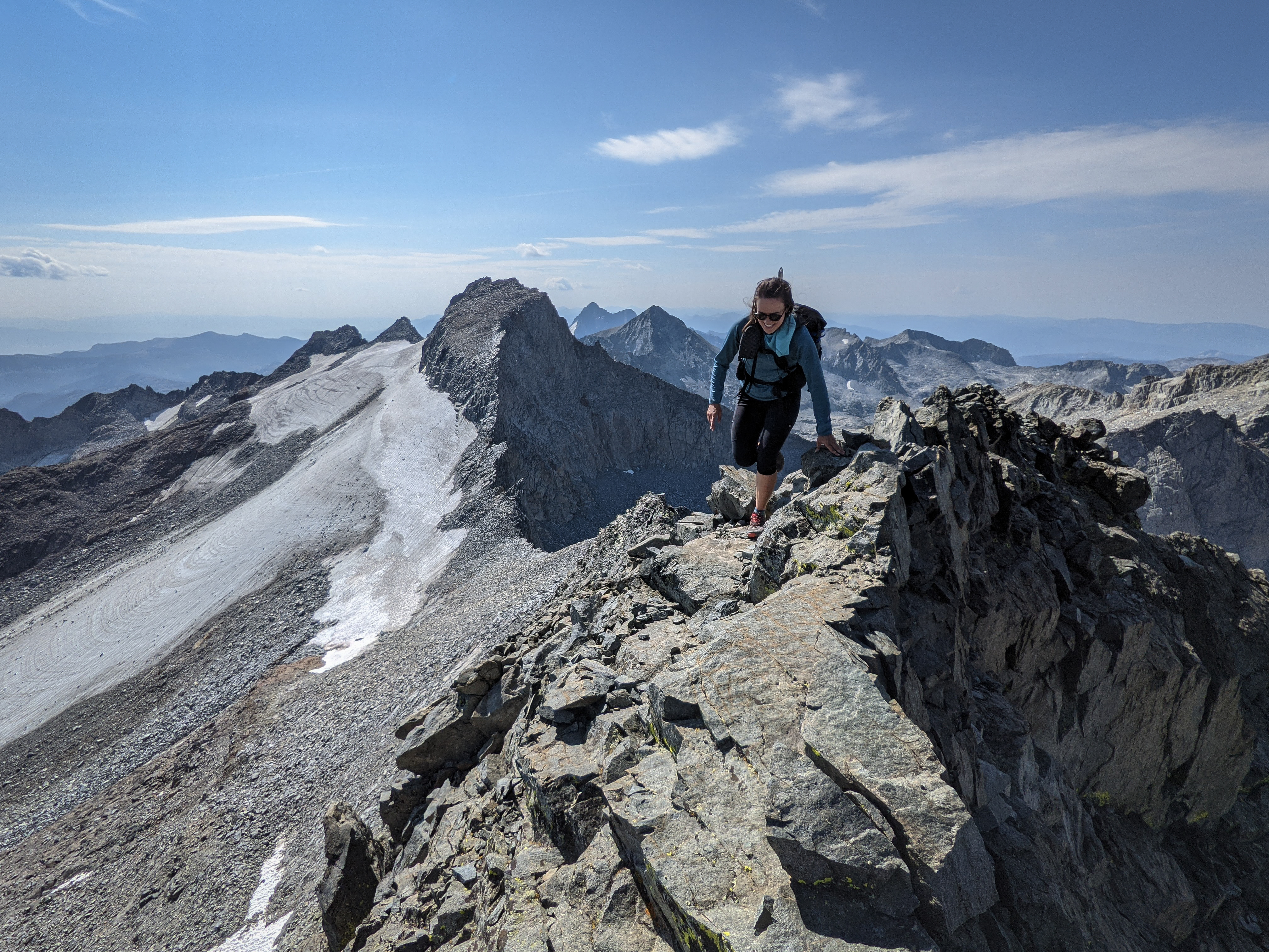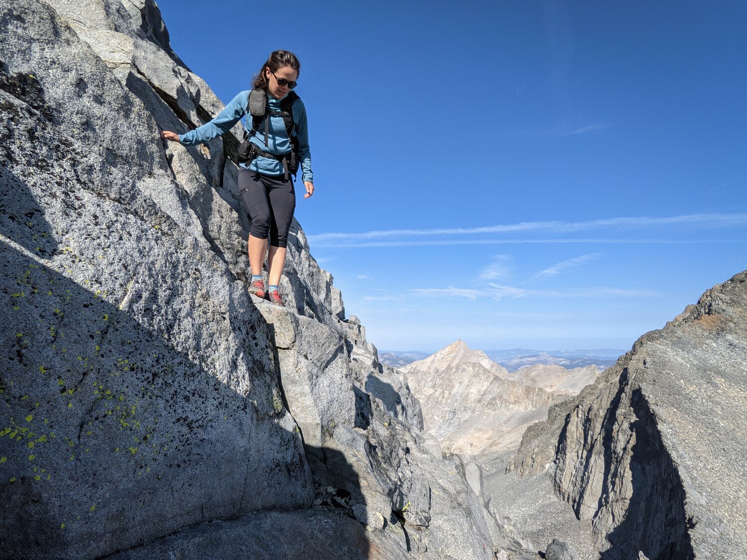 Shannon climbing on the final ridge traverse to the summit of Mount Maclure.