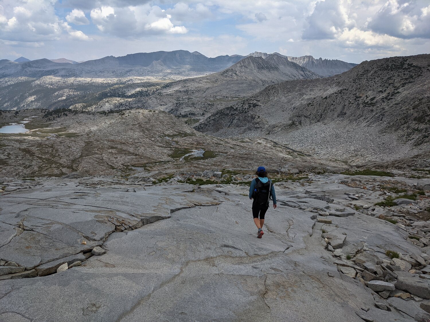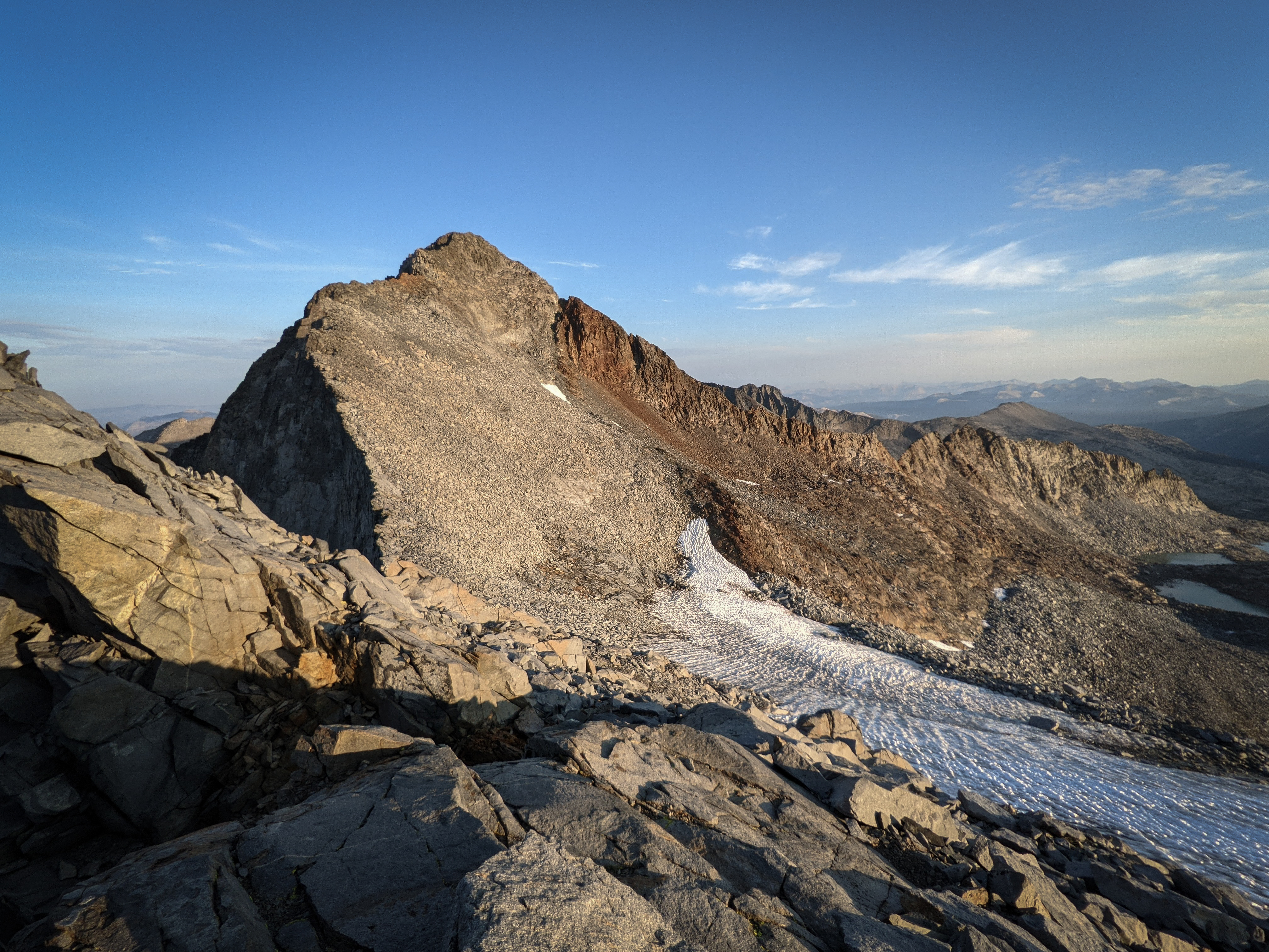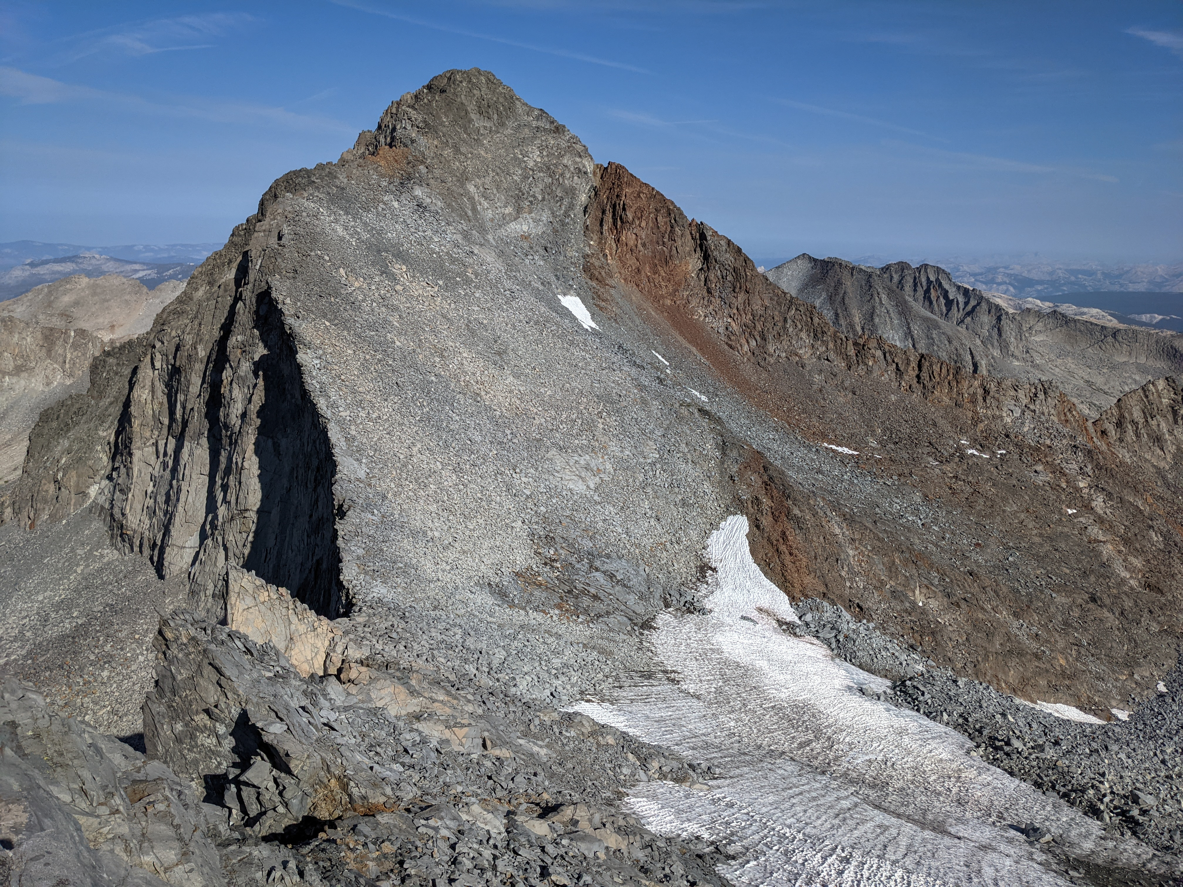 Mount Florence, with Half Dome peeking out behind, from the summit plateau of Mount Lyell. Soon we were back in the difficult section, taking care to try and find the easiest route down. It was a little bit easier to find it from above, and our memory of the route up helped as well.