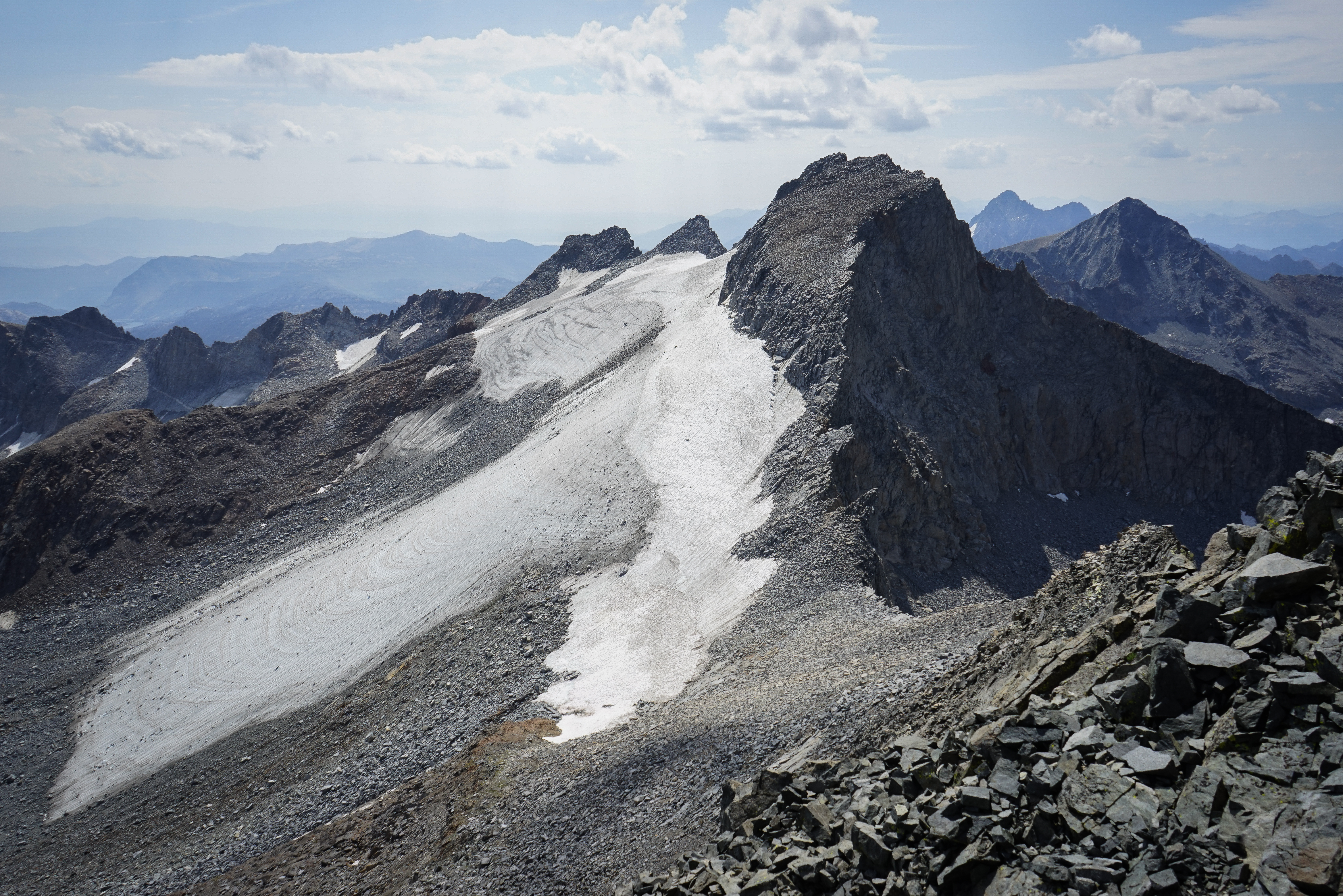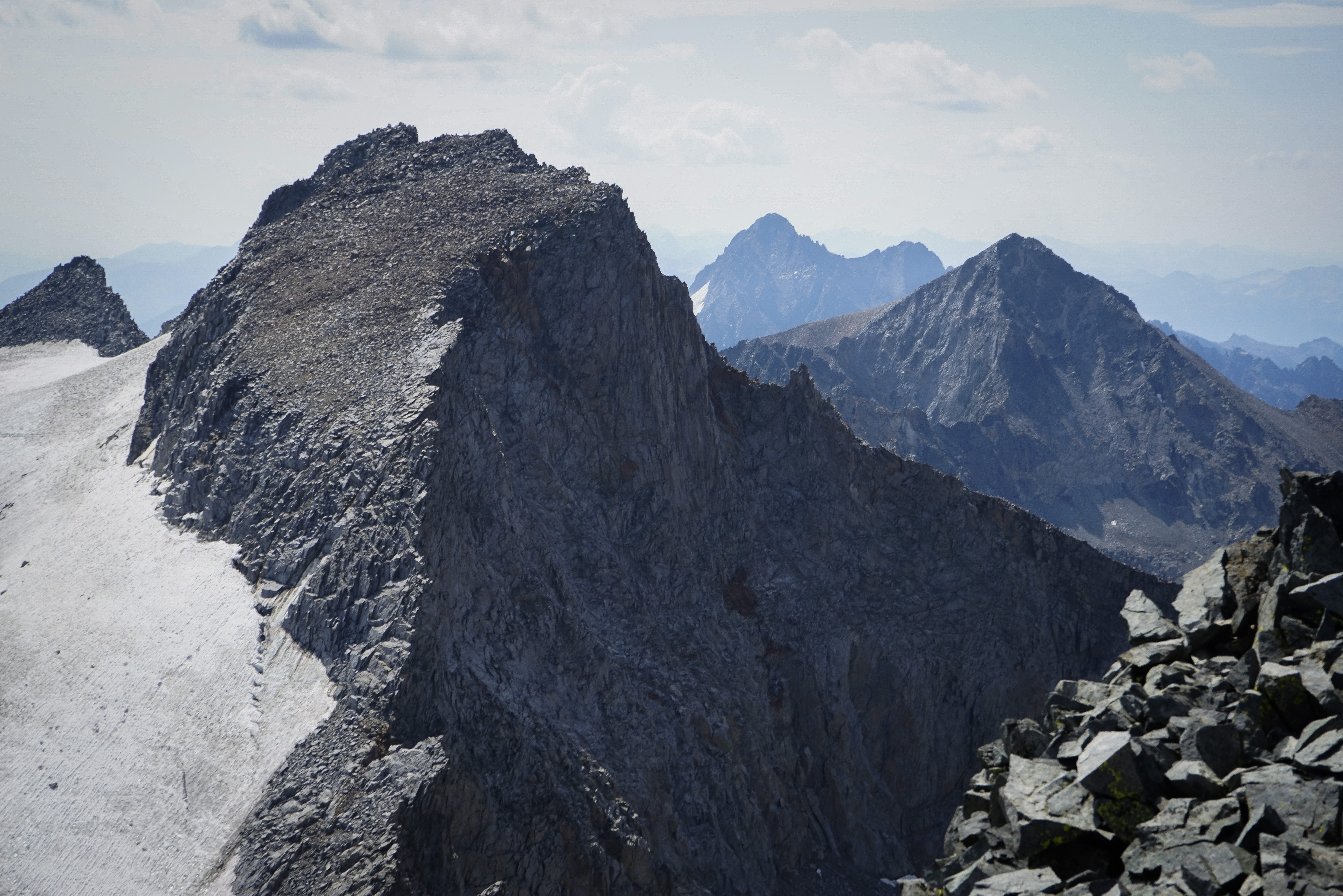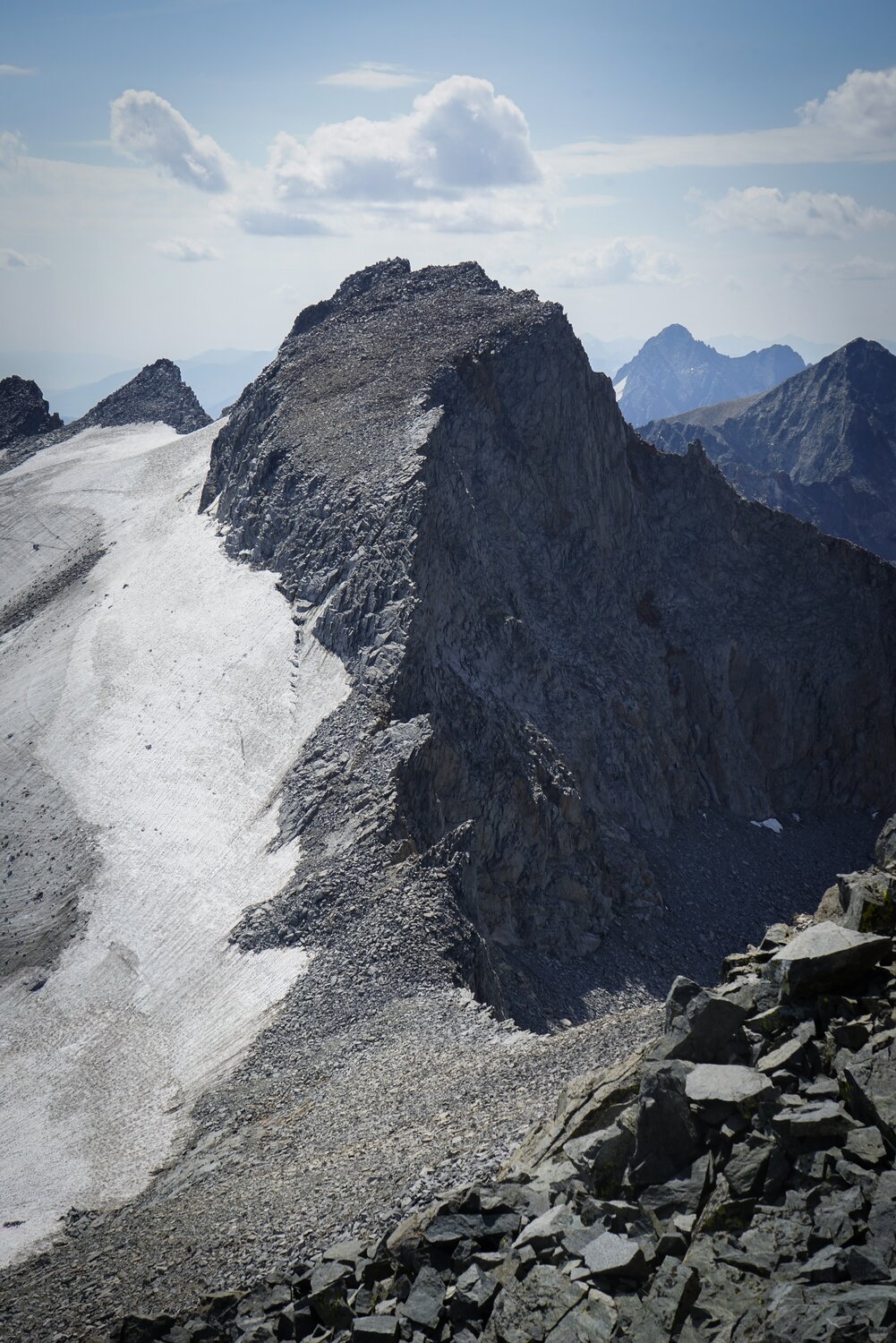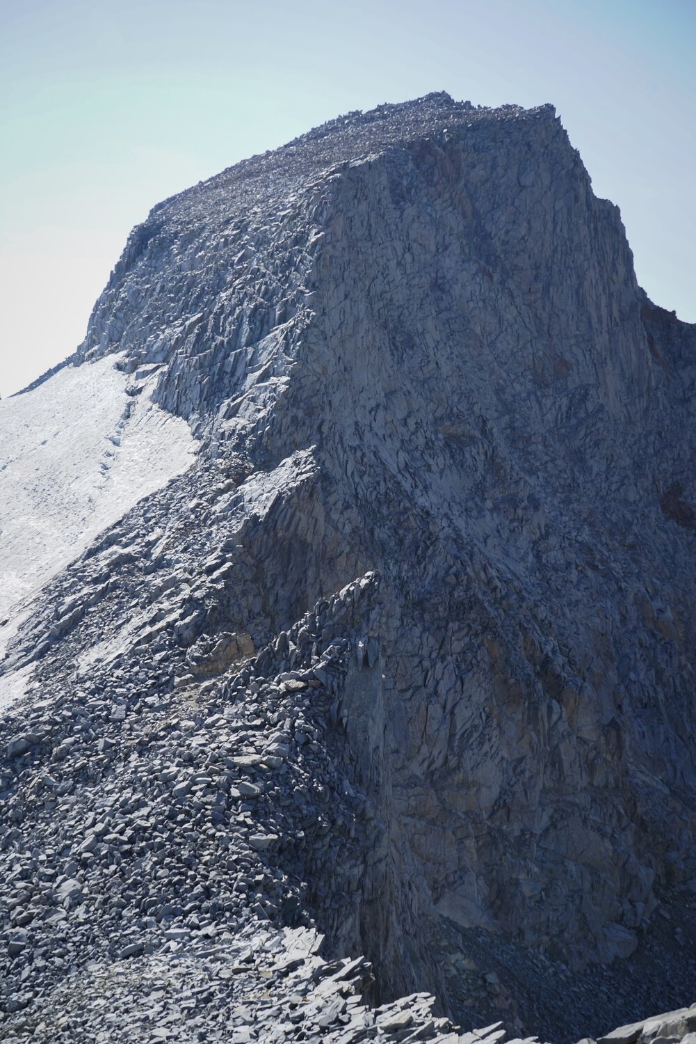 Mount Florence, with Half Dome peeking out behind, from the summit plateau of Mount Lyell. Soon we were back in the difficult section, taking care to try and find the easiest route down. It was a little bit easier to find it from above, and our memory of the route up helped as well.