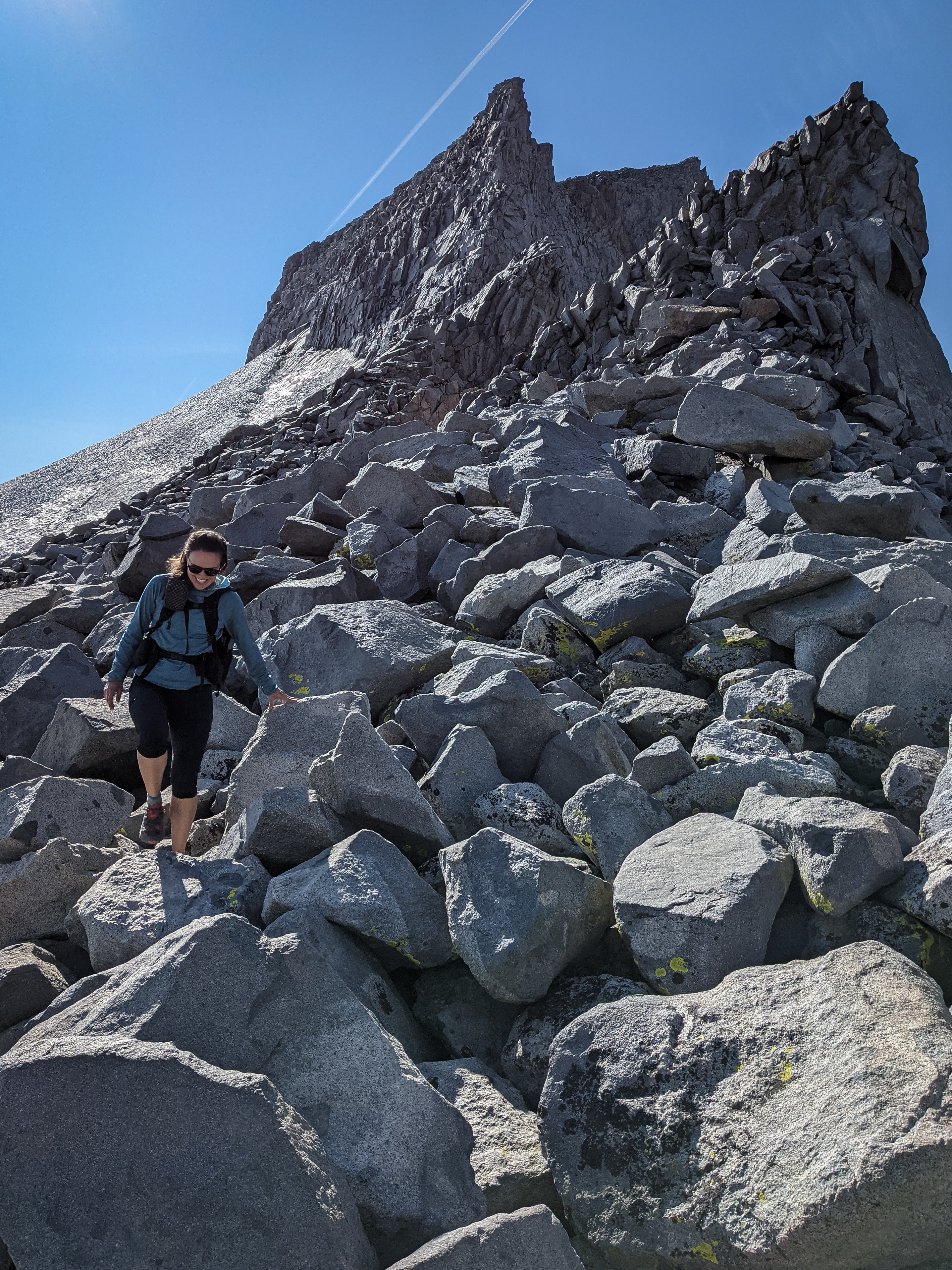 We were headed down again after a snack and drink, traversing across the ridgeline, and then carefully downclimbing the loose sections back towards Lyell-Maclure Col. We headed a little bit more directly down, when we thought the terrain looked easy enough.