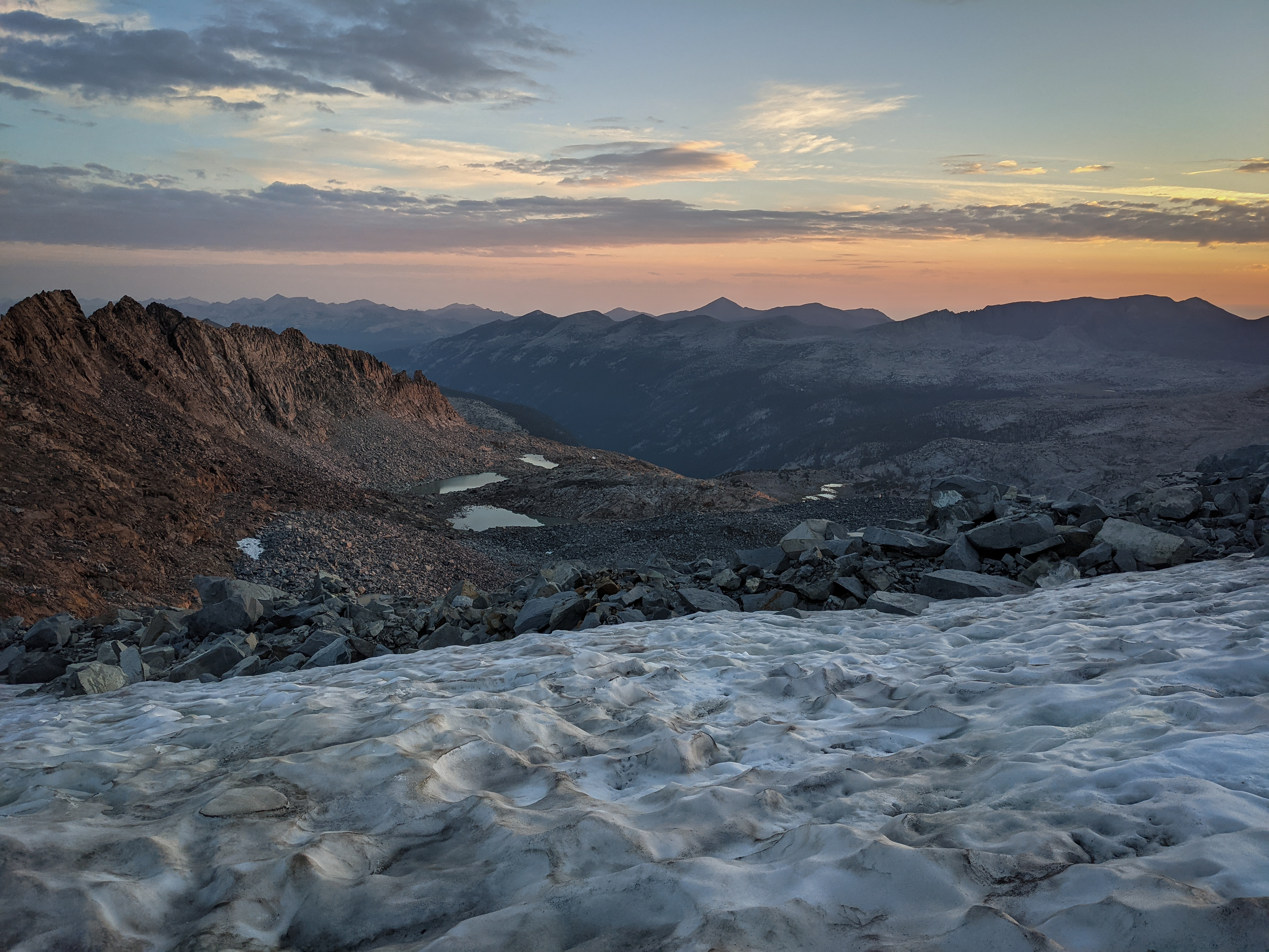 The Lyell Glacier with meltwater from below. Soon, we rock-hopped back across the moraine and found our way down the slabs back towards camp. It was much easier to find a simple route in the light, though it was still a bit steep.