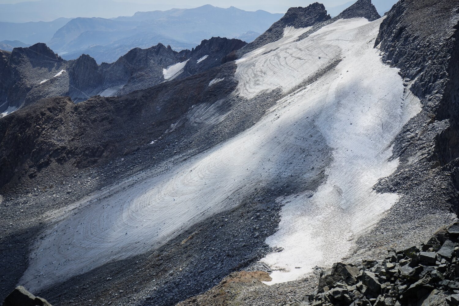 The Lyell Glacier from above. I thought it was pretty near to see the curved cracks in the ice, suggesting that it’s still flowing.