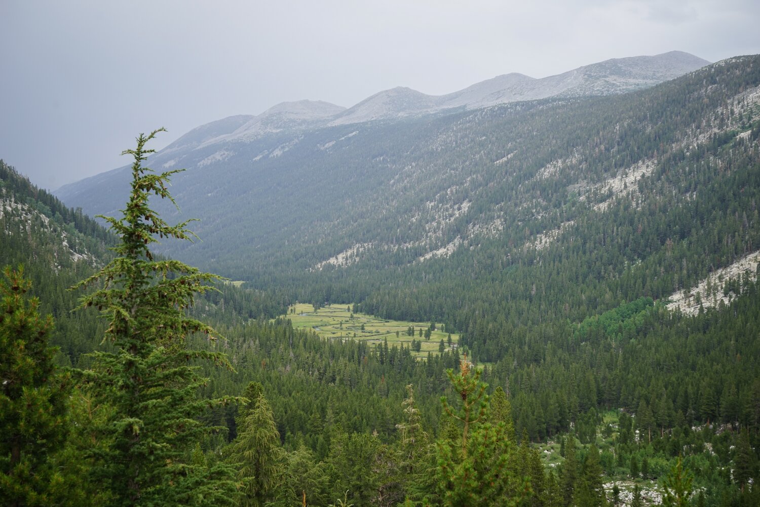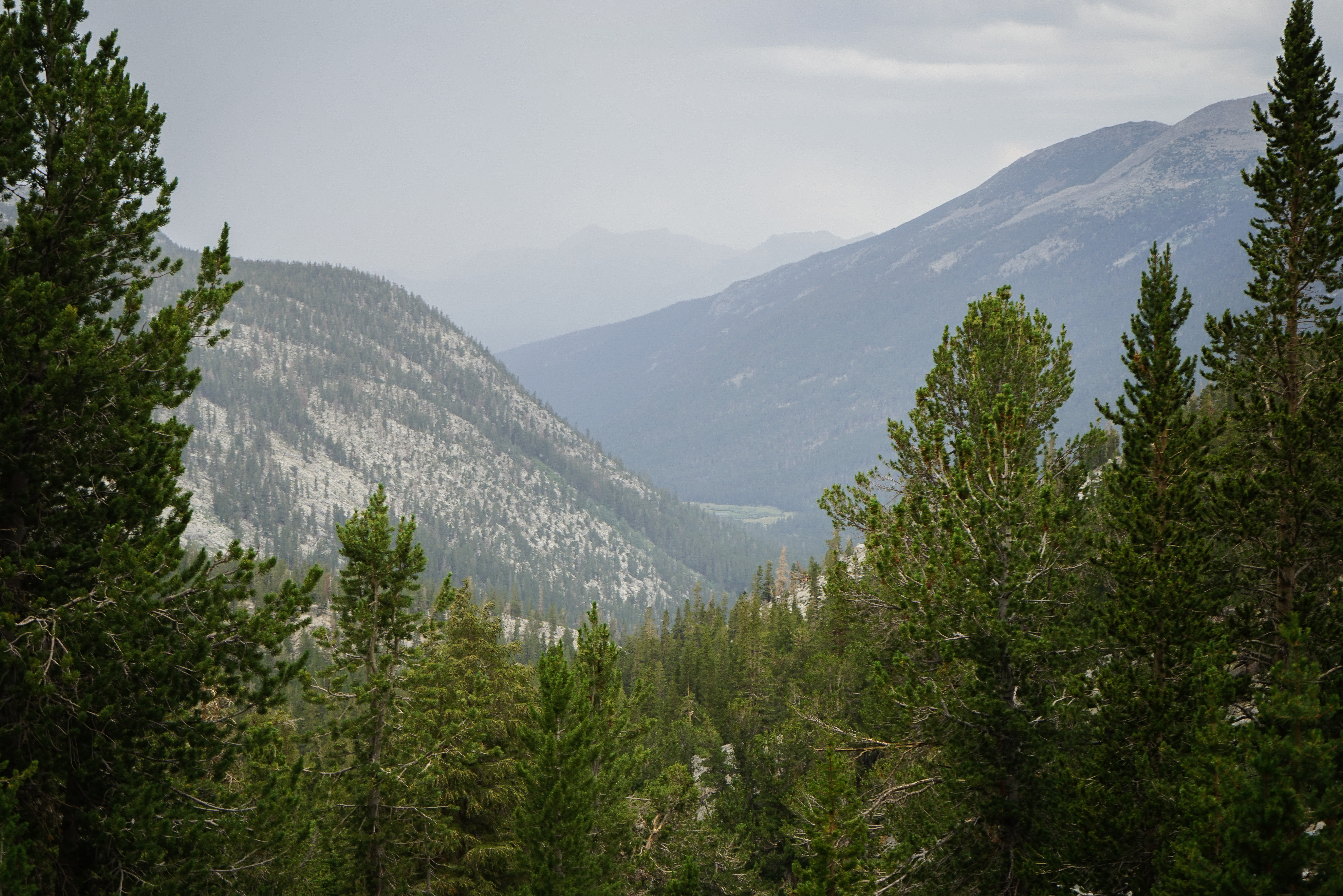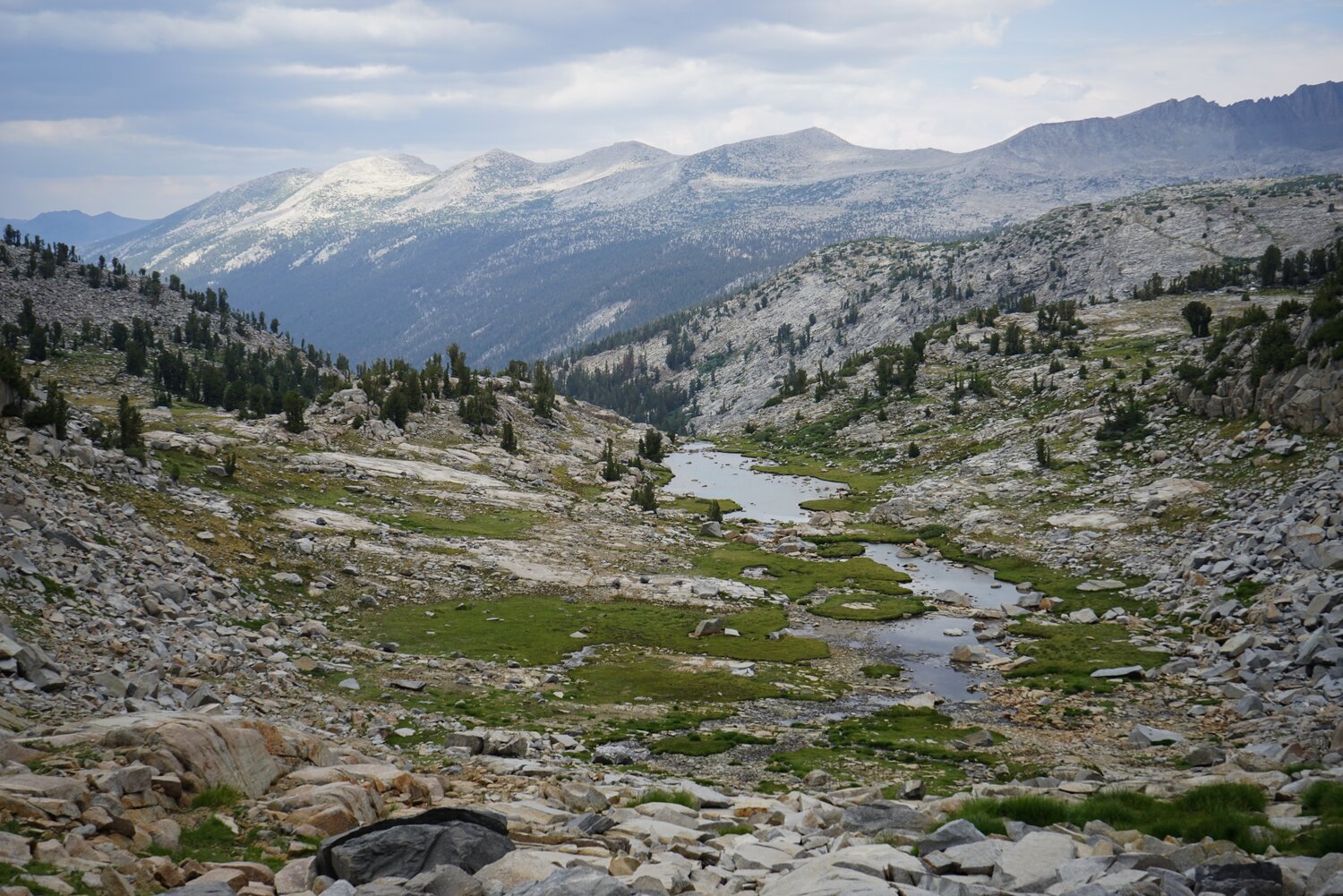 Looking down towards the meadows of Lyell Canyon from above. We passed a couple of groups heading up for Donohue Pass, but it wasn’t terribly busy. We took a break for more water and a snack once we reached the head of Lyell Canyon. It rained just enough to make us pull out our raincoats, but let up before long.