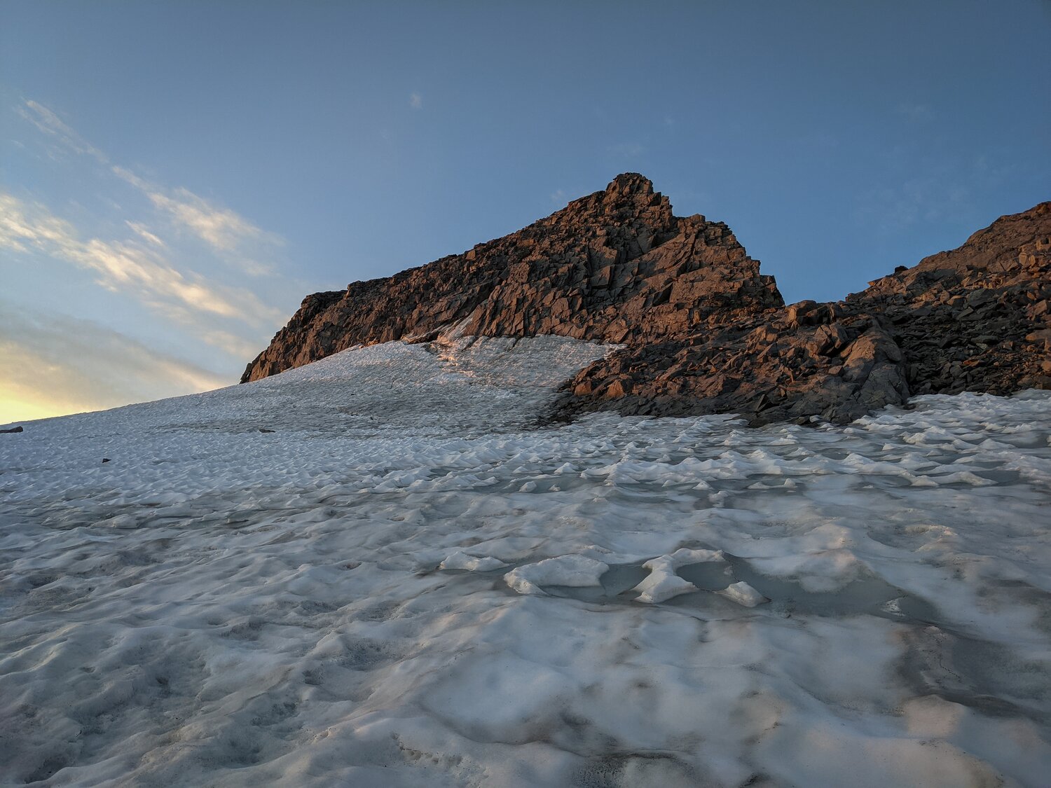 Unfortunately, right around this time we hit a bit of an impasse. The ice was becoming steeper and harder than our microspikes could be trusted on and we had slipped a couple of times already. We didn’t trust our footing for a short descent. We had accidentally made the rookie mistake of climbing into a position we couldn’t descend from. Classic! We were less than 50 feet horizontally from stable rock, but felt unsafe moving in any direction. After a minute or so of trying to problem solve, I came up with an idea. The problem was that the ice was smooth and very hard and our puny microspikes weren’t biting into it to gain enough traction for the slope. So I pulled a trick I had read about in old mountaineering stories, before crampons were invented, and began chopping steps into the glacier. By chopping up the hard ice so it became more textured and levelling out the foot-holds, we got much better traction. We headed directly right for the rocks, as that was the shortest way out of our predicament, but it took about 20 minutes of bent-over hacking away with my ice axe. Soon enough we reached the rocks and put away all our useless snow gear. We felt quite embarrassed by our silly mistake and glad that no “real” climbers had been around to see us chopping away at the glacier. At least we had realized it while it was still solvable. After a short break to shake off our mistake, we continued up.