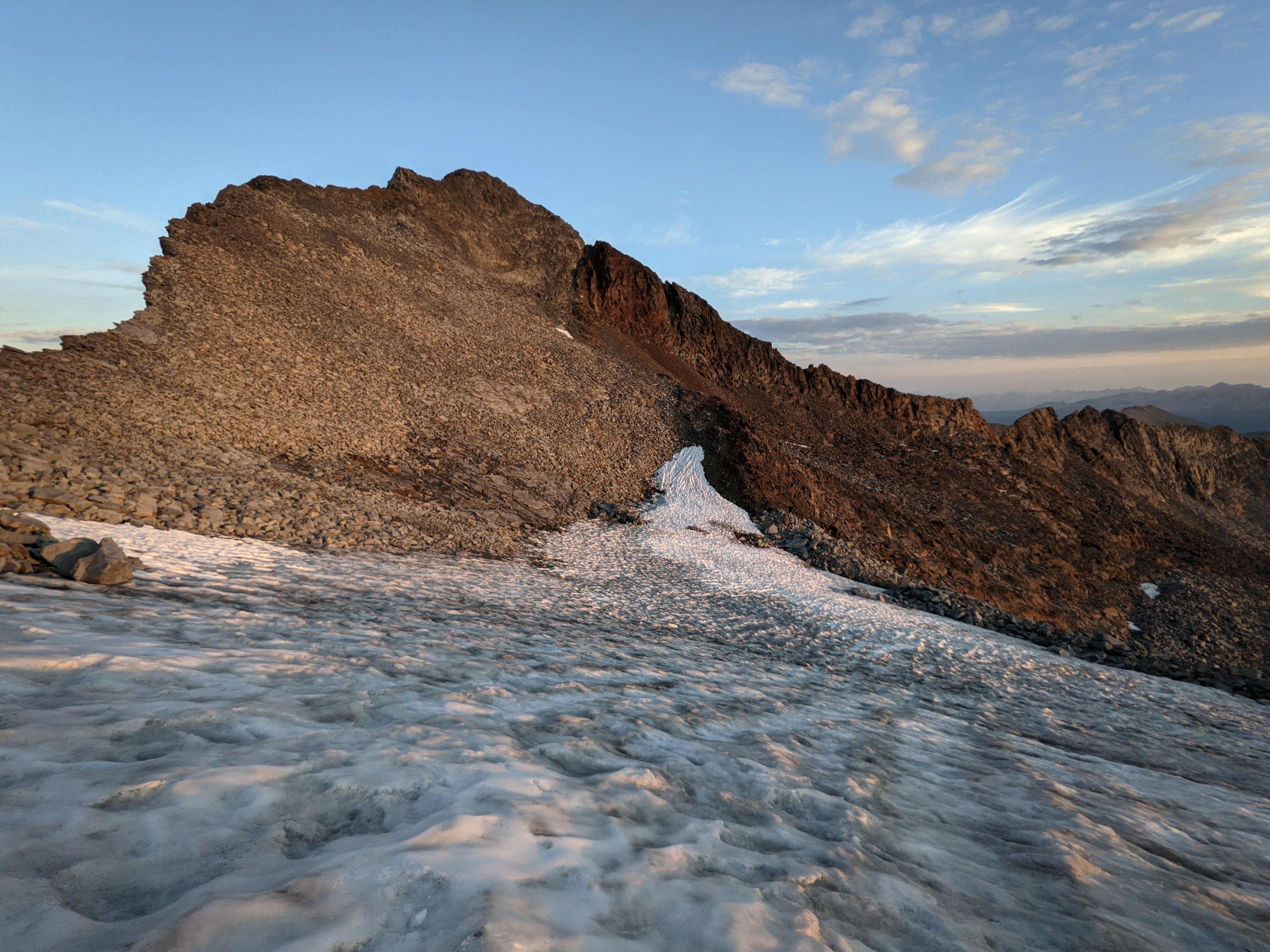 The routefinding was not easy in the dark. Fortunately it was very easy travel over large slabs and if we just went up we were mostly heading in the right direction. We zigged and zagged up towards the glacier, looking for the easiest routes that we could see in the limited light. Eventually we made it to about 11,800’ where the easy climbing transitioned to talus and we began hopping from rock to rock in the predawn light.