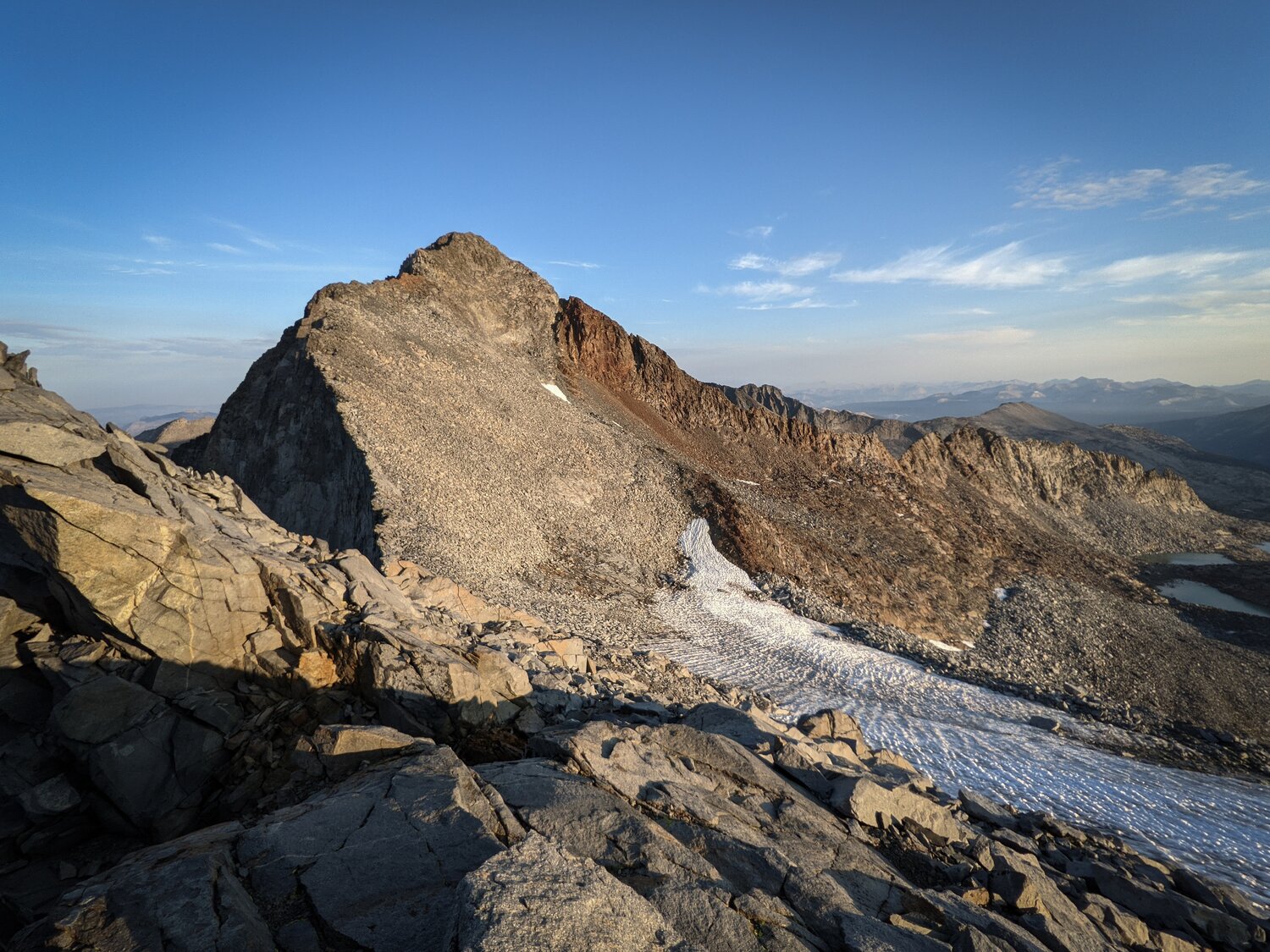 Now we faced our next challenge, how to negotiate this very steep looking 200’ of climbing. We tried several different routes up the face: first I tried sticking to the far right, which was the worst option by far; then we tried a little bit to the left of that (just right of the shadow in the photo), but a 20’ cliff blocked that route; then we tried cutting to the left but that way cliffed out with a 50’ drop off below; our final, successful attempt involved climbing left for a little bit and then going up through some broken rocks before cutting back to the right (mostly in the shadow above the cliff above the snow in the photo). It was definitely the hardest class 3 climbing I’ve done, with a few 10-20’ chimneys that we had to climb up. The holds were all great, but so was the exposure.