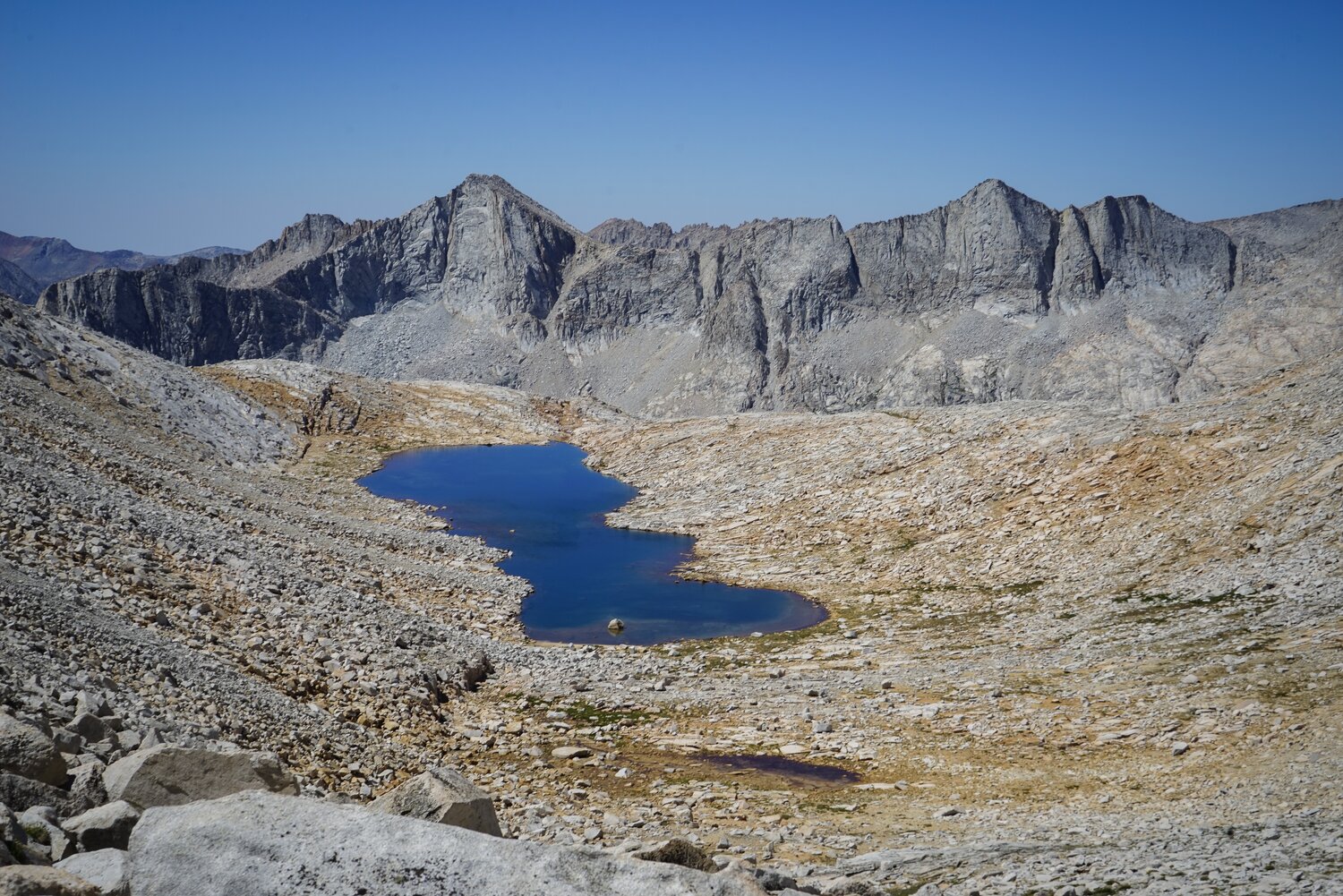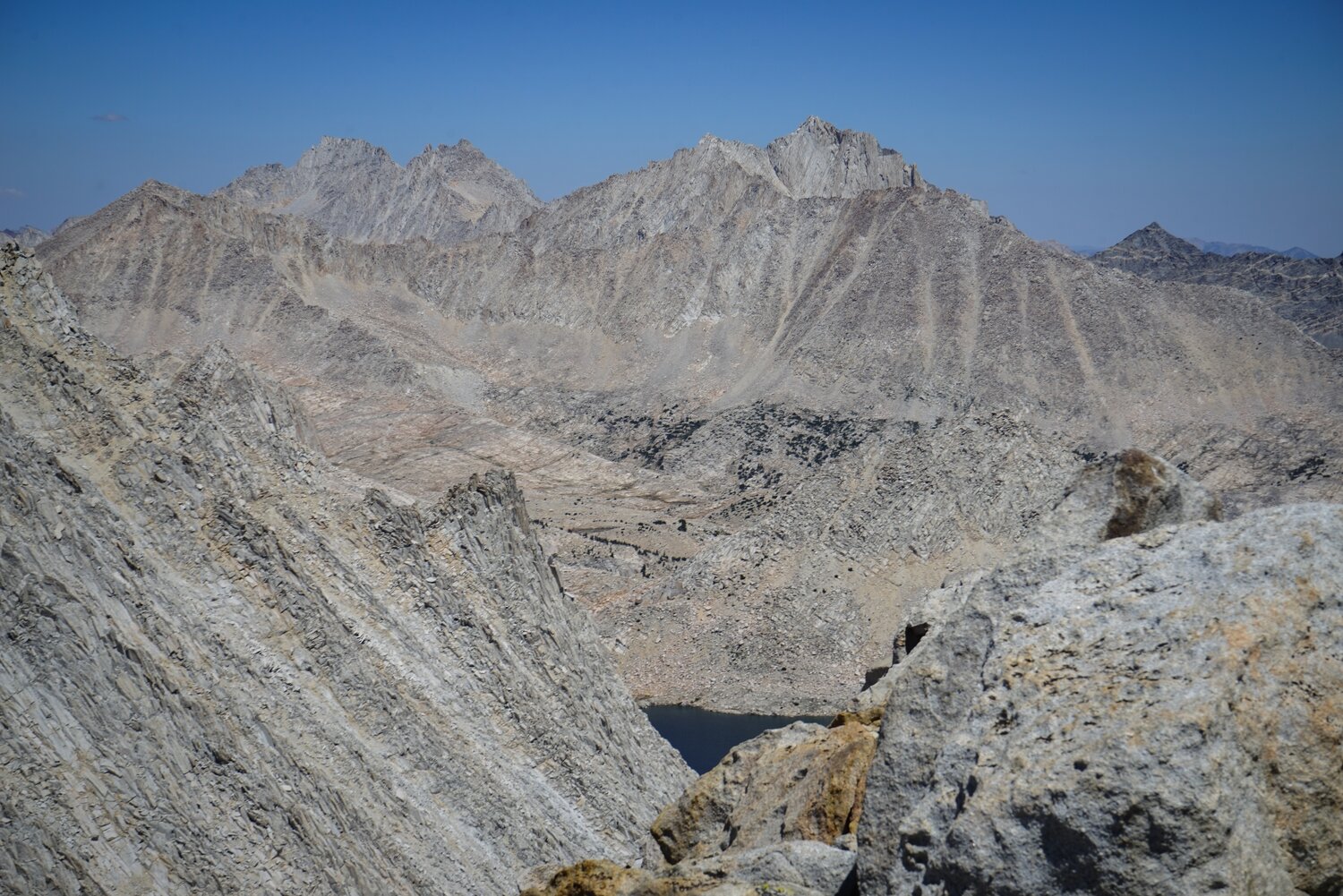 The long lake to the west, Merriam Lake, and Seven Gables from the slopes of Merriam Peak. After not too long I was back at the saddle and heading for the Royce Lakes.