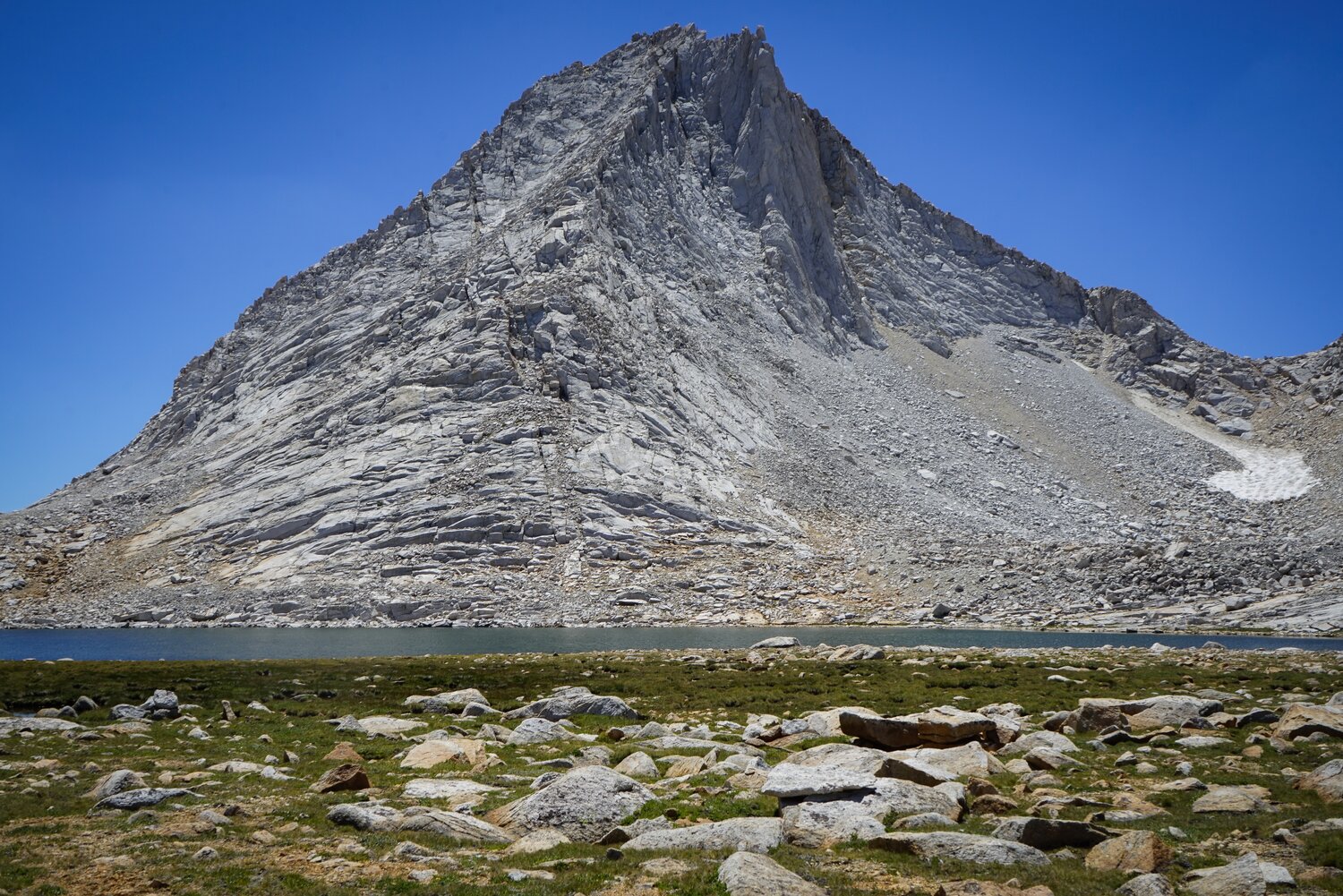 From Pine Creek Pass I left the trail, headed for the Royce Lakes. I expected most of the rest of the route to be slow going over talus, but was pleasantly surprised to find mostly open grassy benches. The travel was barely any more difficult than on the trail and I kept moving quickly.