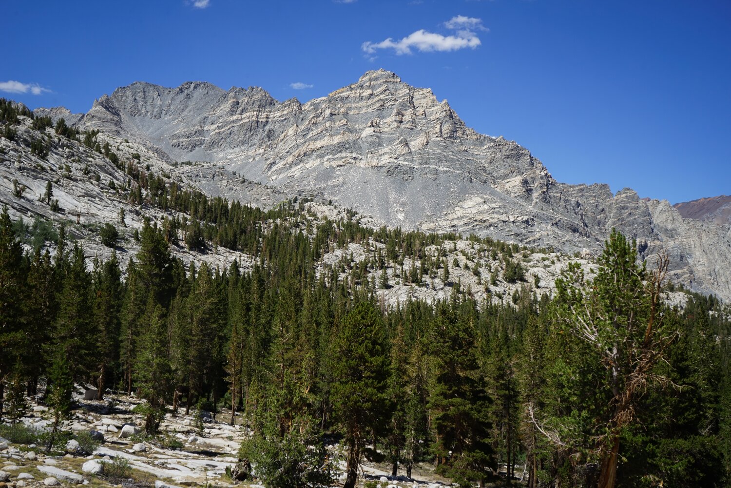 Open forest and the beautiful striped mountain that’s north of Pine Creek. Despite several attempts, I haven’t been able to find the name of this peak, if it has one.