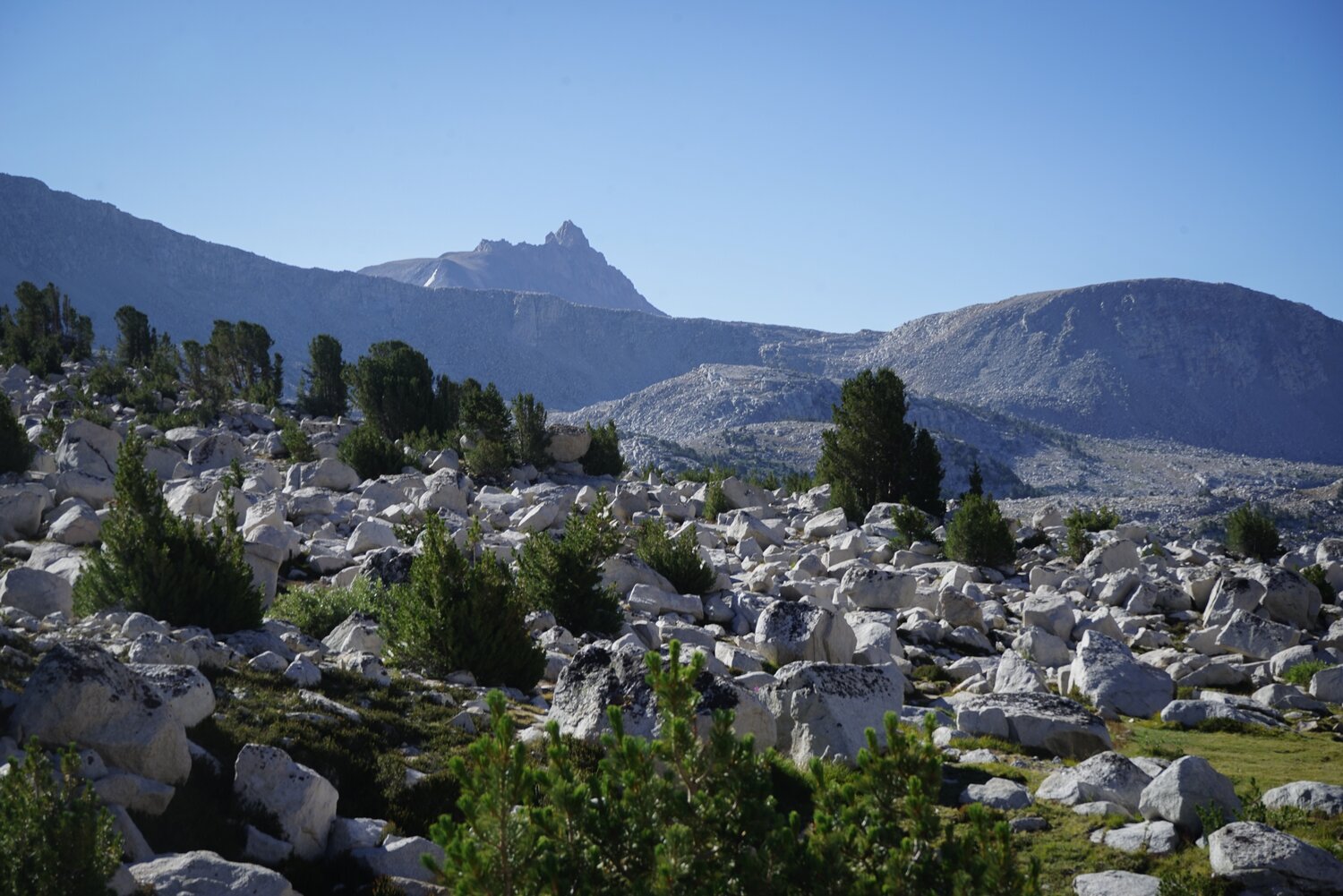 Near the top of the initial climb I ran into a family of four backpackers. I tried to negotiate a way past, but dad wanted to chat, so I obliged. They were headed across French Canyon and down Piute Pass over four or five days, so a bit more of an explorer’s pace. After some more back-and-forth, he started on a story about how he had backpacked up here many years ago and gotten caught in a snowstorm. It was becoming clear this was going to be a longer conversation than I intended, until the daughter accidentally spilled her water bottle while transferring water from one vessel to another. I took the interruption as an opportunity to continue on my way.