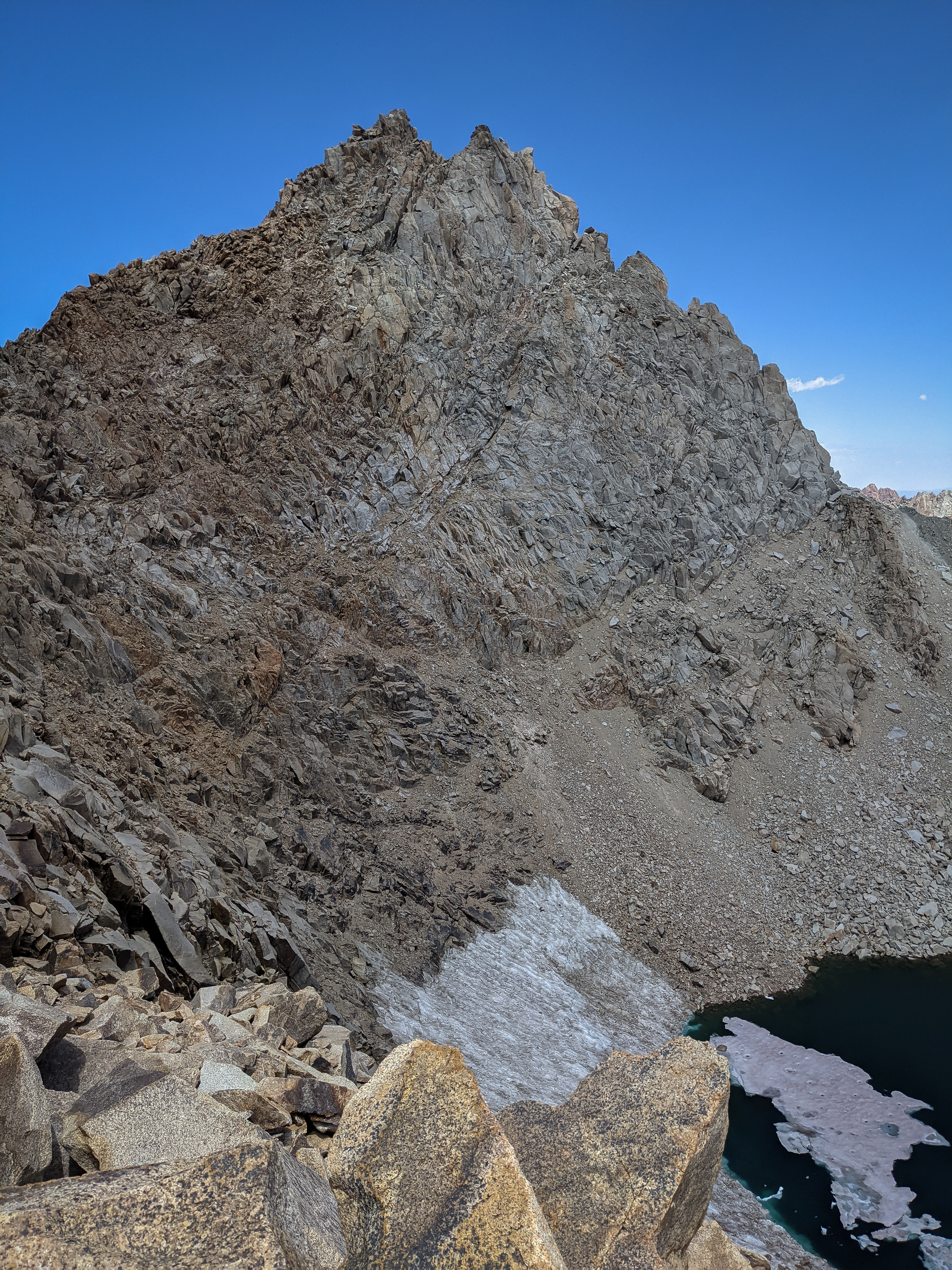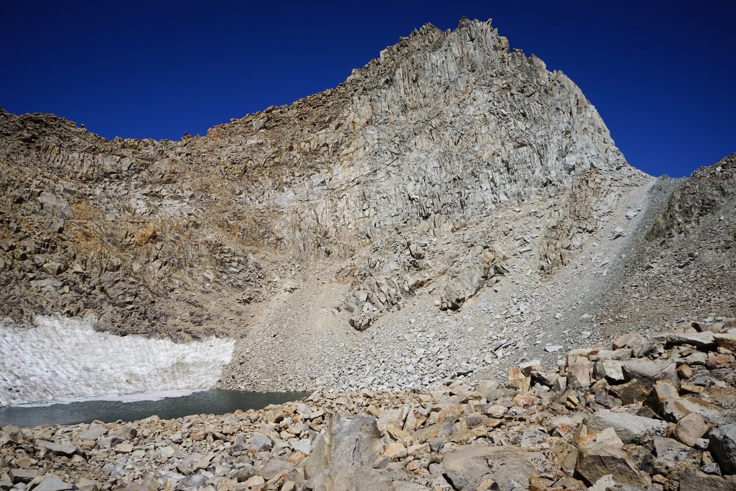 After about 45 minutes of climbing through the boulders I reached the tarn just below Mount Haeckel. The mountain looked impressive and intimidating from this angle. The East Ridge route ascends the left side of the (south) face seen here. I continued across the talus, climbed the sand slope that rises the highest, and then cut left into the orange rocks seen here.