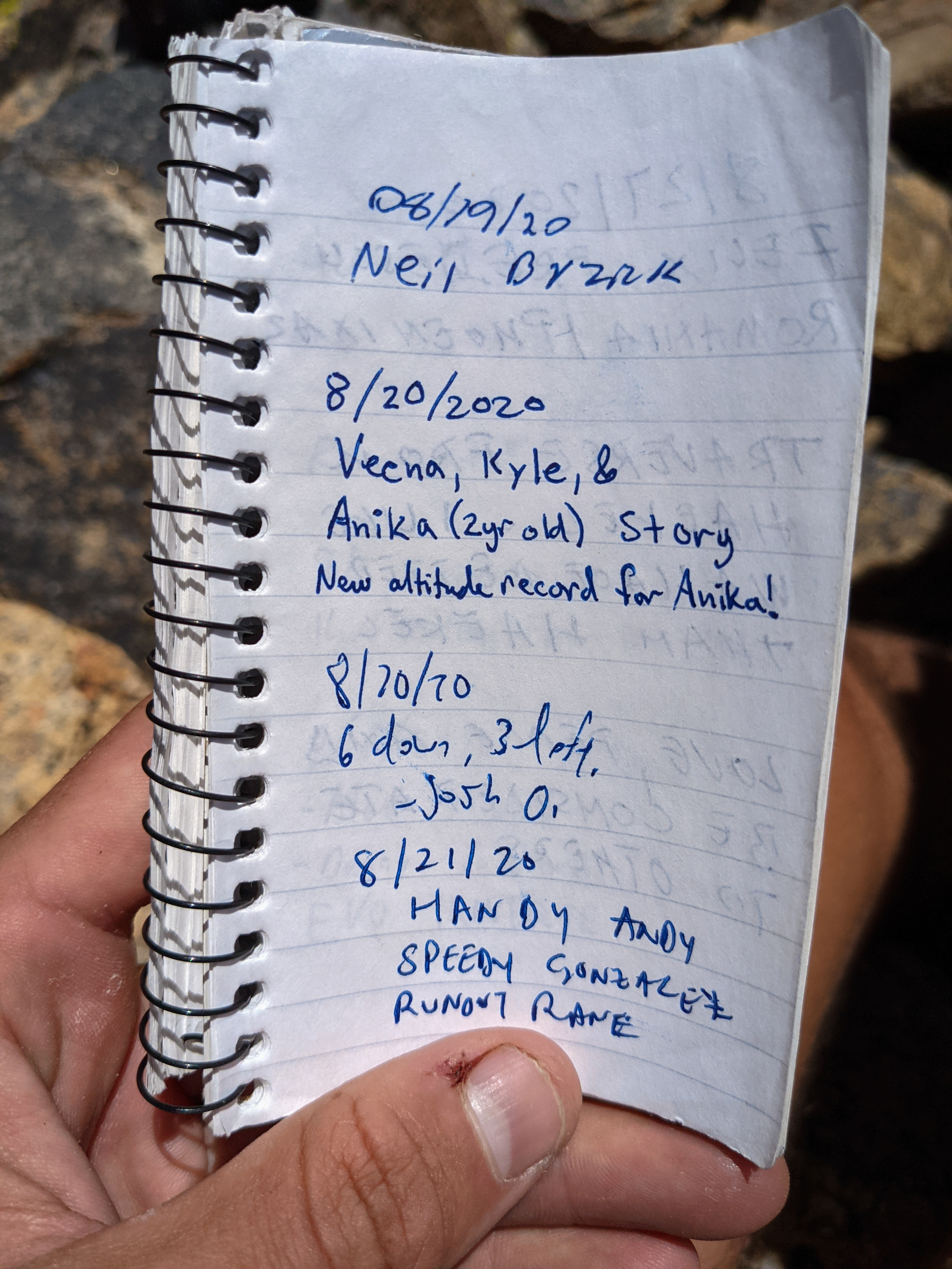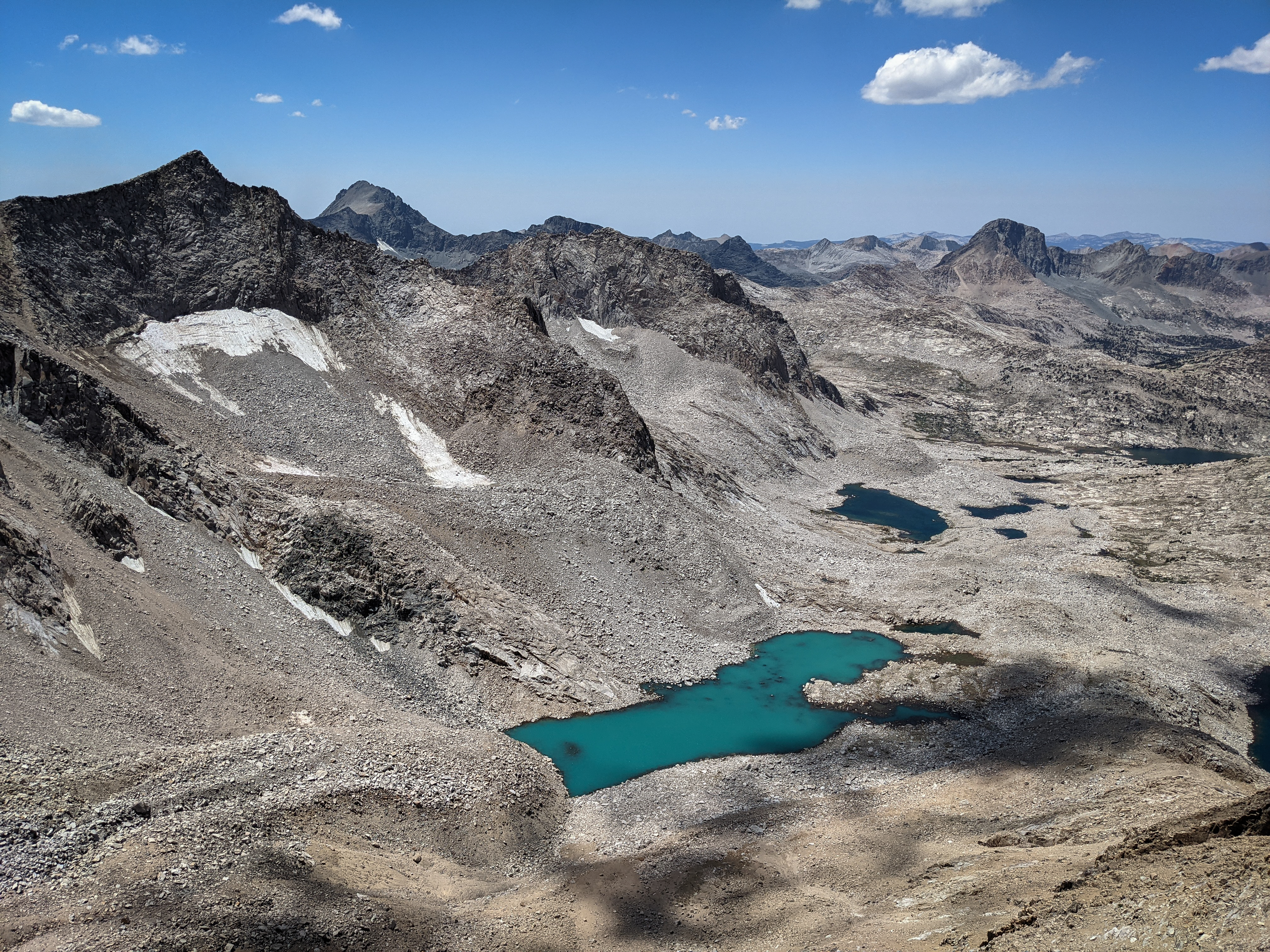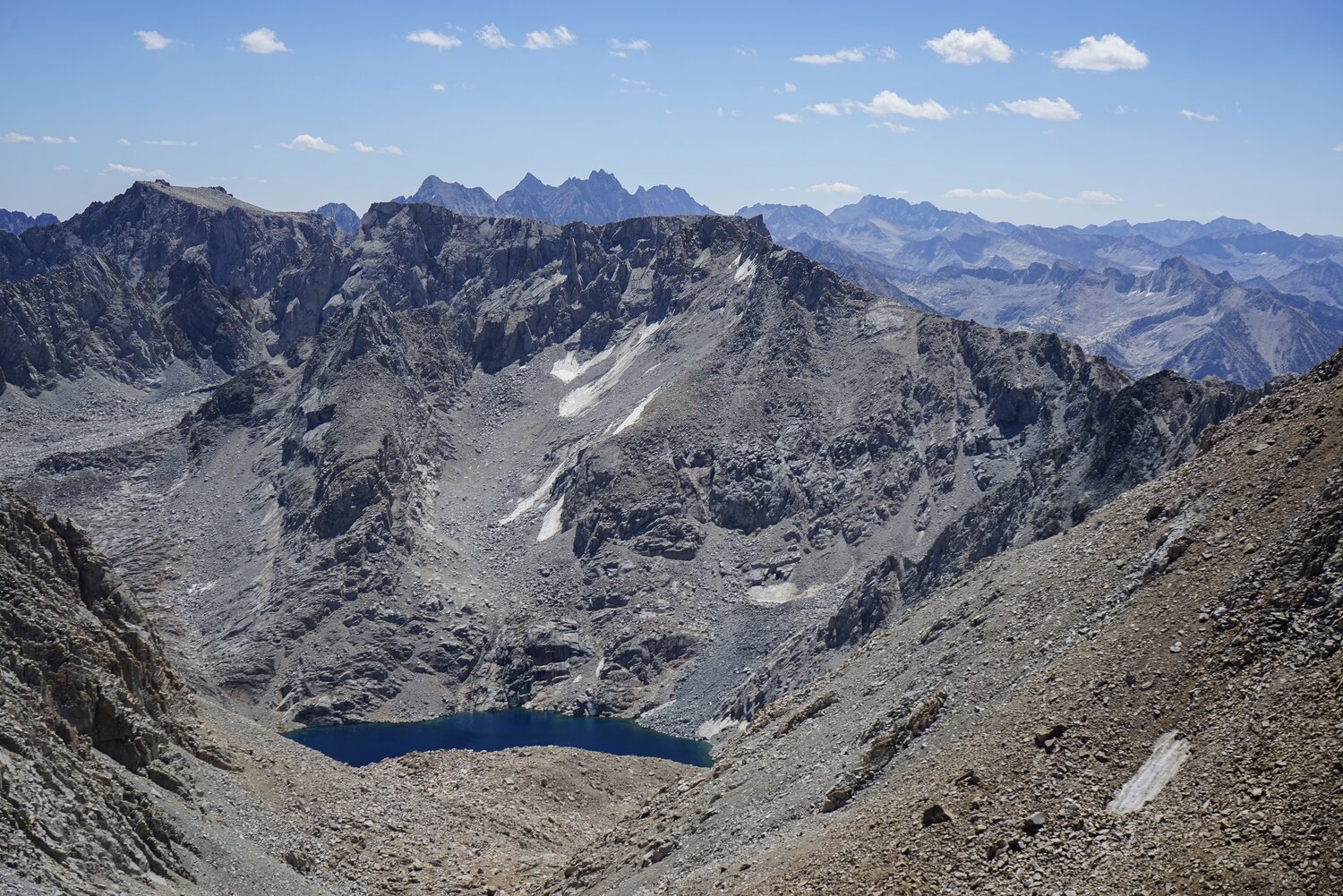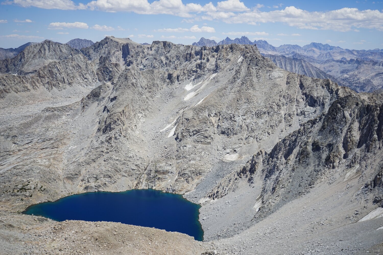 There were a bunch of entries from folks doing the Evolution Traverse, a lot more than I expected. I added my name to this little piece of history before setting off back down. I climbed down the slightly more direct Southeast Slope route, which required traversing south off of the peak and finding a suitable chute for descending. The rock on this part of the mountain was awful, which may explain why the next peak to the south is called “Crumbly Spire.” I took care to pick the least steep chute to descend, but I was knocking down small avalanches of rocks with each step. The steep upper 400’ of the descent was quite an adventure and very slow. But soon enough I reached the less steep section around 12,500’and it was just loose and not-so-steep. I sped up a bit and reached the small tarn above Echo Lake before rejoining the path I had taken up through the talus and hiked down to Echo Lake.
