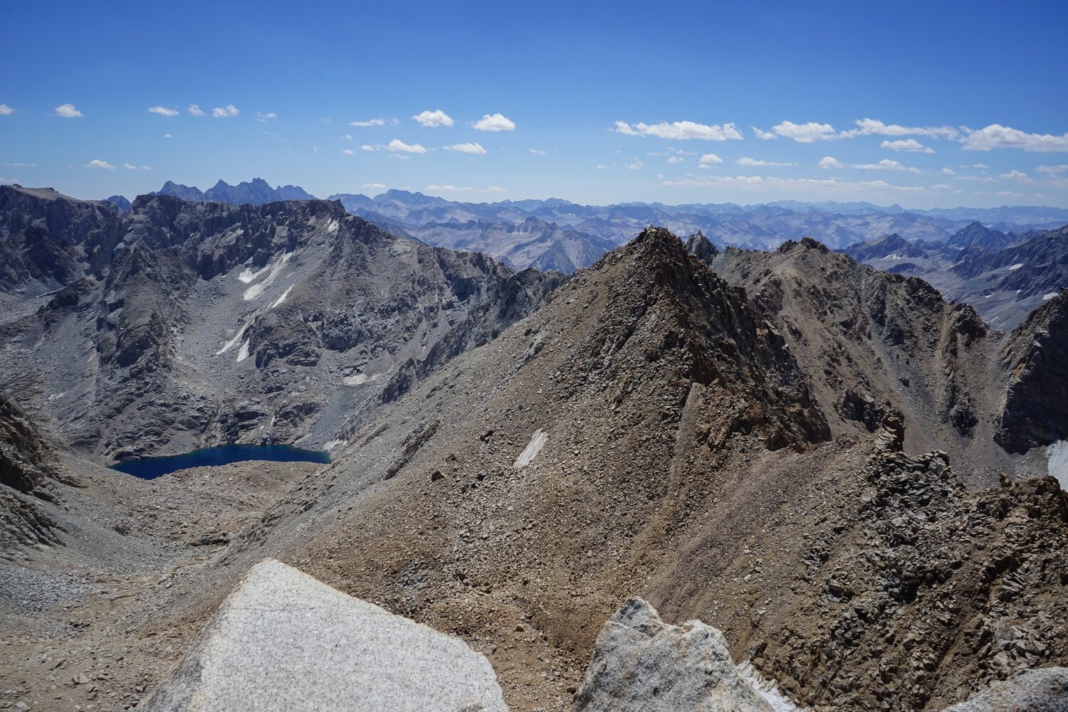 Searching for a way up to the summit rocks of Mount Wallace, and enjoying impressive views of the Evolution Lakes. I tried to stick to the crest, but the way was blocked by difficult rocks, so I had to cut across the east face about 50 vertical feet below the summit and climb up past a couple of chockstones to gain the summit. Here, there were two rocks sitting in a L shape. The summit register was on the lower part, but the vertical part of the L was obviously the summit. It was difficult to climb, though, requiring a foot smear and beached-whale mantle move. But I did it, not content to just be “close enough,” before carefully reversing the move and sitting down to enjoy the view.