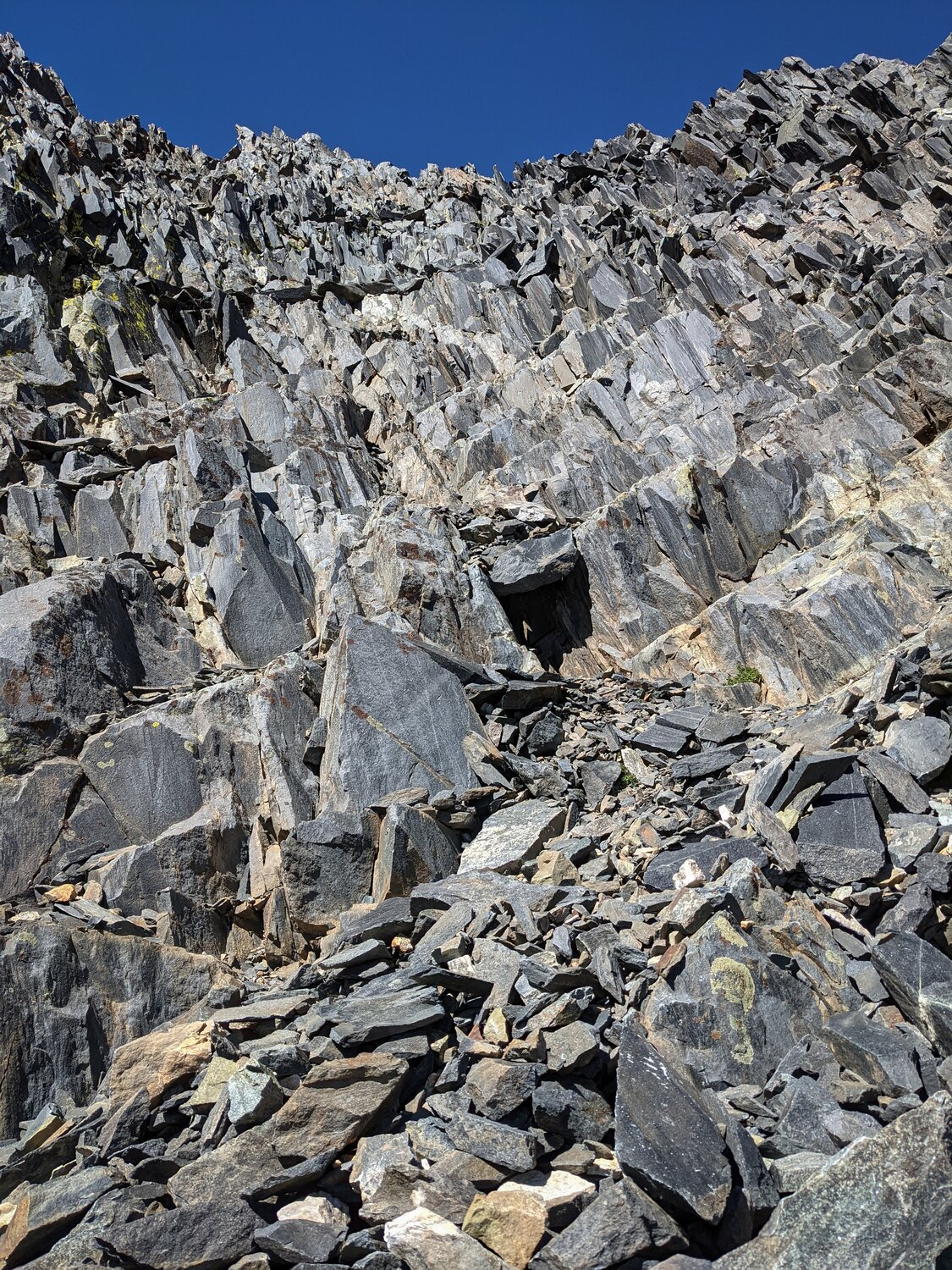 After criss-crossing some small spires along the ridgeline and cutting climber’s left when the going got difficult, this broad chute appeared about 100’ left of the ridgeline. It was steep, but solidly class 3. And while there was loose rock littered everywhere, the rock underneath was solid for the most part. There was 300’ or so of this actually somewhat enjoyable climbing up to the summit.