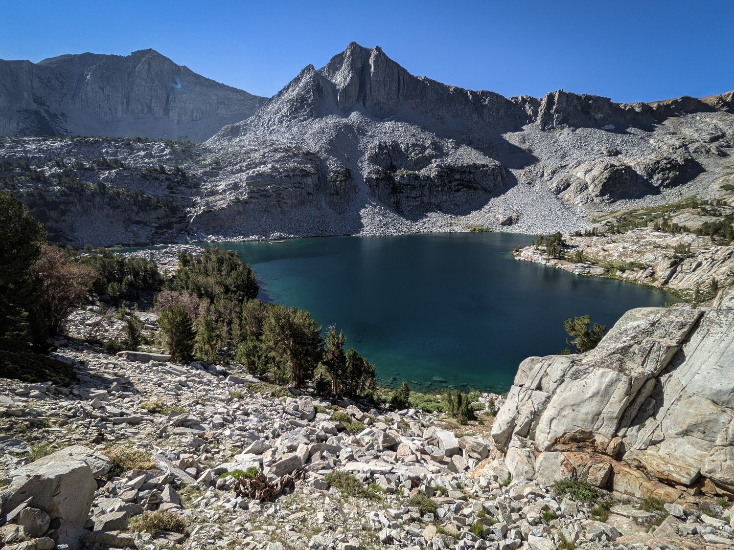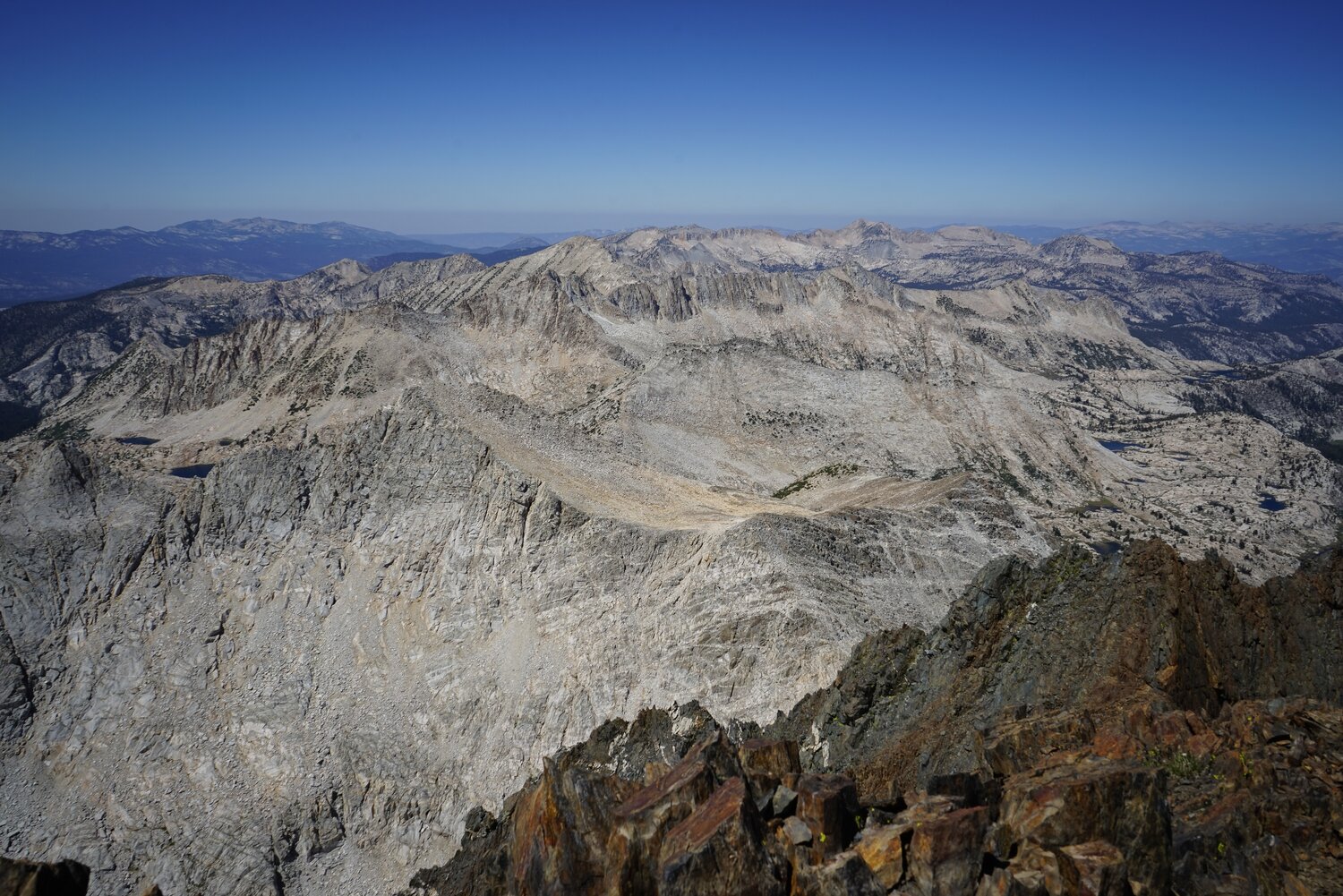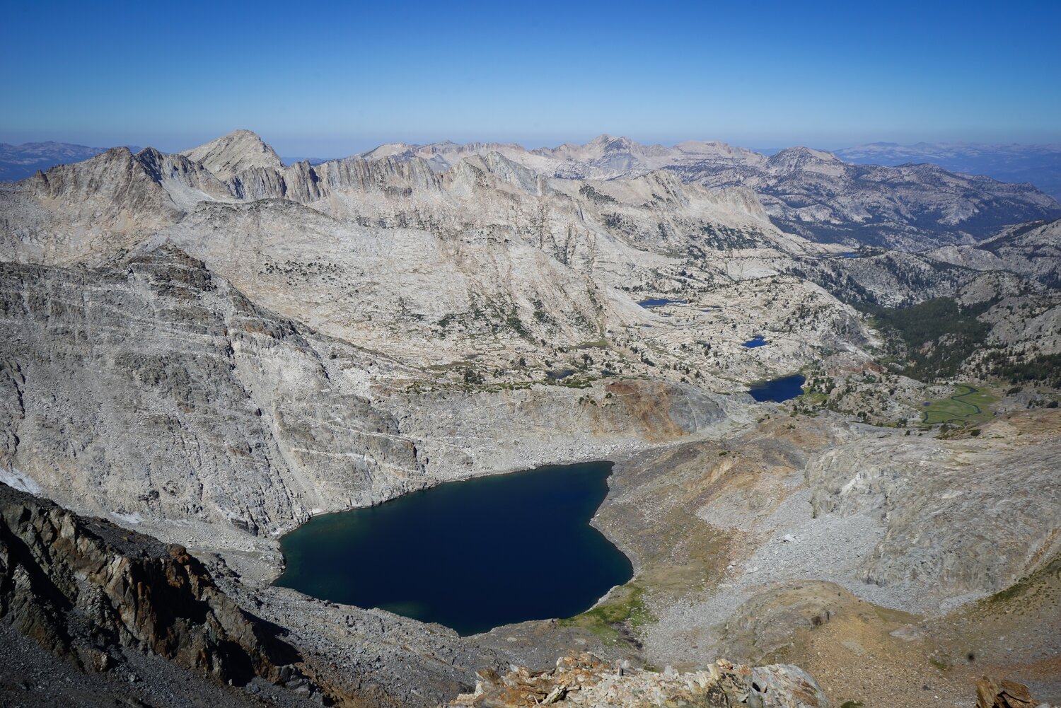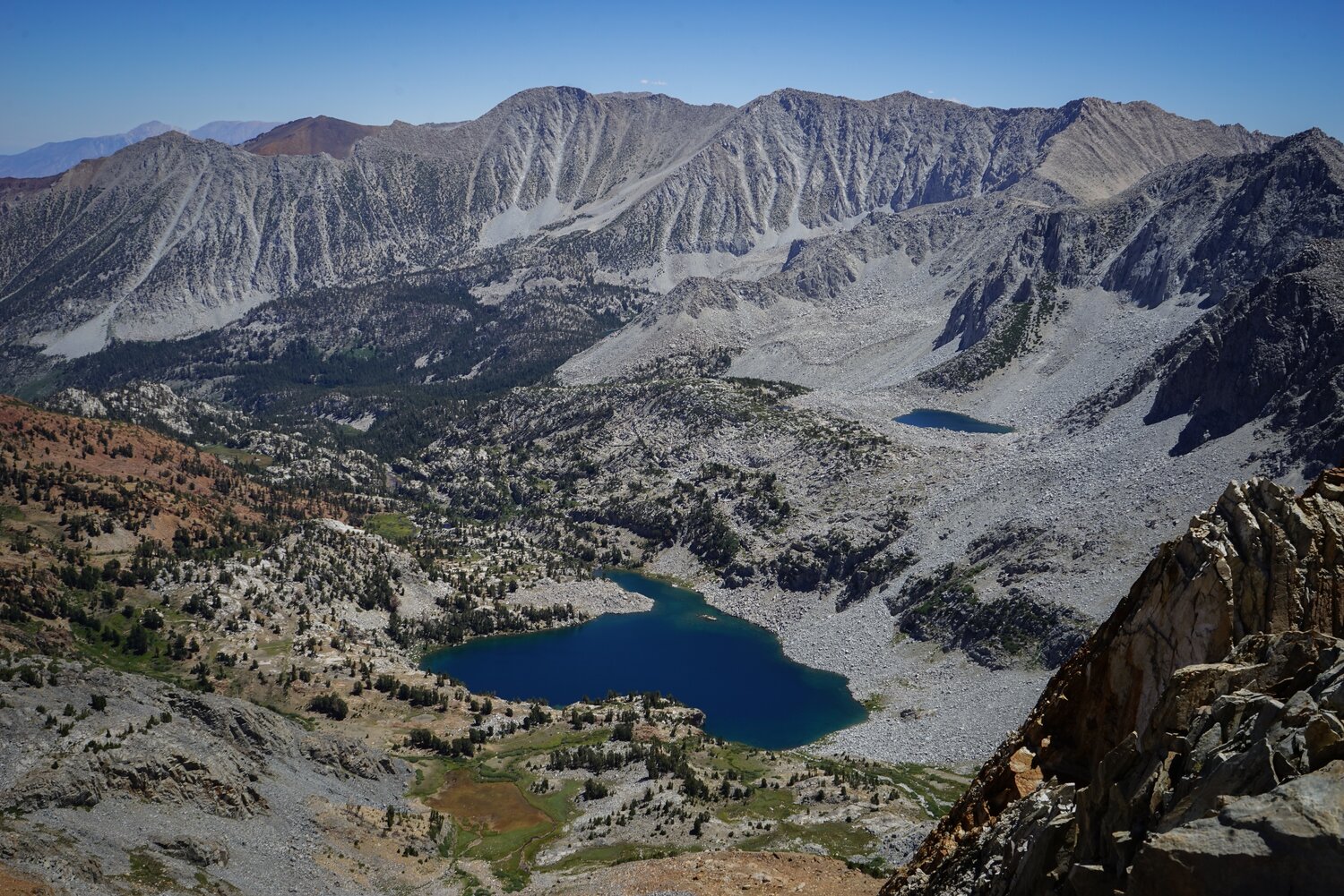 Looking out over Big McGee Lake and Mount Stanford and Mount Morgan. The traverse back across the ridge was a bit trickier than on the way up, sometimes it’s harder to go down things like that, especially if there’s loose rock. But I survived it and after reaching the summit of Peak
