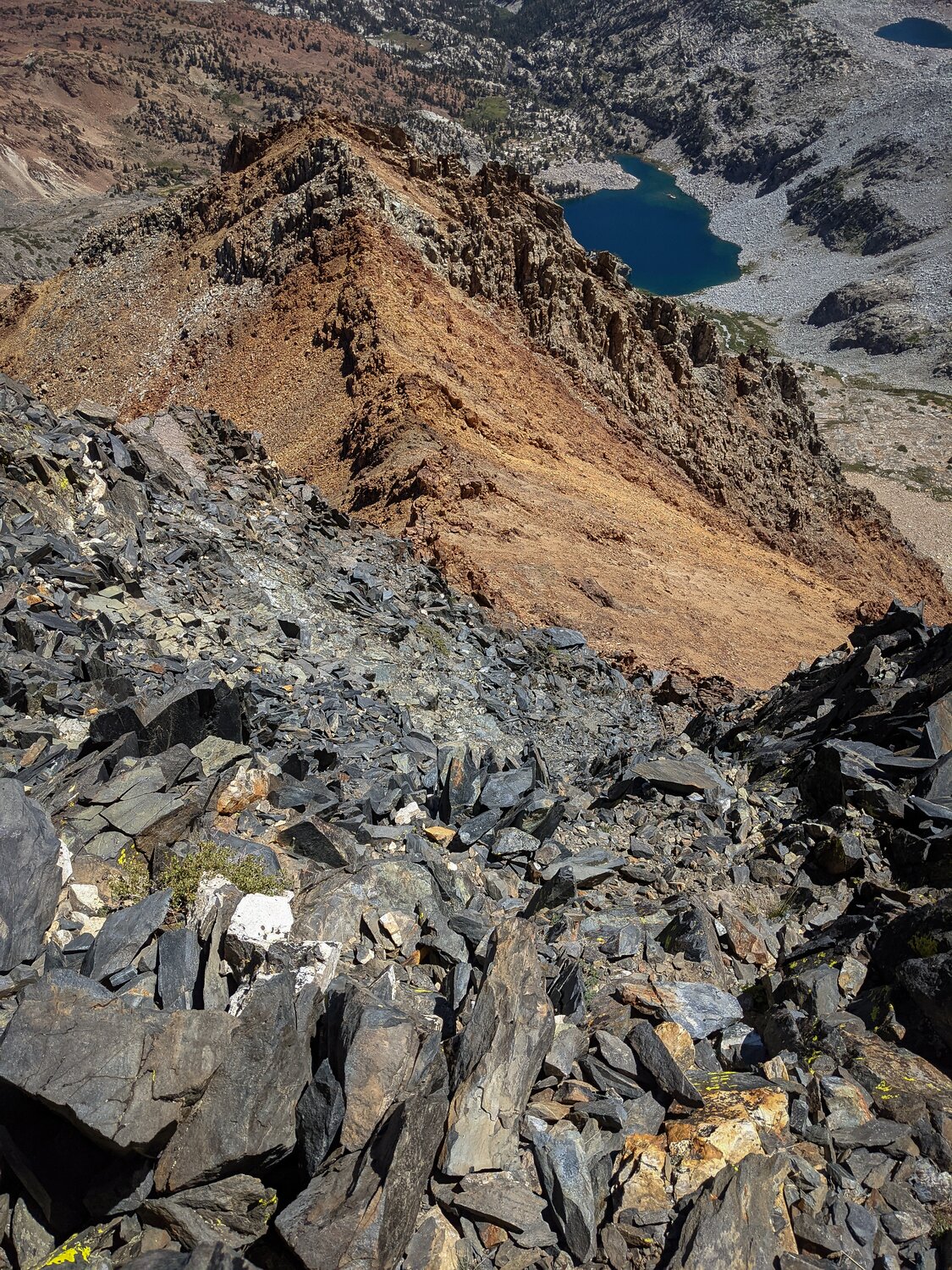 North again towards Red Slate Mountain. You can see the McGee Pass Trail climbing up in the last photo. I signed into the summit register, which was only a couple of months old, and heade back down the gully just south of the ridgeline.