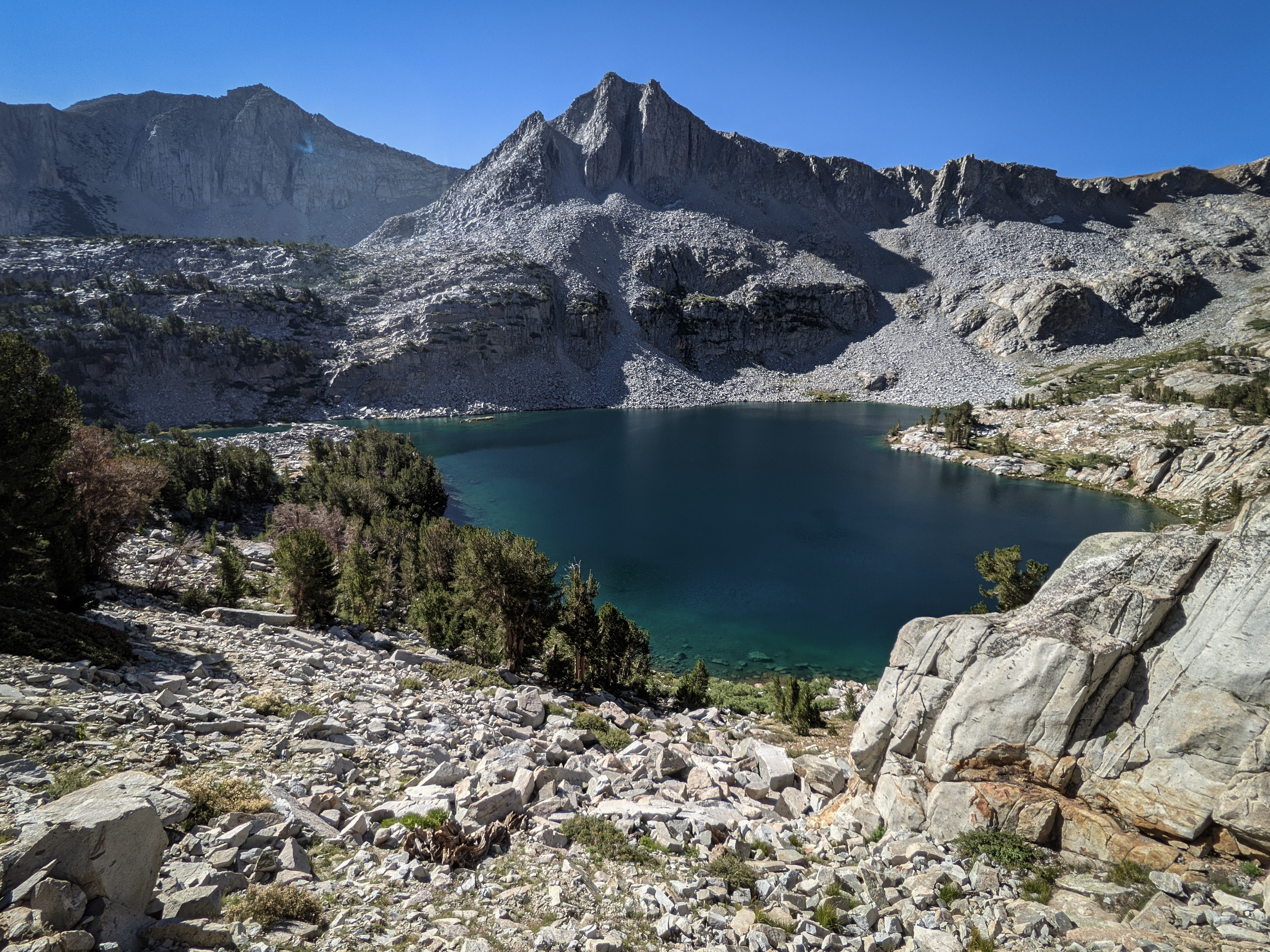 One more shot of the peak from the trail. I soon reached Little McGee Lake, had a snack, and set out across the lake’s outlet and straight up the east slope of Peak 12360. There was a bit of challenging climbing in the lower, steeper part of the peak, but for the most part it was easy to reach the crest here.
