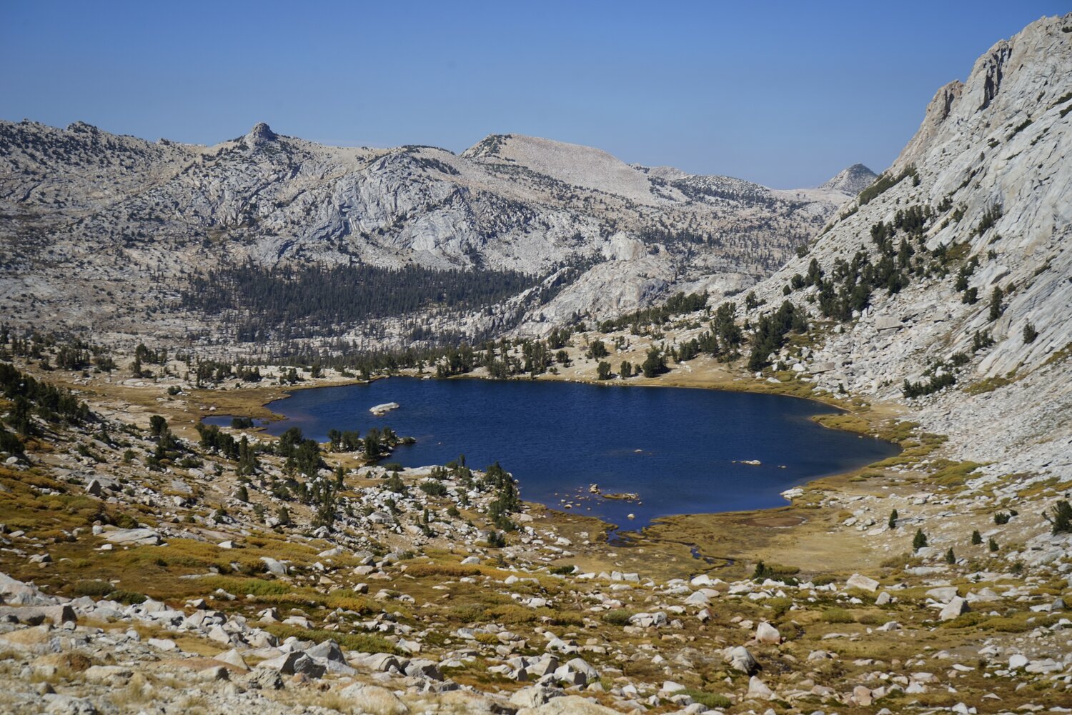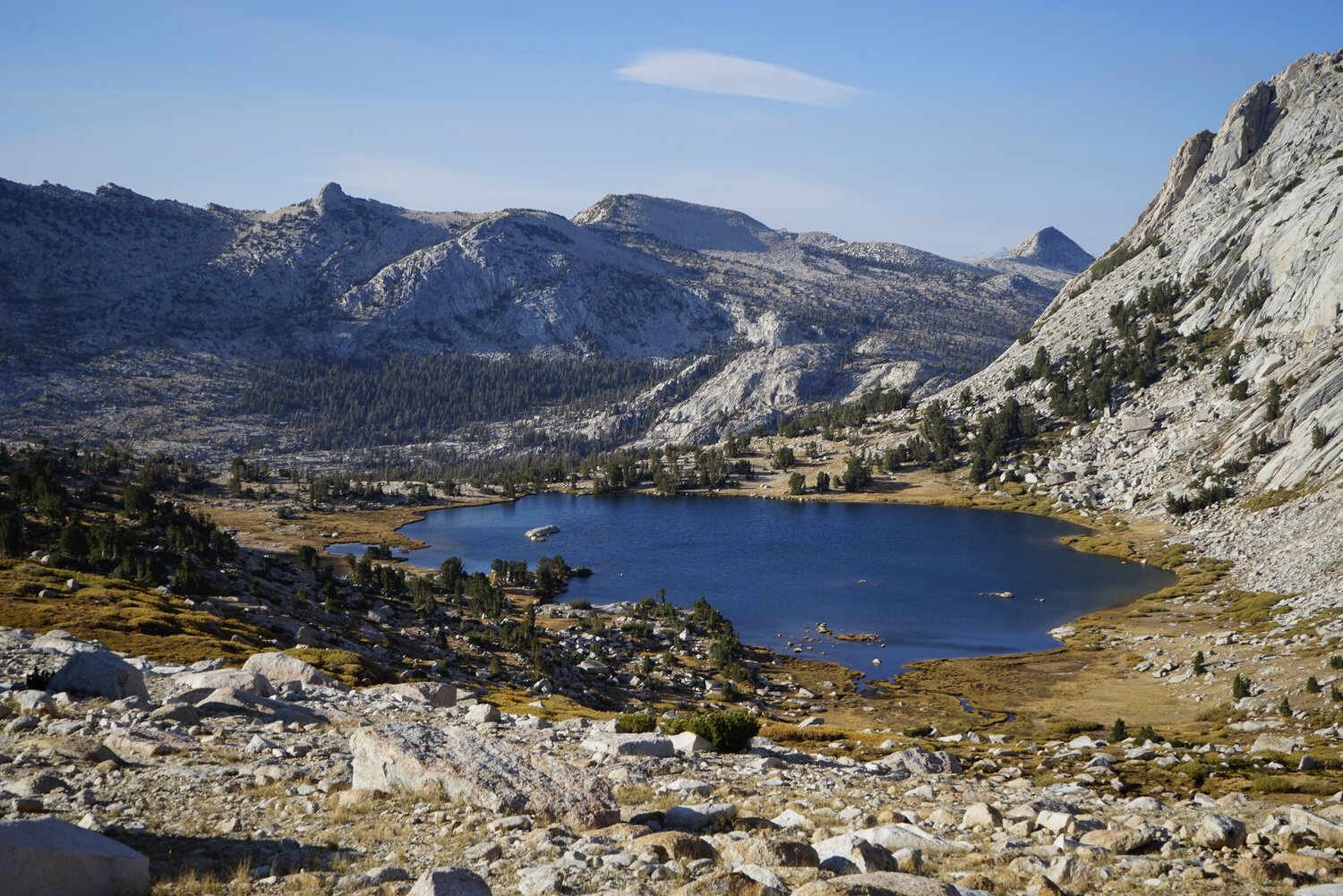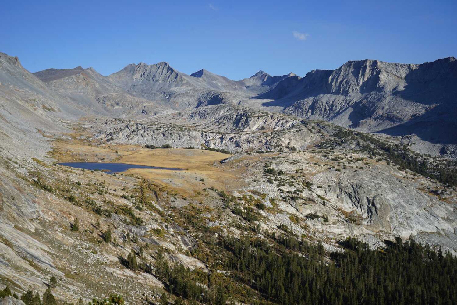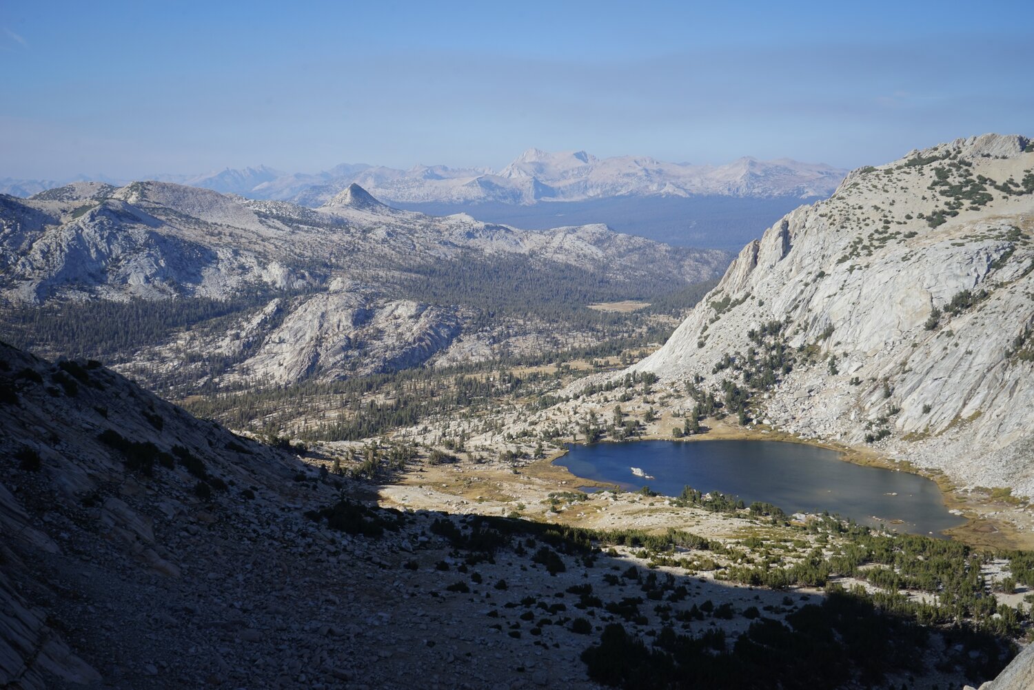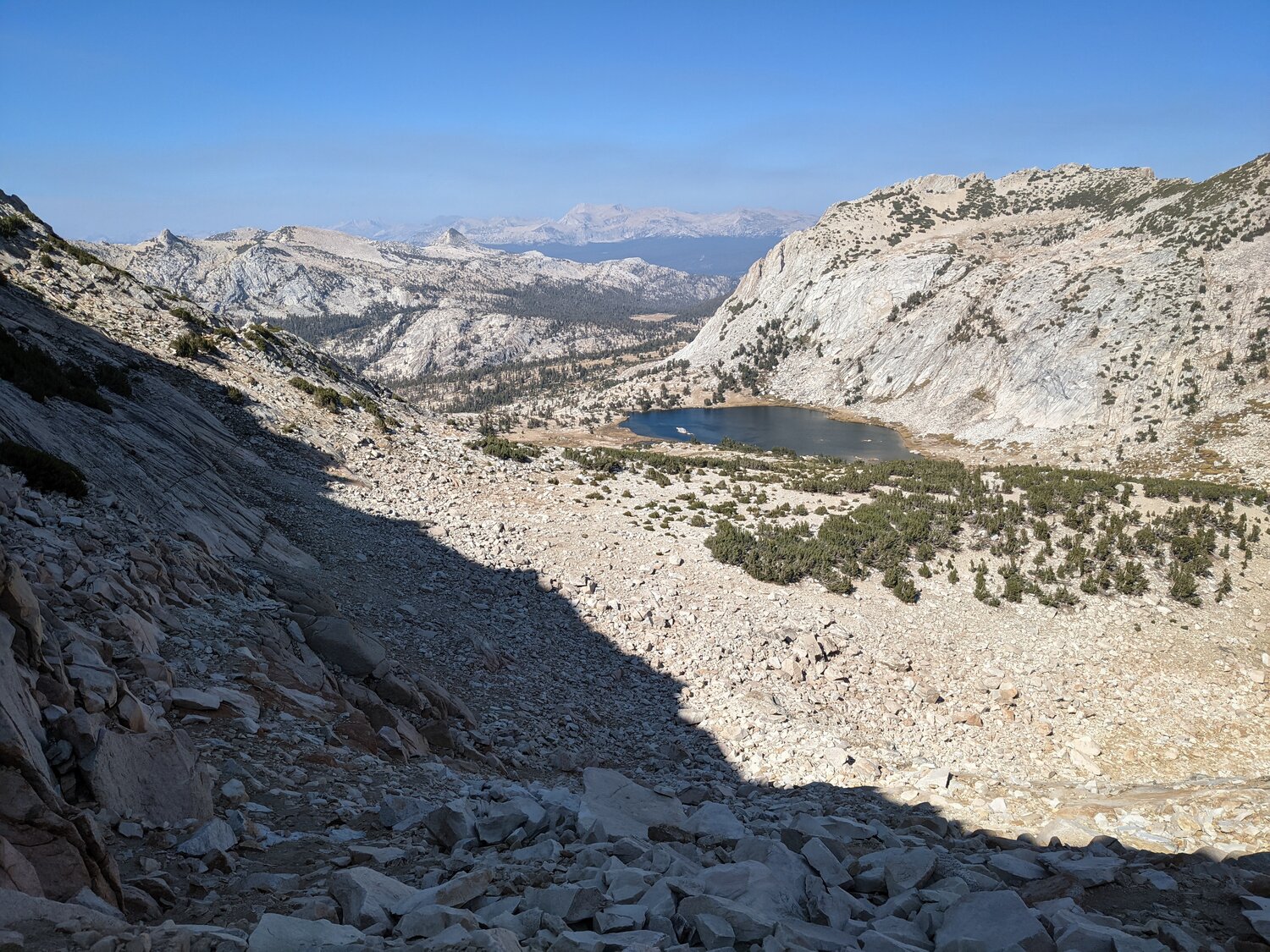 Looking north over Vogelsang Lake from the slope of Vogelsang Peak before dropping into the gully.
