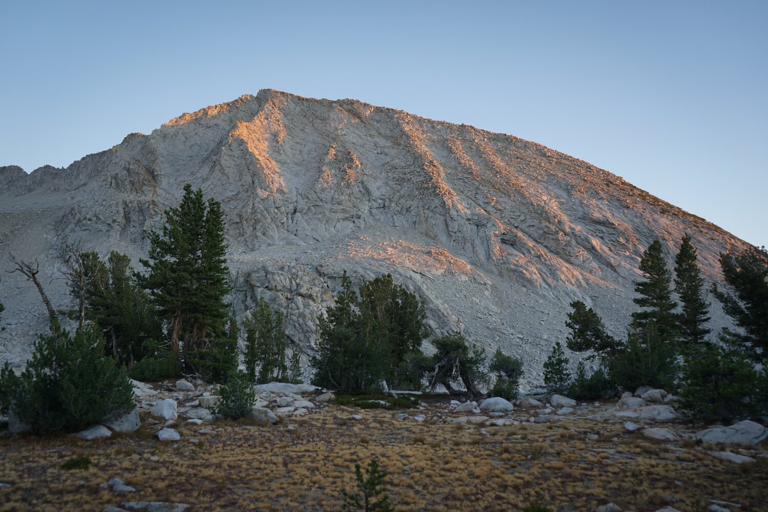 We hiked up the Lewis Creek Trail for a few hours, finding it somewhat more scenic than the Cathedral Fork Trail. There were occasional views of Mount Clark to our southwest and the trail passed through lovely sections of forest. When we reached the junction where the trail splits between Bernice Lake and Vogelsang Pass, we stashed our things in the woods. We thought we’d head up to climb Vogelsang Peak from Vogelsang Pass and then come back down and hike up to Bernice Lake and camp there.