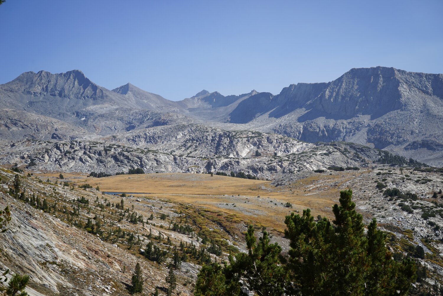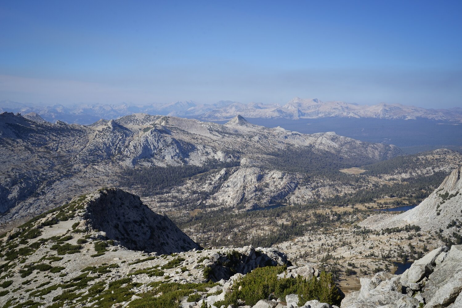 Southeast towards Bernice Lake and Mount Maclure. There was no summit register on Vogelsang Peak. But there was faint cell phone reception, so we downloaded a fresh forecast from the National Weather Service. It called for the cold front to arrive this afternoon, which we could already feel and see in the air, and then for temperatures to plummet into the mid-teens for the next couple of nights, much colder than we expected, before a gradual return to the previous day’s conditions by the weekend. That all seemed to line up with our expectation that the smoke would clear and it would get very cold for a couple of days, but we expected that the smoke would make a gradual return by the end of our trip. So, we figured we’d go ahead with our plan.