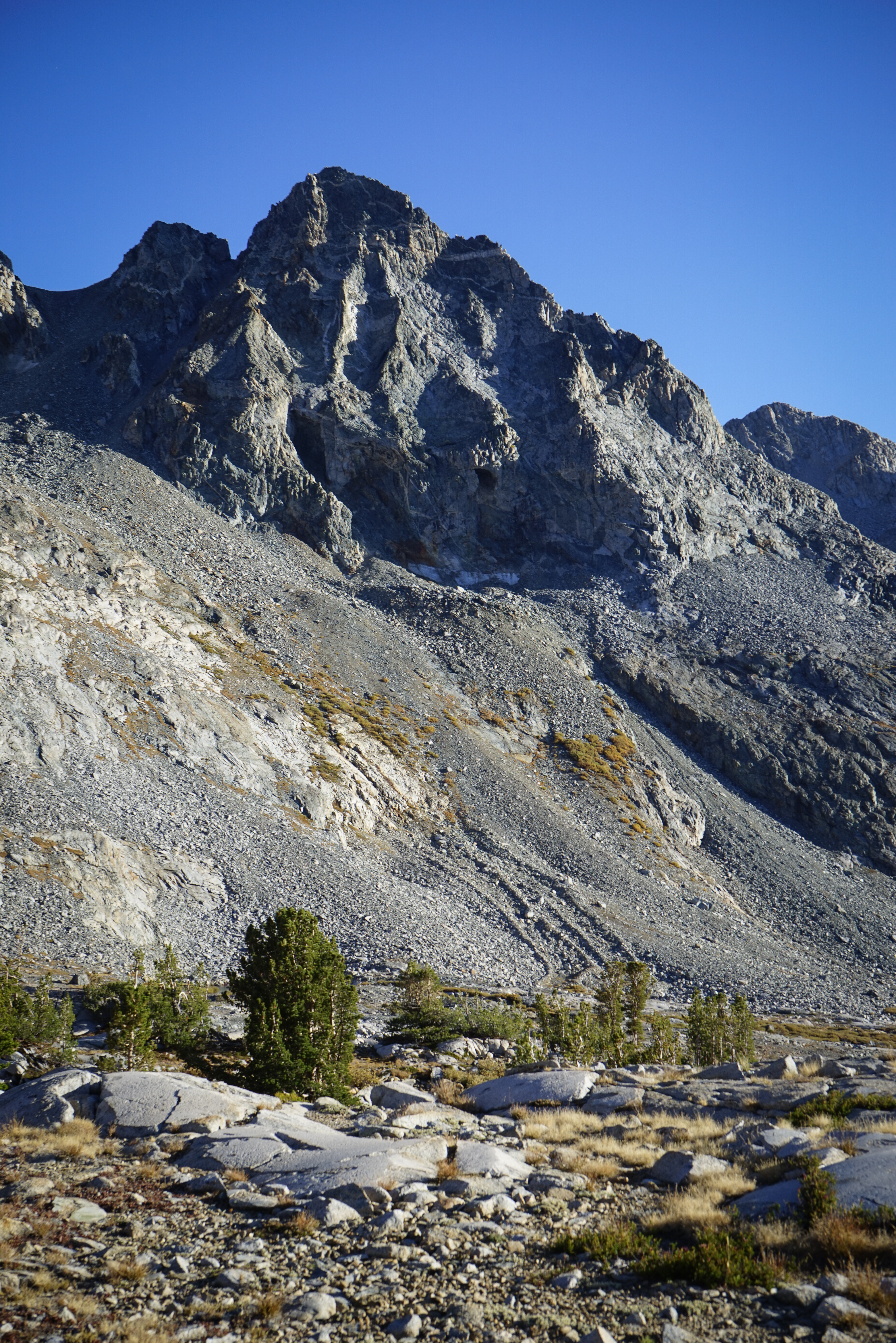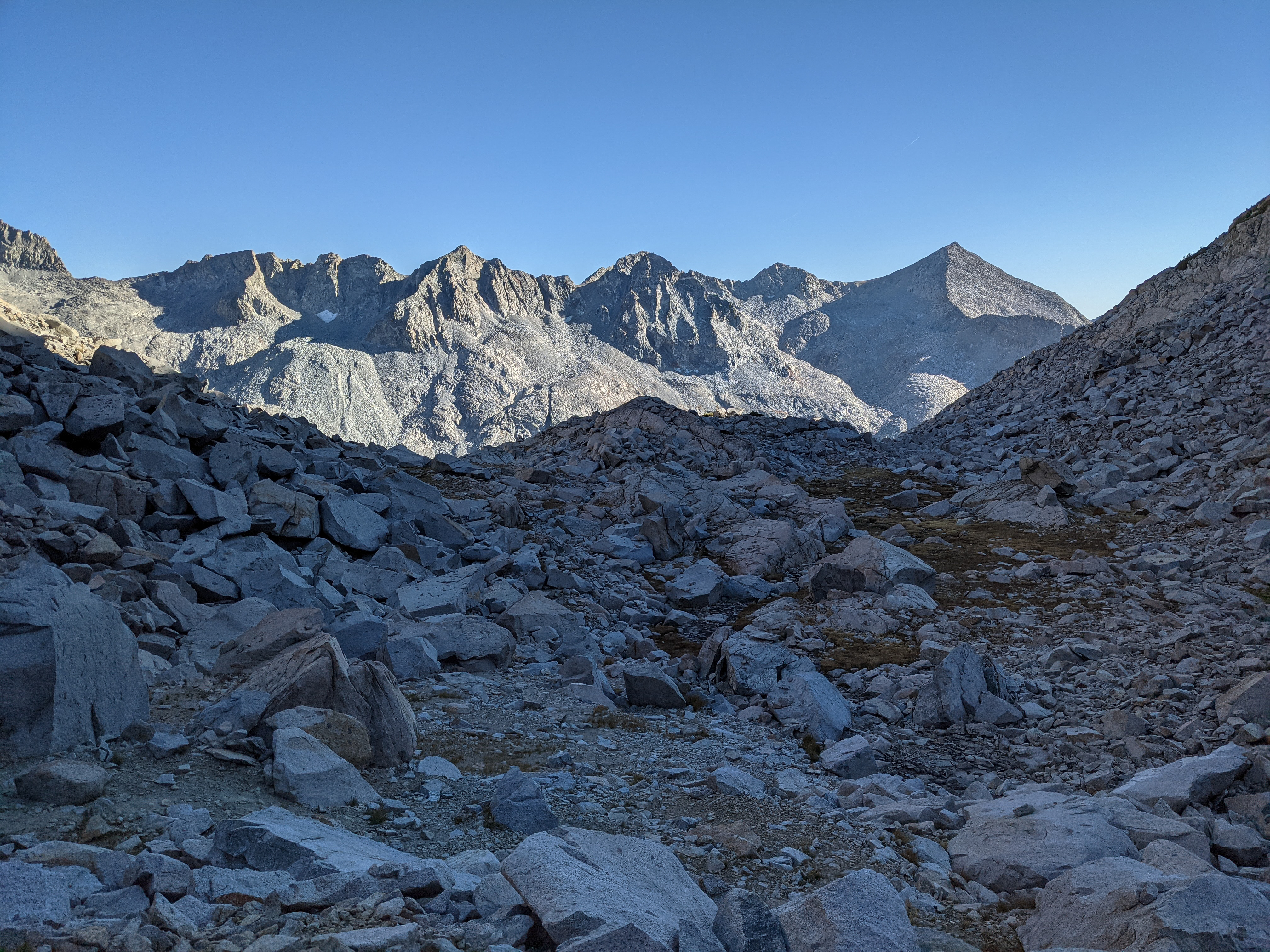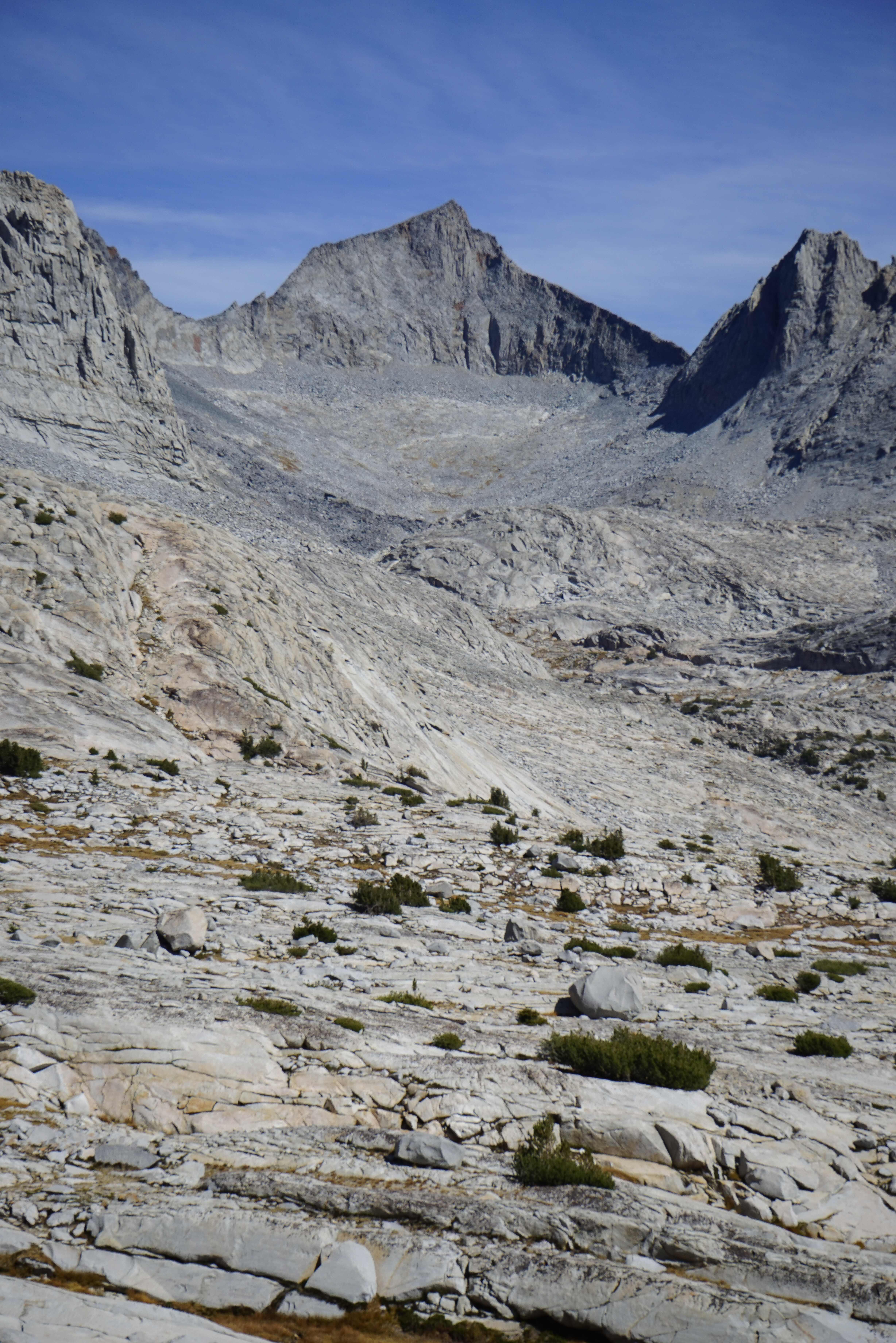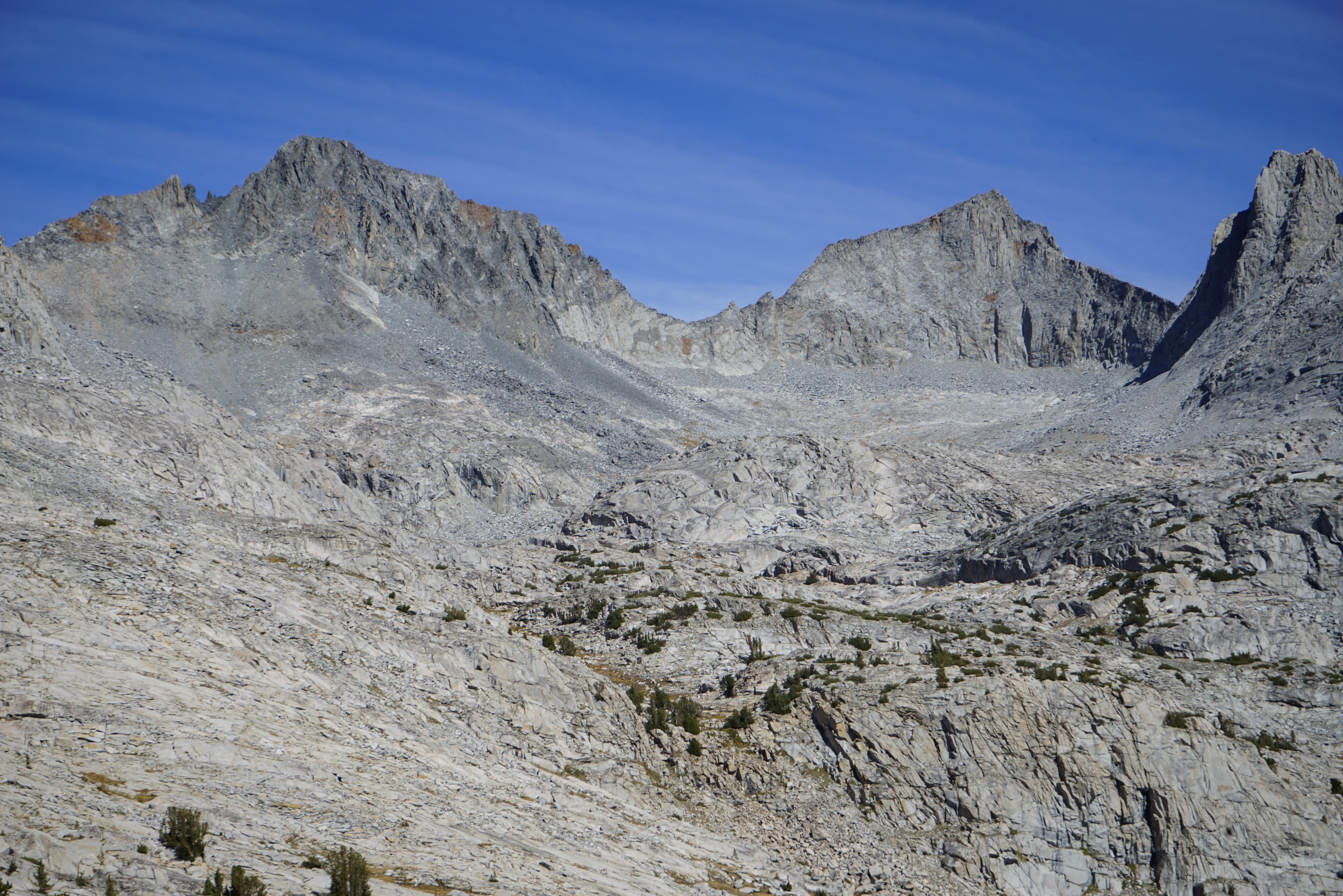 Peak 12358 from the easier terrain on the lower part of Sluggo Pass. Sluggo Pass was easy, except for our tired legs, and much as I remembered it from the Yosemite High Route. There isn’t much uninterrupted talus on the north part of the pass and we made good time climbing to the pass.