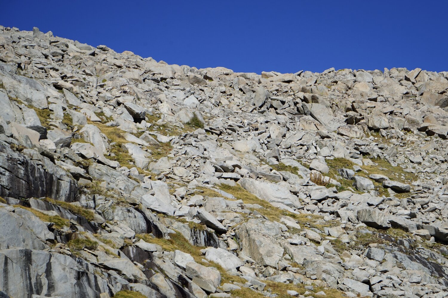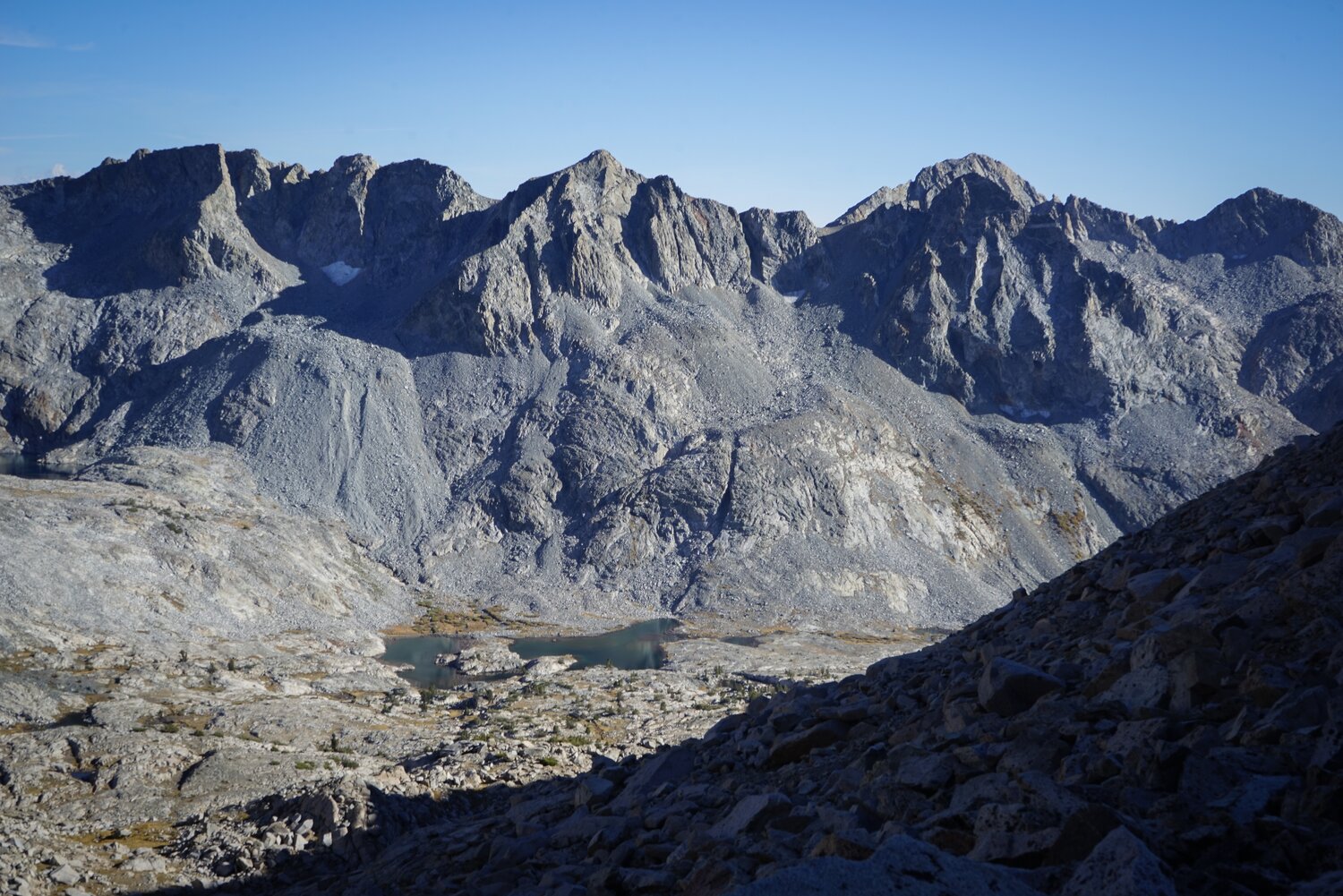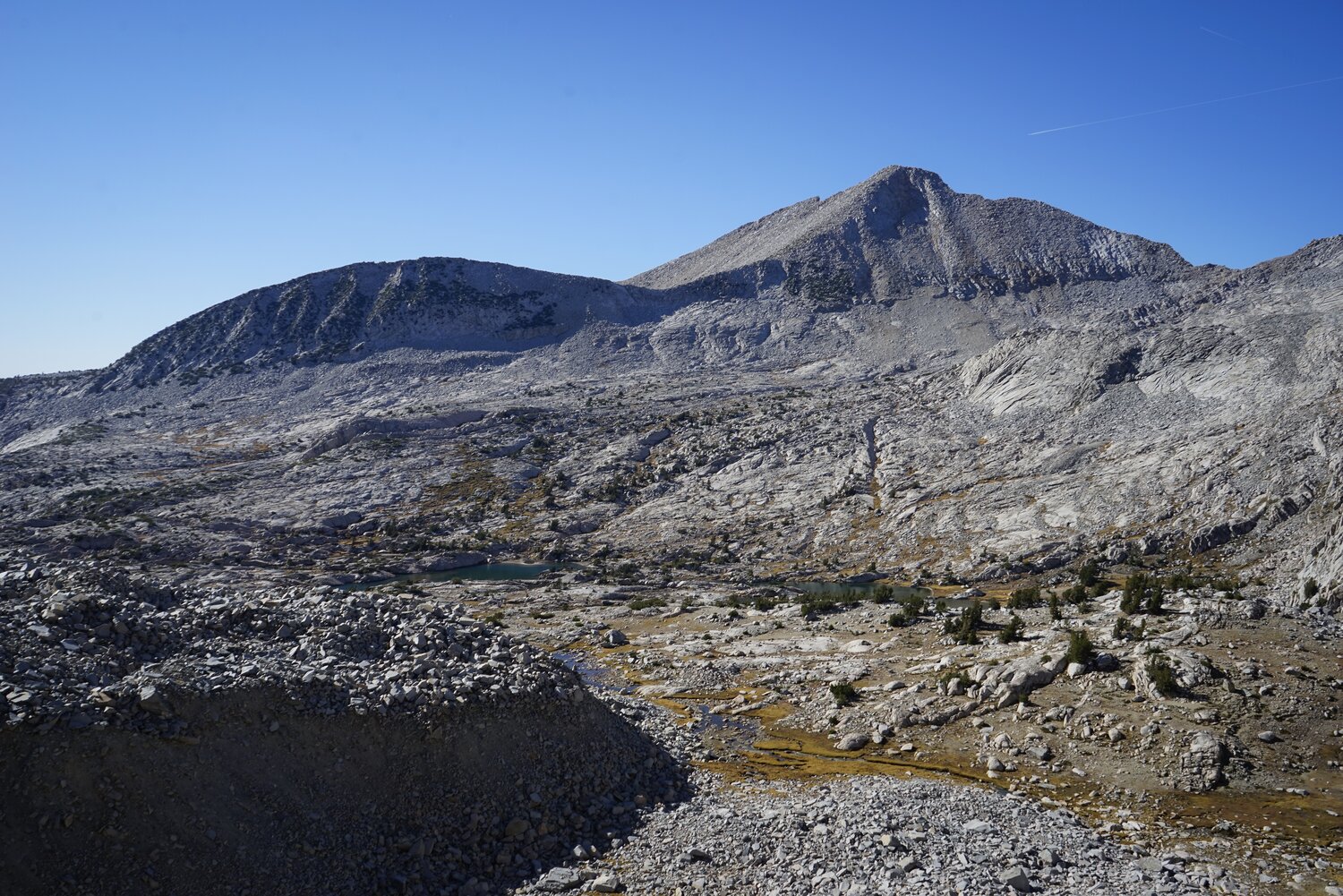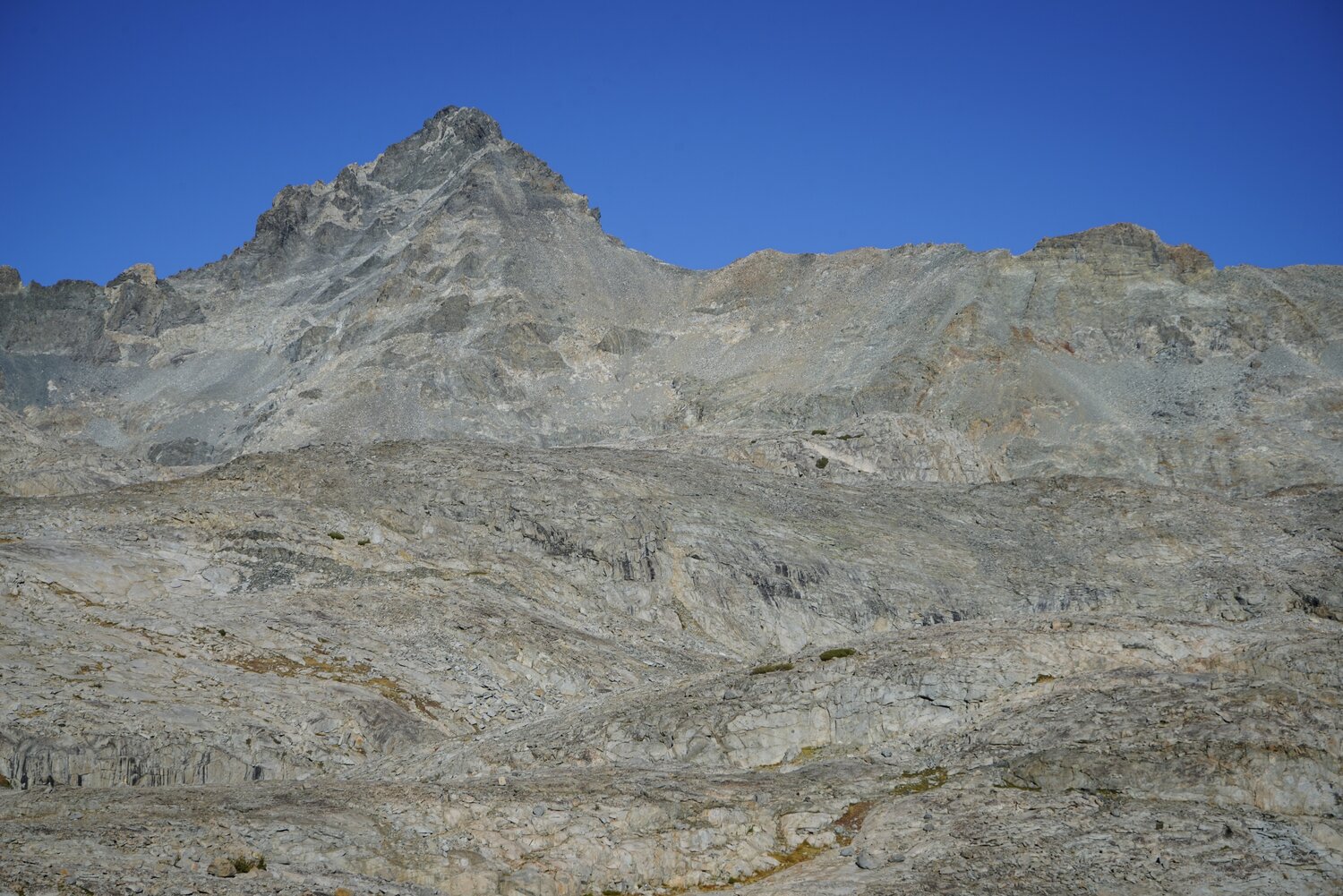 Peak 12358 from the easier terrain on the lower part of Sluggo Pass. Sluggo Pass was easy, except for our tired legs, and much as I remembered it from the Yosemite High Route. There isn’t much uninterrupted talus on the north part of the pass and we made good time climbing to the pass.