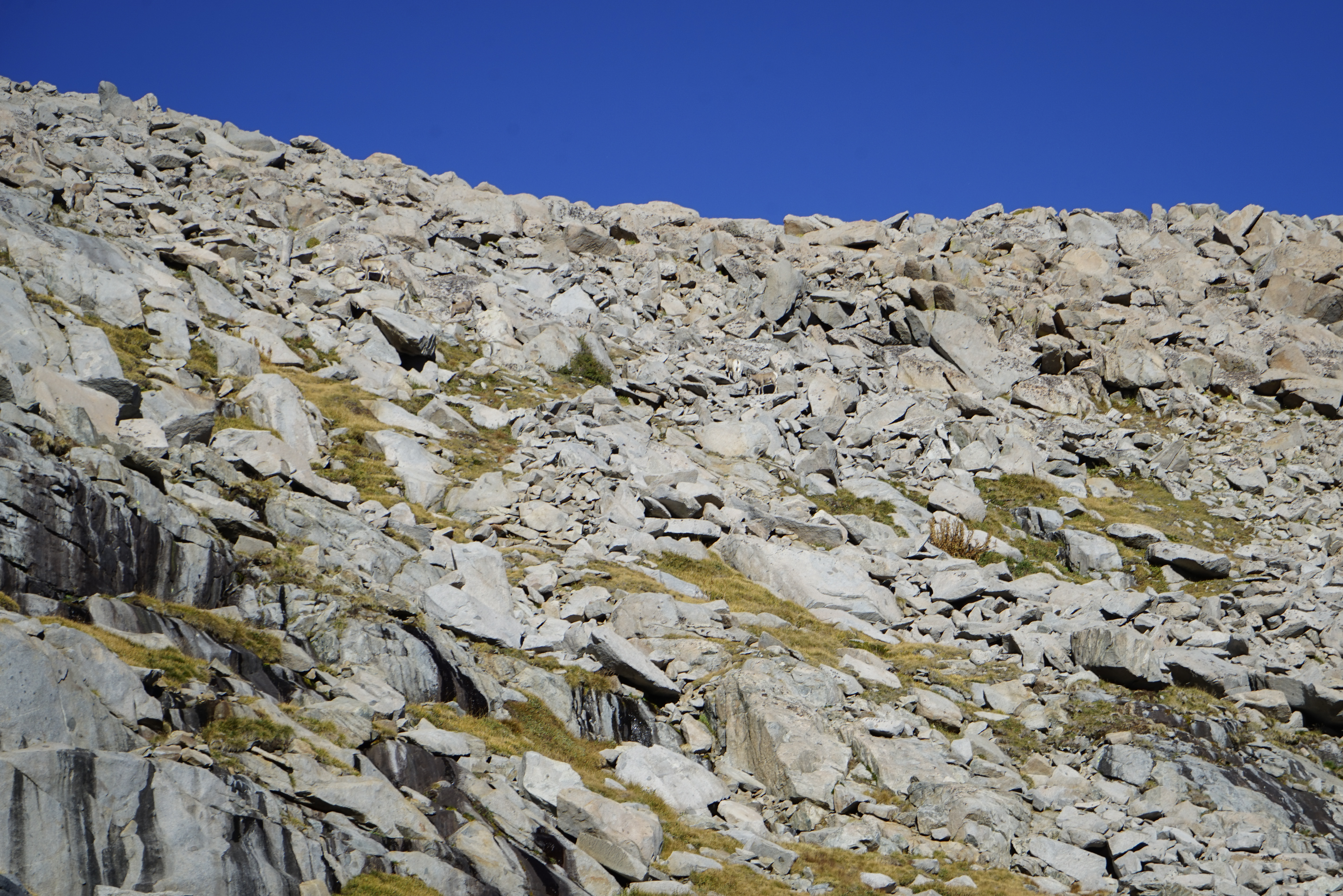 Near the top of the pass we noticed a herd of bighorn sheep in the rocks to our left. They were pretty hard to spot, but once we did we saw more and more of them. We counted about a dozen in all, there are at least six in this photo. A special treat for sure!
