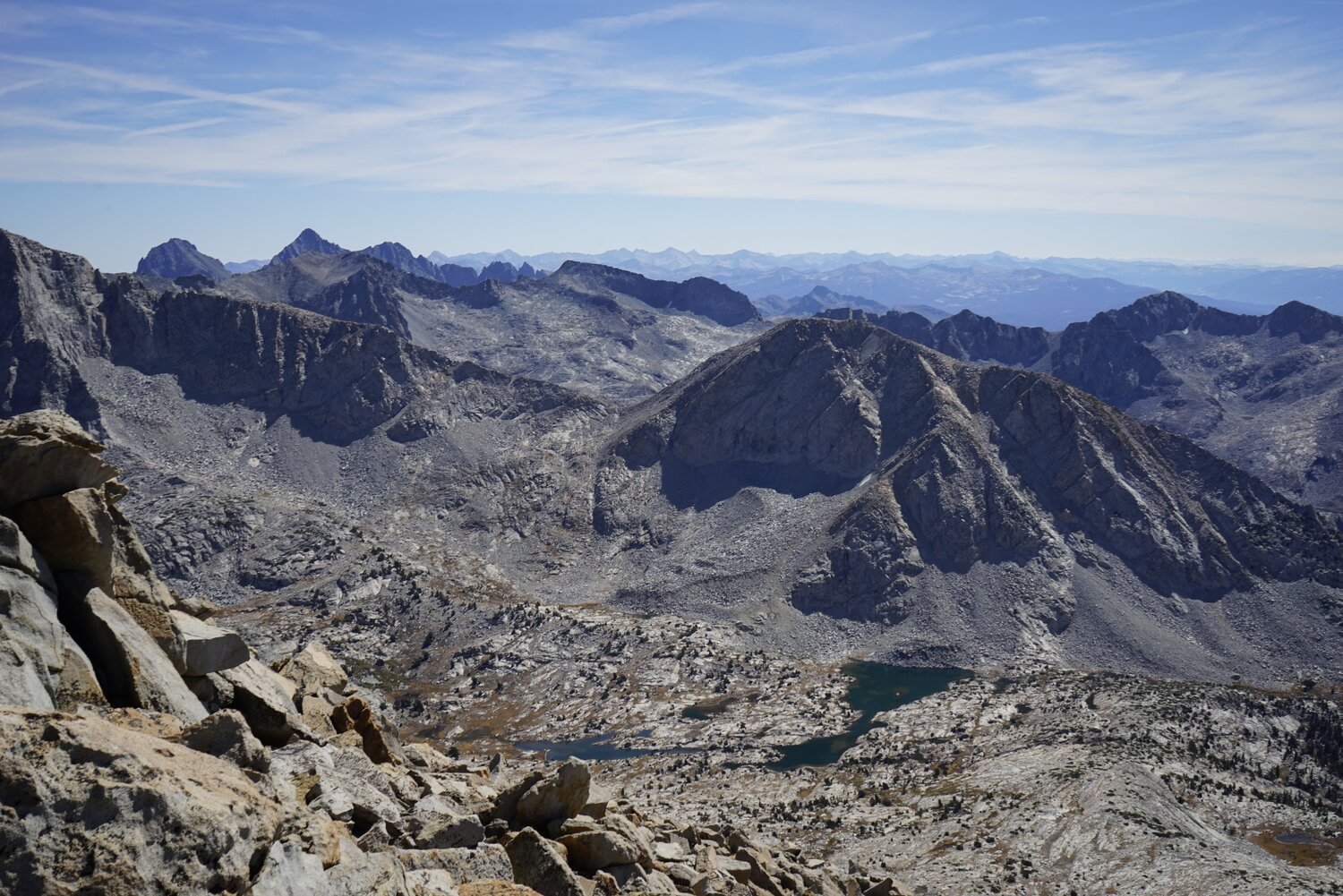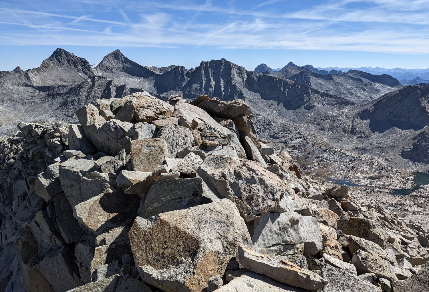 Some more difficult to distinguish peaks to the north. Mount Conness is visible, as is Matterhorn Peak, and some of the red-tinted peaks to the southeast of those.